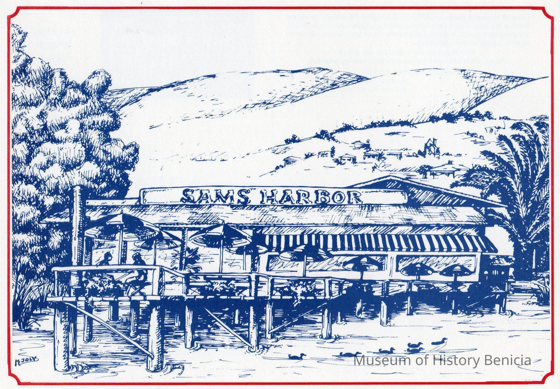 'Sam's Harbor' Post Card. Blue sketched with red border. 1 of 3.