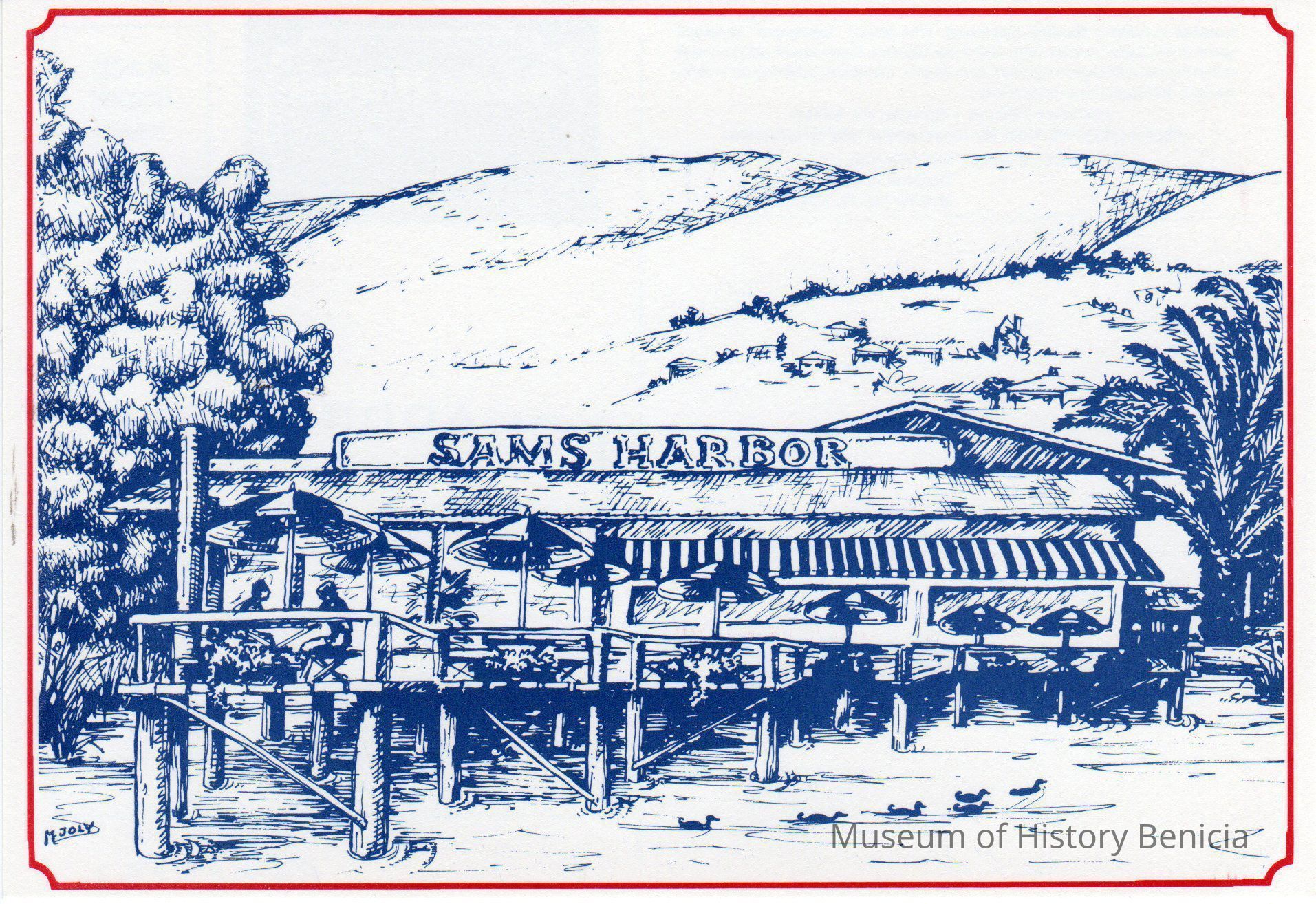 'Sam's Harbor' Post Card. Blue sketched with red border. (2 of 3)