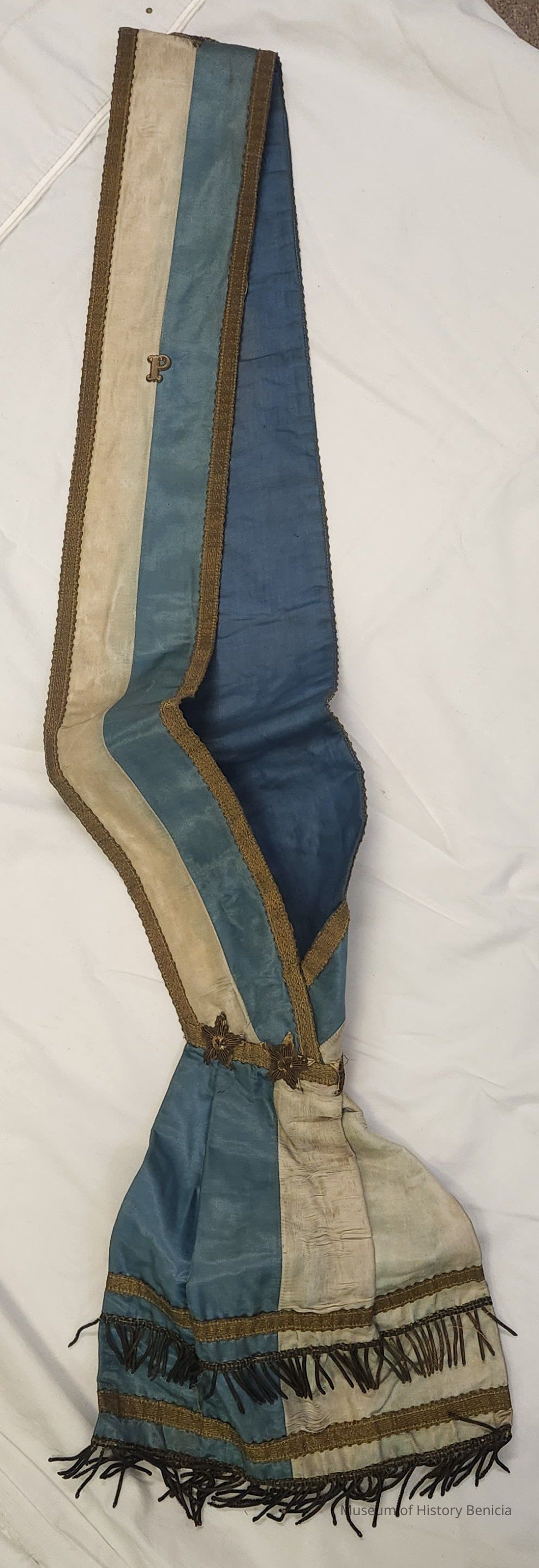 Sash/Regalia - blue and white polished cotton-like fabric with gold metallic edge tape and fringe; the lining is a dull blue linen-like fabric; there are four needlework stars with sequins around the edges, three in the area where the sash rests on the wearer's hip and one at the outside top of the sash (neck area); the sash is worn from the right shoulder to the left hip; there is a plastic "P" on the front; strip is 56" long and meets a bottom piece which is 11" long, the width is 10" at the widest spot and 4" at the narrowest spot; the label on the inside at the neck area reads: