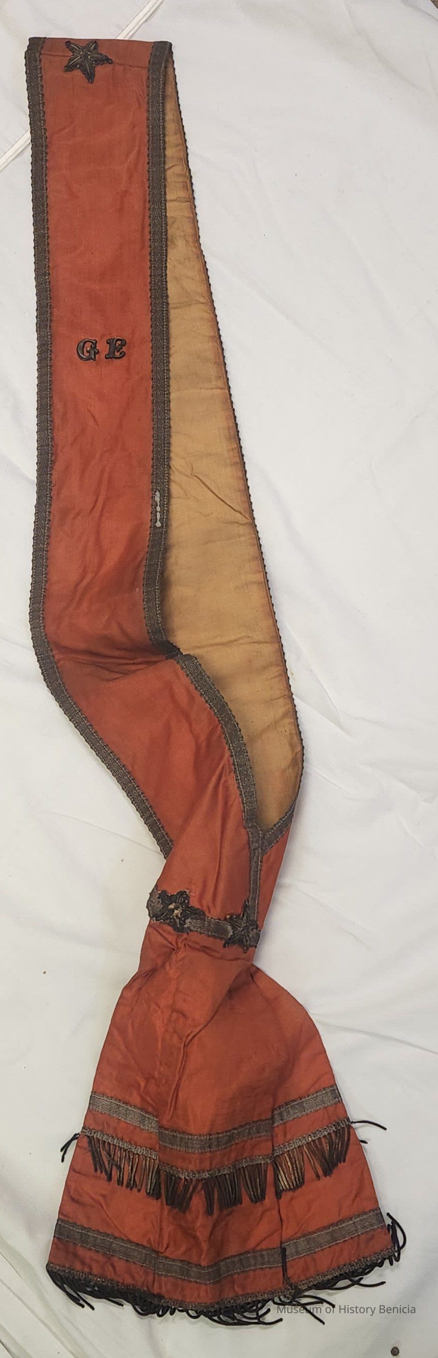 Sash/Regalia - orange polished cotton-like fabric with brown metallic edge tape and fringe; the lining is a dull gold linen-like fabric; there are four needlework stars with sequins around the edges, three in the area where the sash rests on the wearer's hip and one at the outside top of the sash (neck area); the sash is worn from the right shoulder to the left hip; there is a plastic "S" on the front; strip is 56" long and meets a bottom piece which is 10" long, the width is 10" at the widest spot and 4" at the narrowest spot; the label on the inside at the neck area reads: