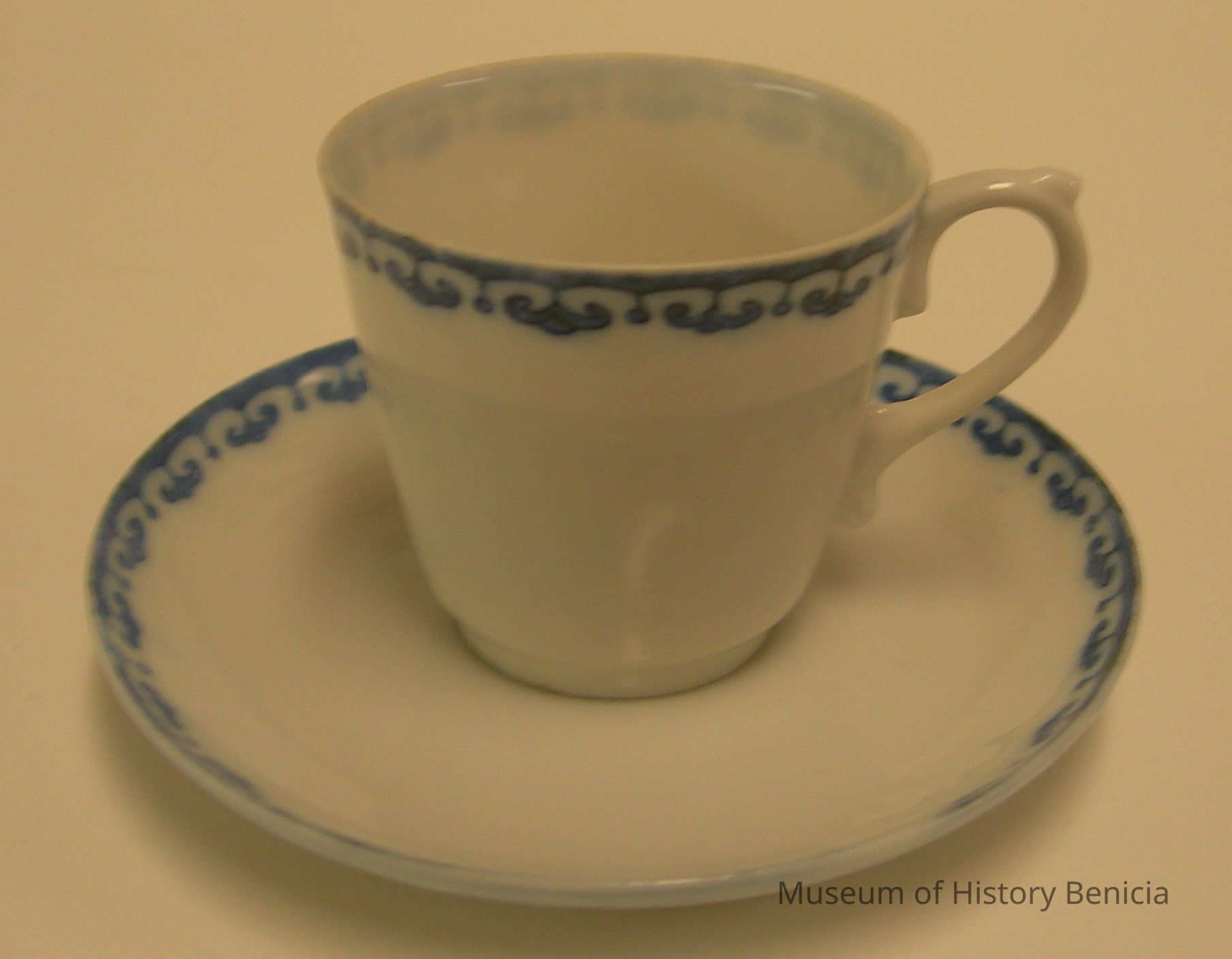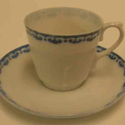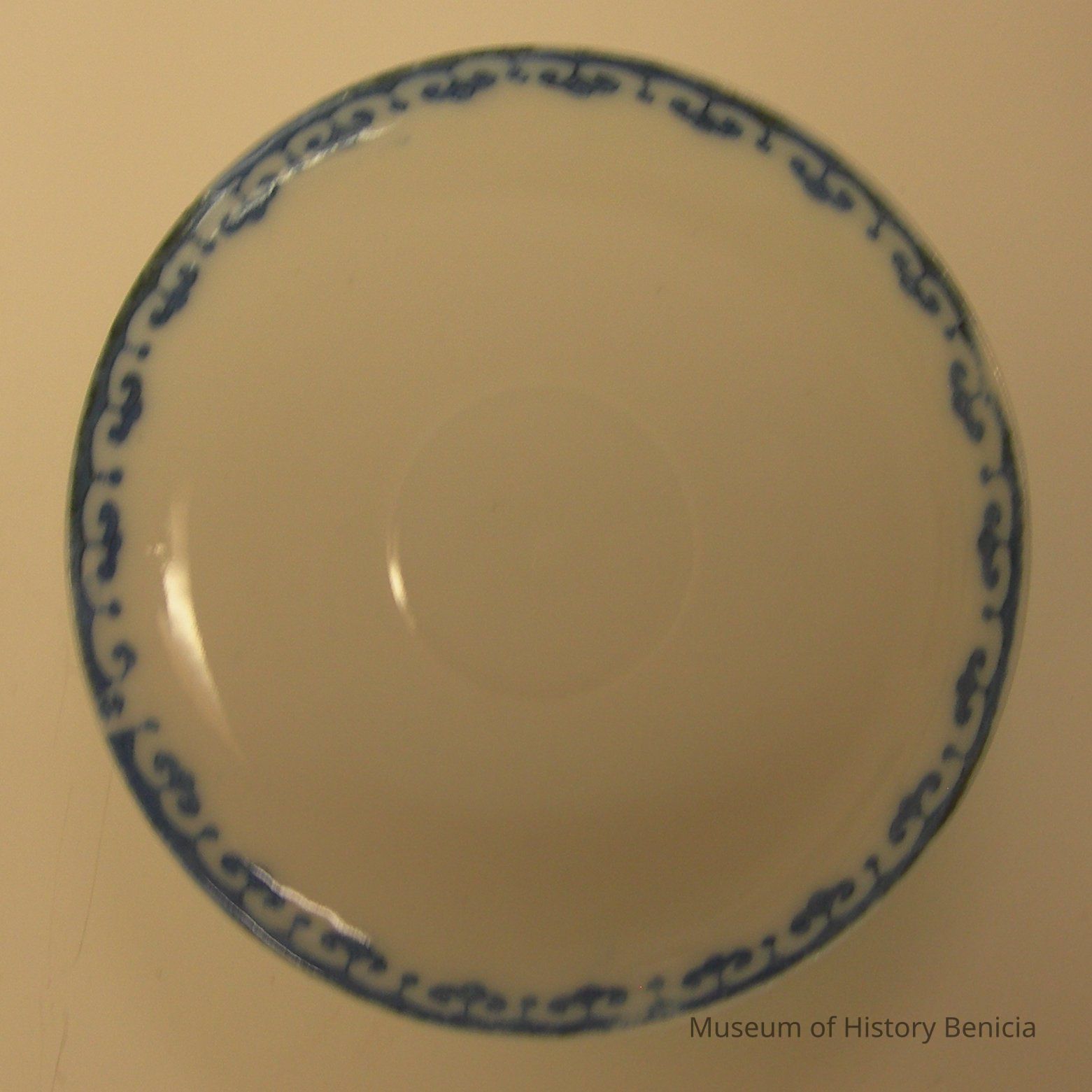China saucer with no markings on the bottom; white with blue motif on edge size: 4-1/2" diameter x 3/4" high
