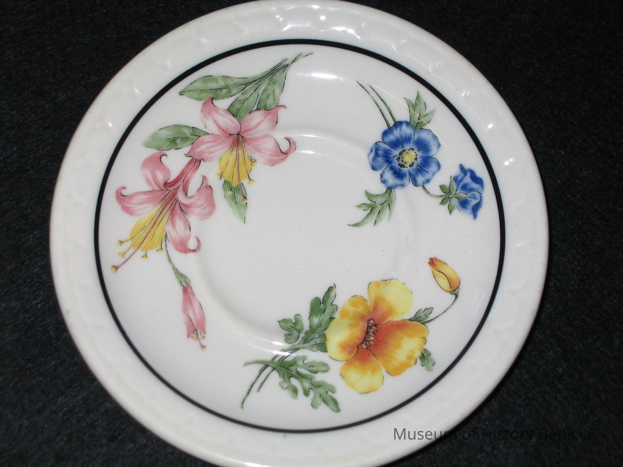 China saucer with California Poppy, blue flowers, and pink flowers. This pattern was used in the dining cars of the Southern Pacific Railroad.