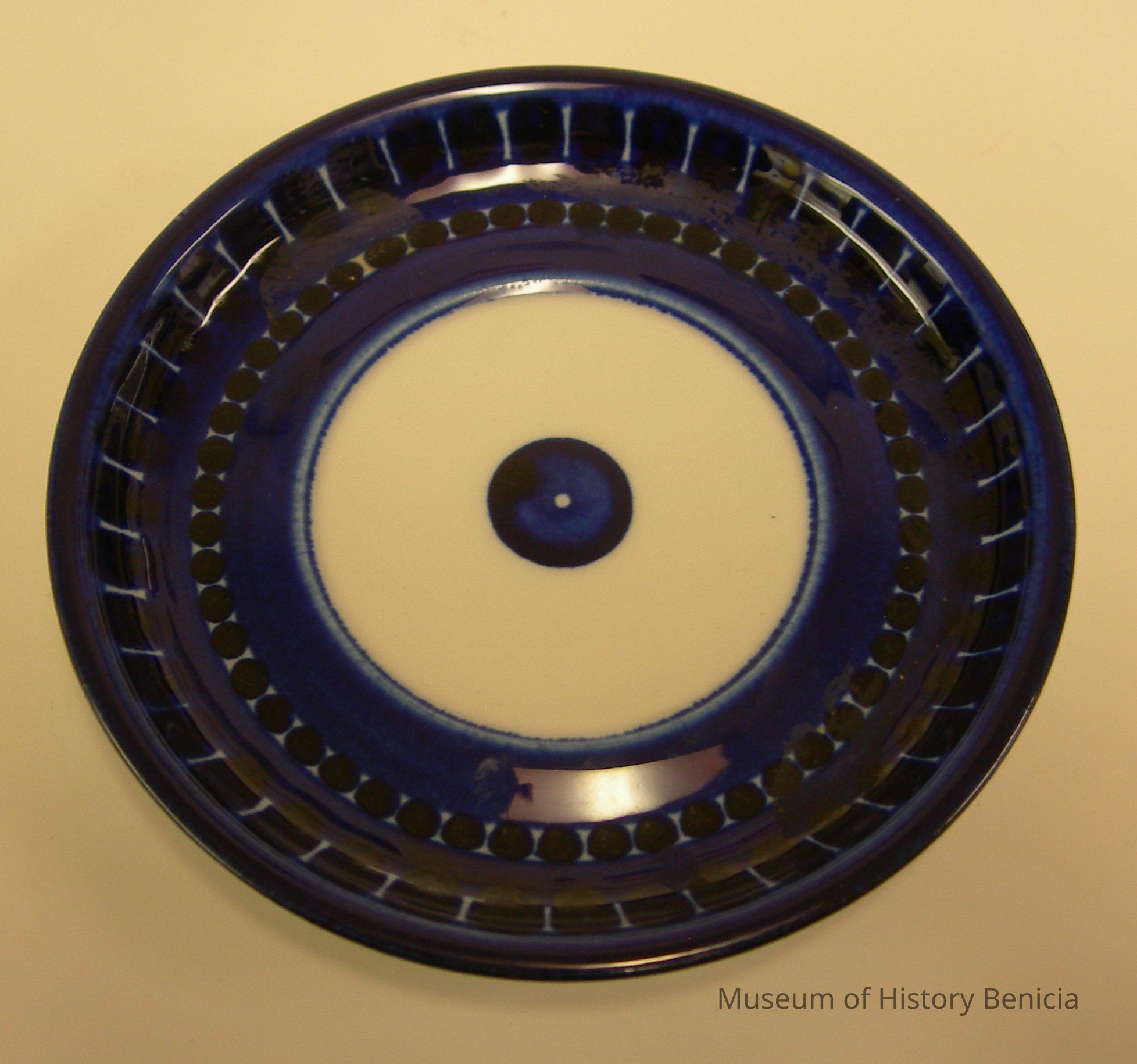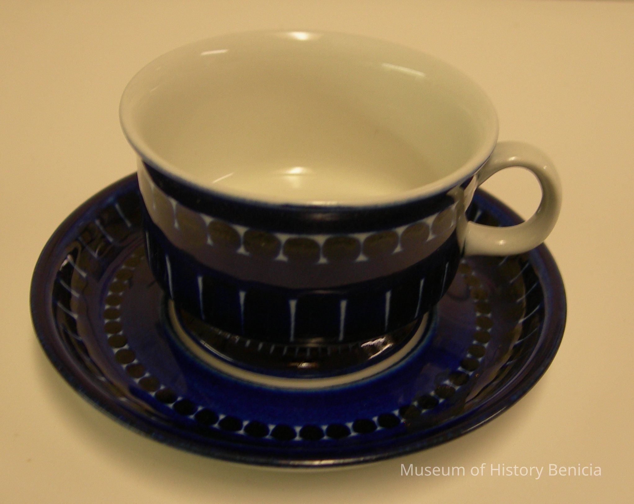 the saucer is in a deep cobalt color with a white ring around the center blue dot and in a modern Scandanavian design with white accents