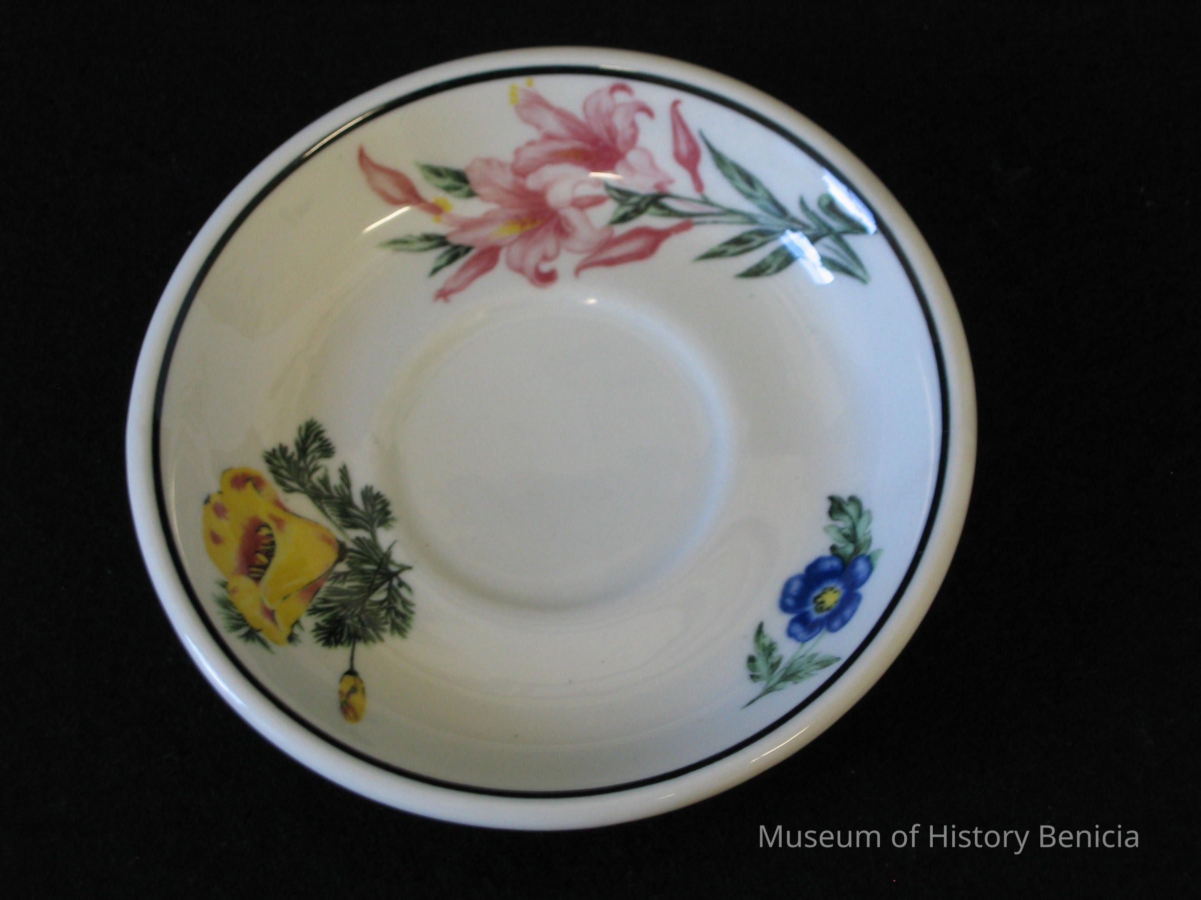Large saucer with three wildflowers Azalea, California Poppy, and Baby Blue Eyes.Collection