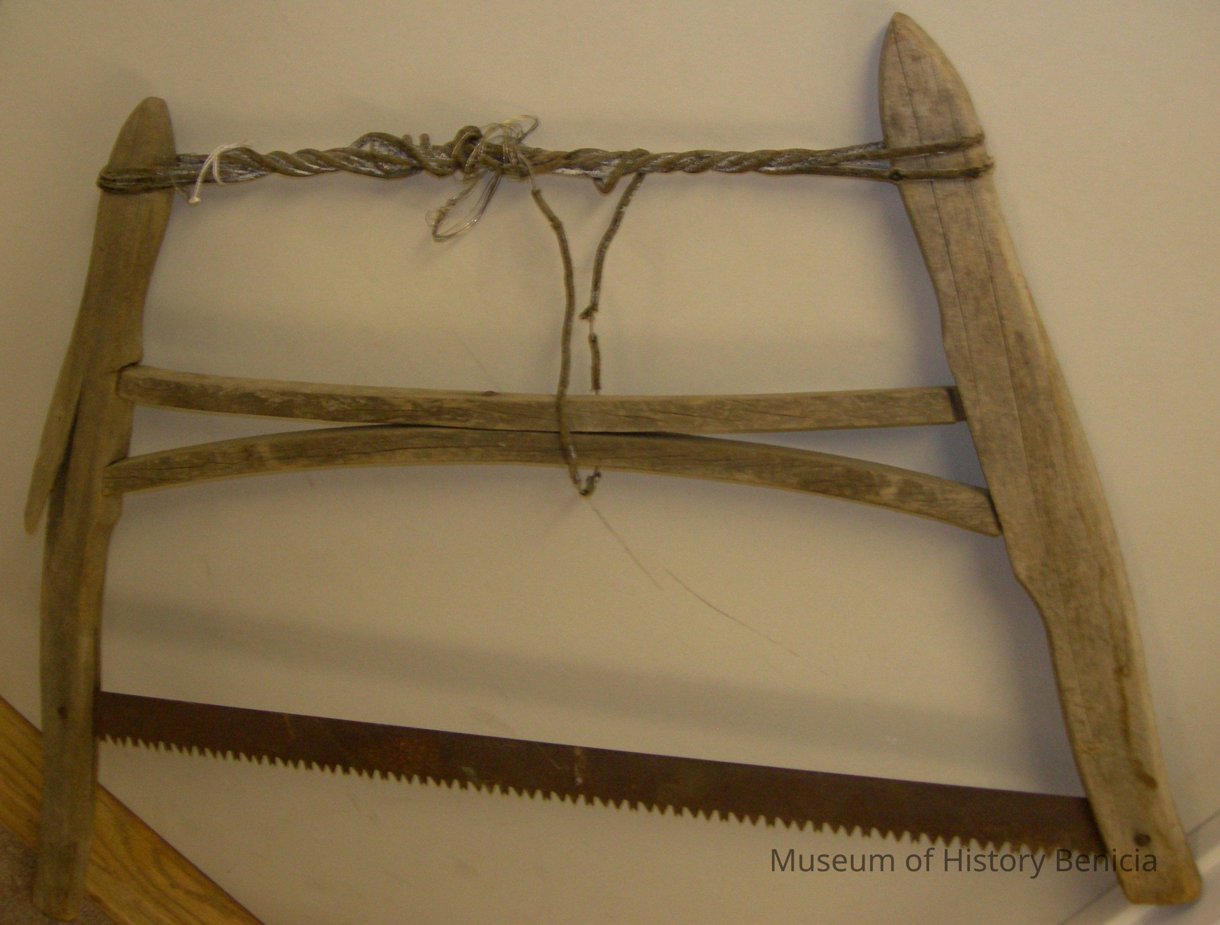 two-man wood saw, either unpainted or paint has worn off, on side handle longer than other