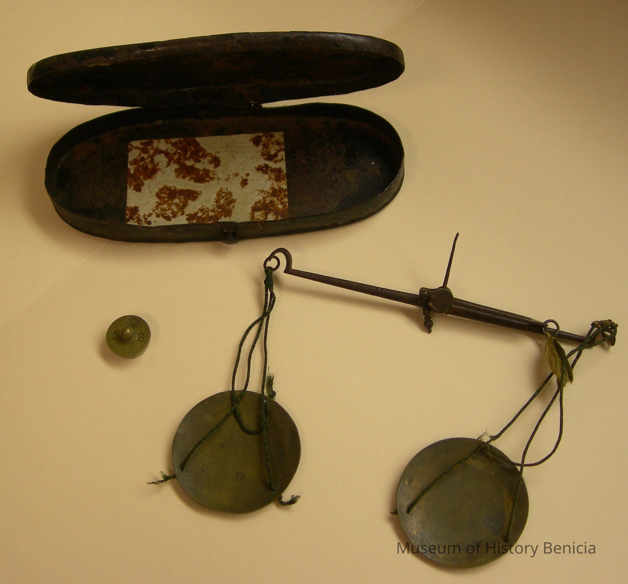 Miner's pocket scale in oval case with one weight;