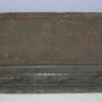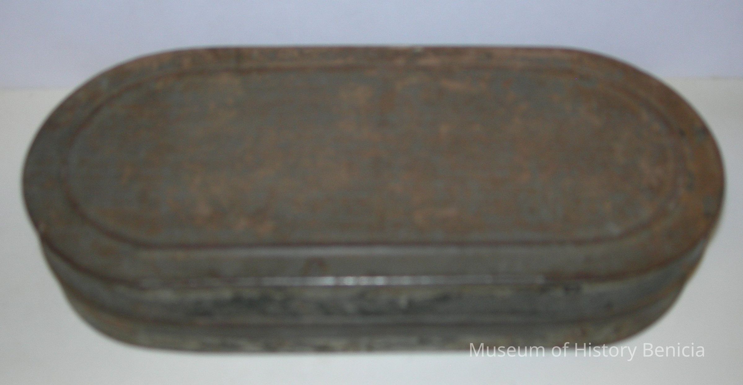 b. case, metal with hinged lid; oval shape; 8" long x 3-3/4" wide x 1-1/2" deep;