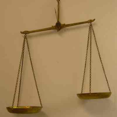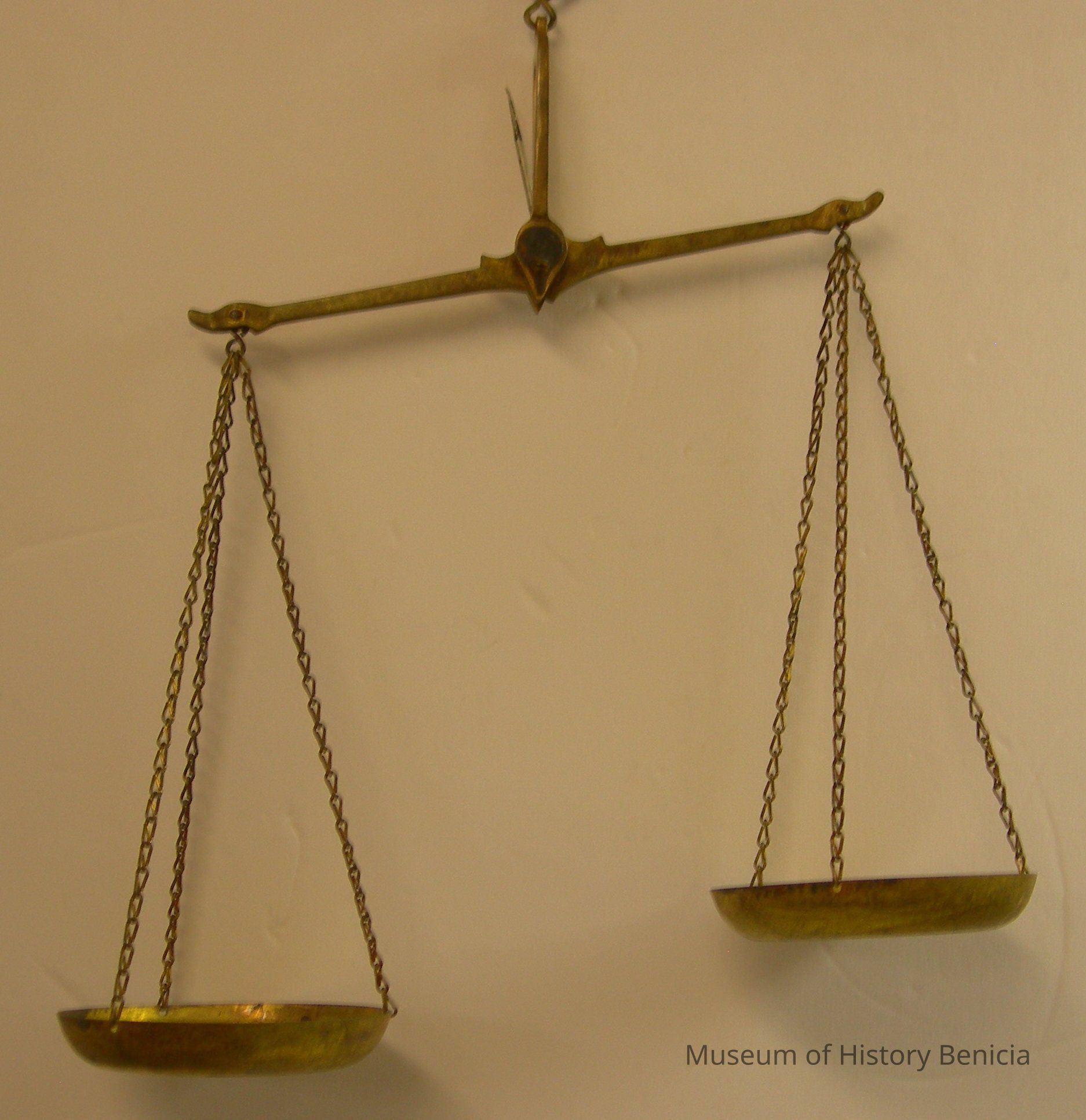 a. double scale, brass dishes on chains from balance beam; holding ring on top; 10-1/2" long (total); balance beam is 7" across; dishes are 3" in diameter; chains are 6-1/2" long;