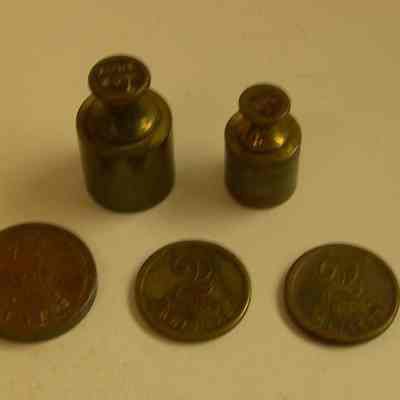 (1) round half-penny weight, 1/2" diameter; (1) bottle shaped, one ounce troy weight 5/8" diameter x 1" tall; (1) bottle shaped, half ounce troy weight 1/2" diameter x 7/8" tall.Collection