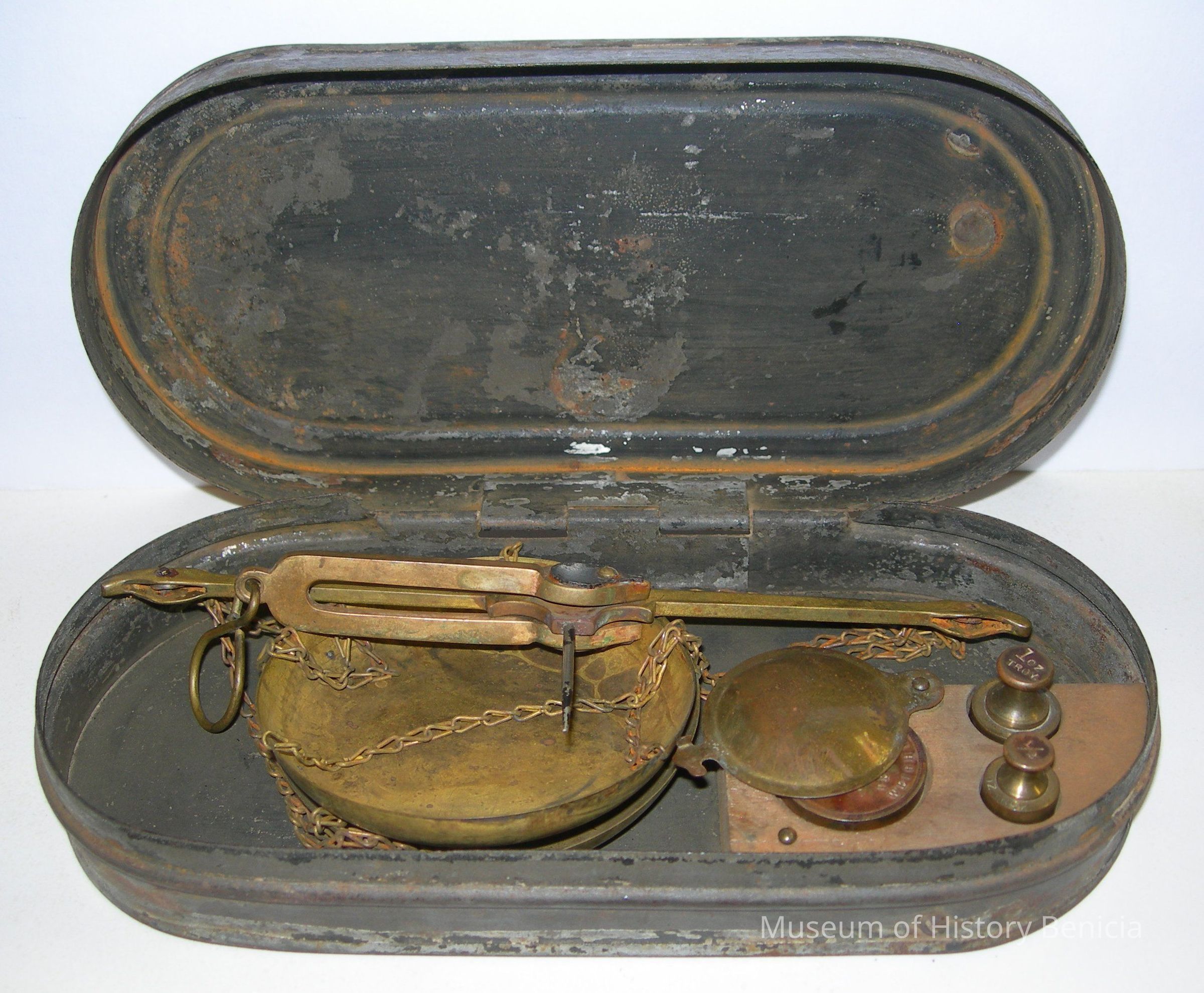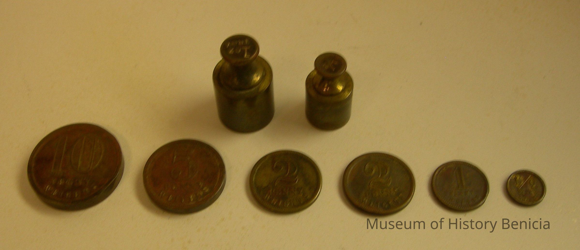 c. weights (8): (1) round ten-penny weight, 1" diameter; (1) round five-penny weight, 7/8" diameter; (2) round two-penny weights, 3/4" diameter; (1) one-penny weight, 5/8" diameter;