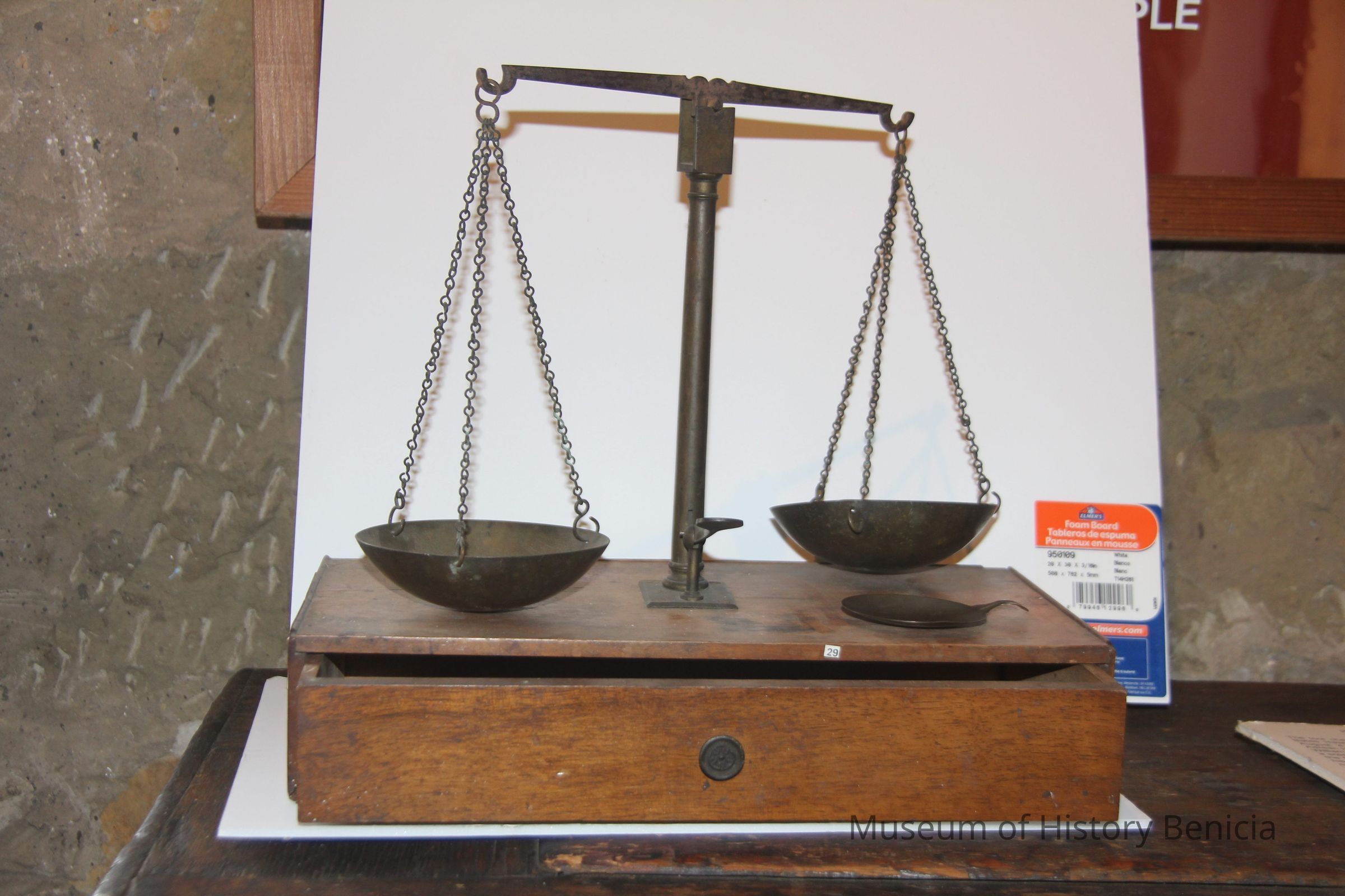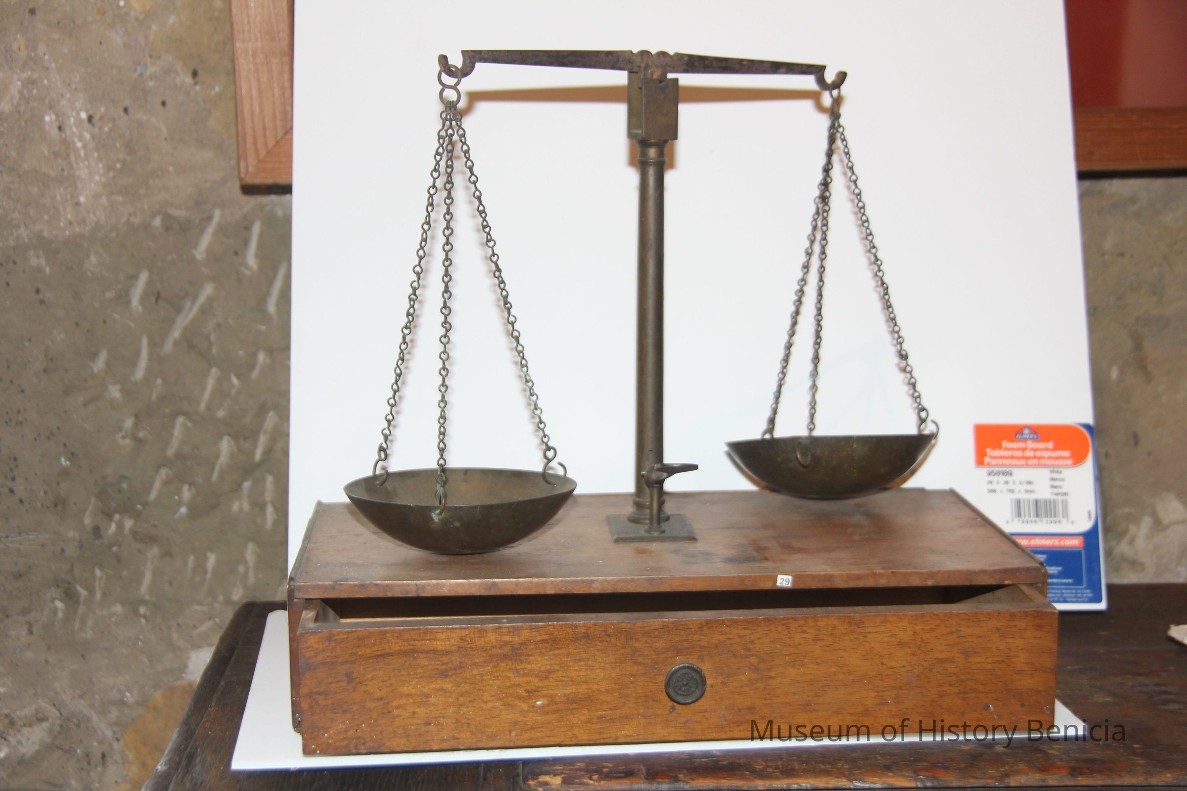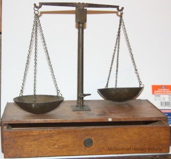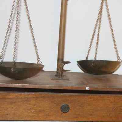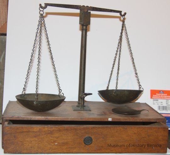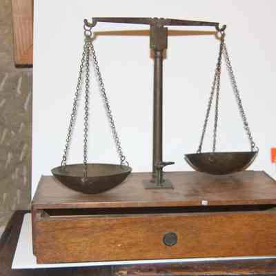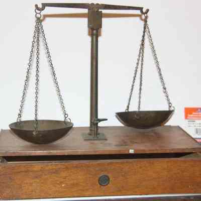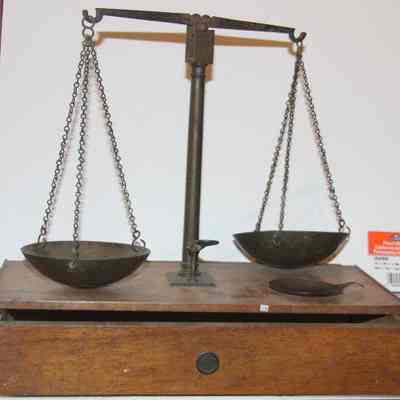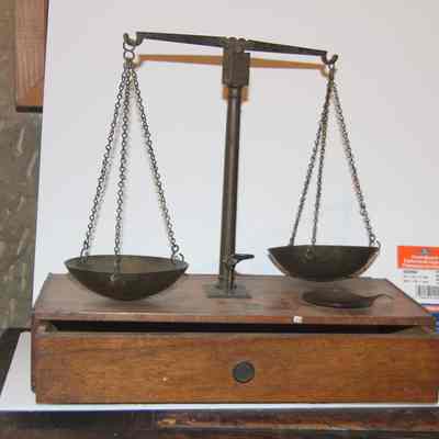 scale used for weighing gold. sits on wooden box.