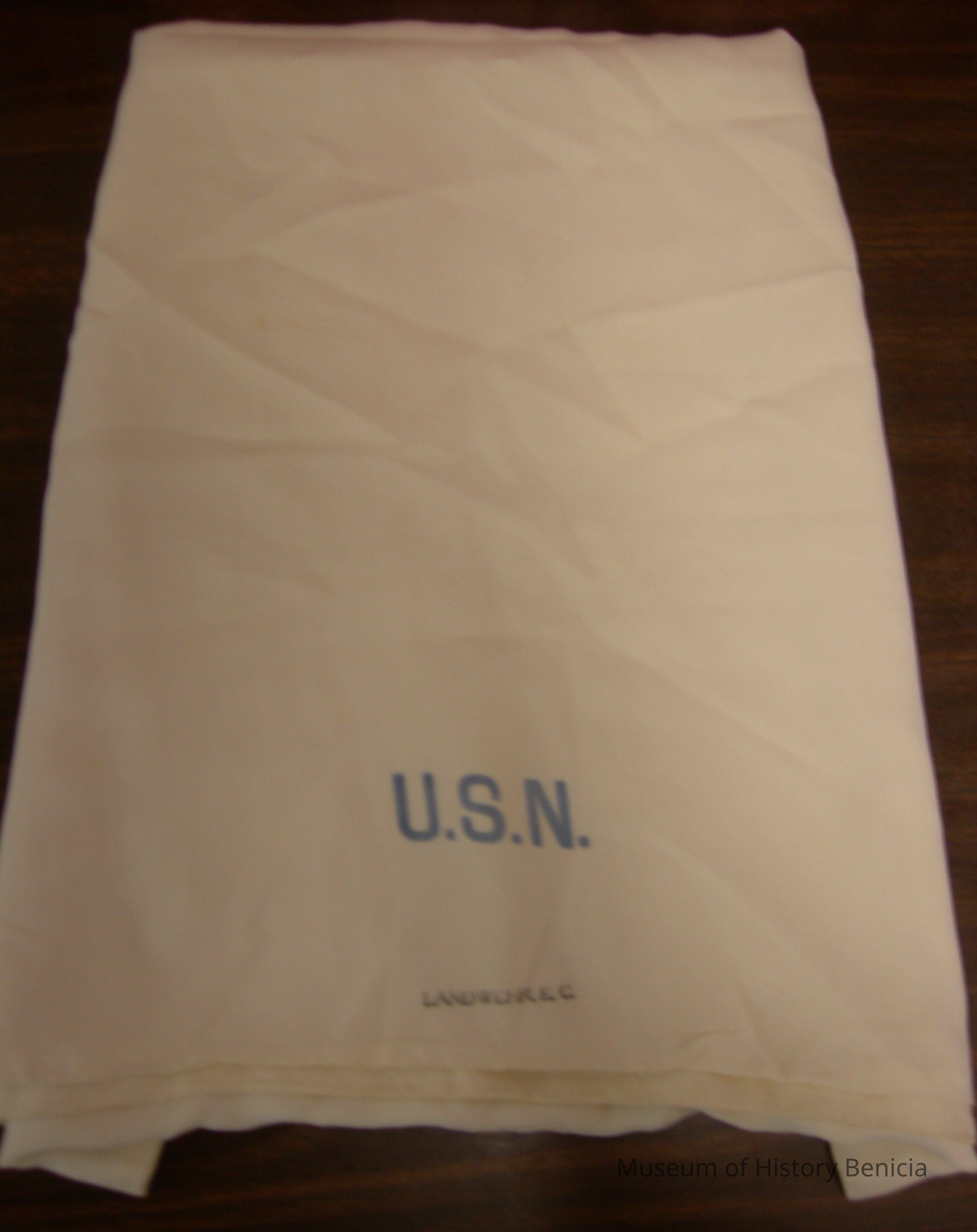 White, silk, Naval Aviator's scarf stamped: U.S.N. in blue and Landwehr, E. C. in black near one end of the scarf