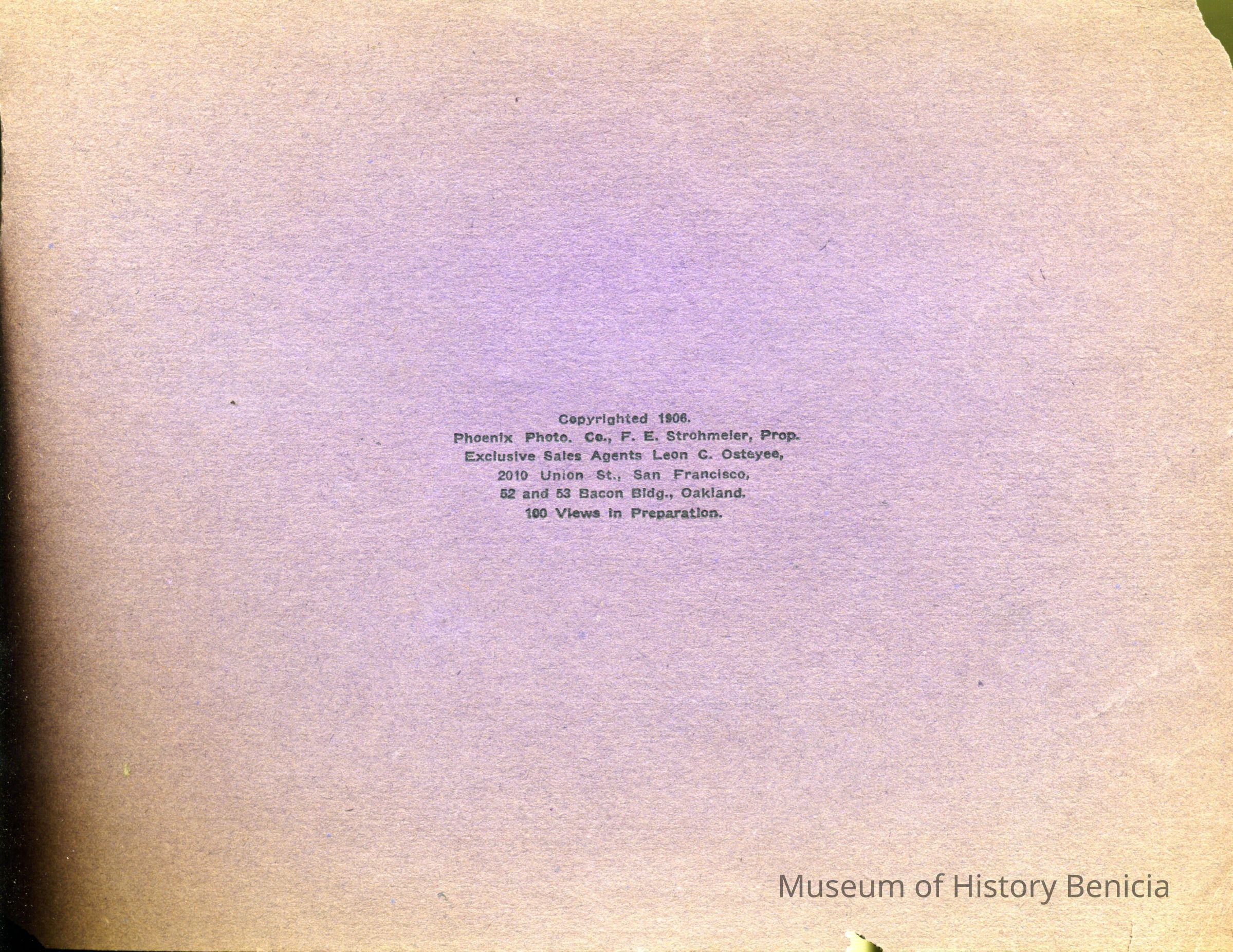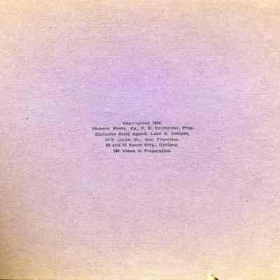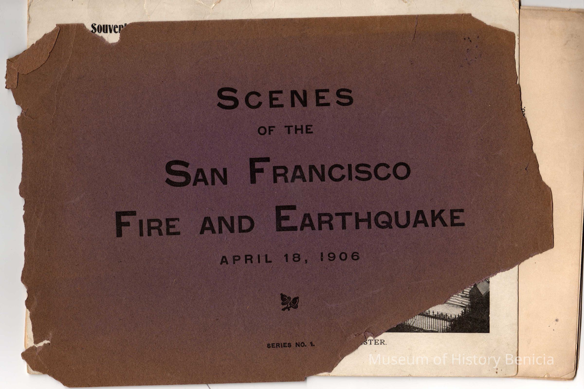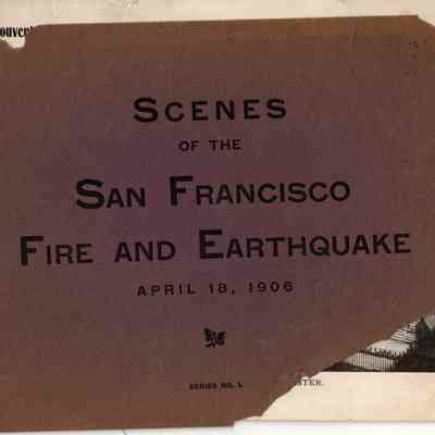 "Scenes of the San Francisco Fire and Earthquake - April 18, 1906". Series No. 1. Collection of photos, bound with a ribbon. Nine photos with captions altogether. Cover is detached and disintegrating. Should be handled with care.Collection