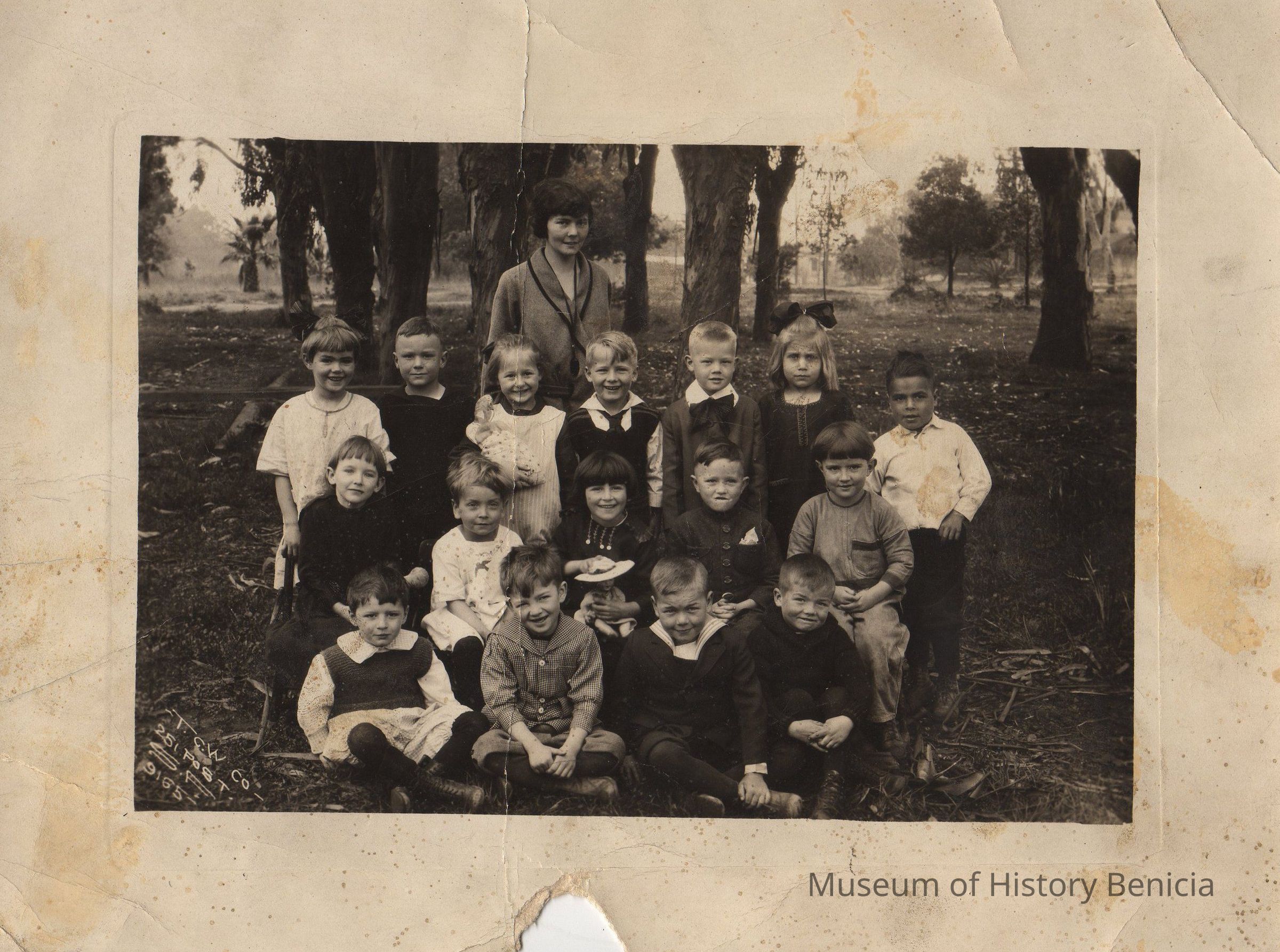 B/W Photograph: Kindergarten class 1921-22. Ms. Smith, teacher. (might have been taken in City Park in an area behind the "Kindergarten in the Park" building)