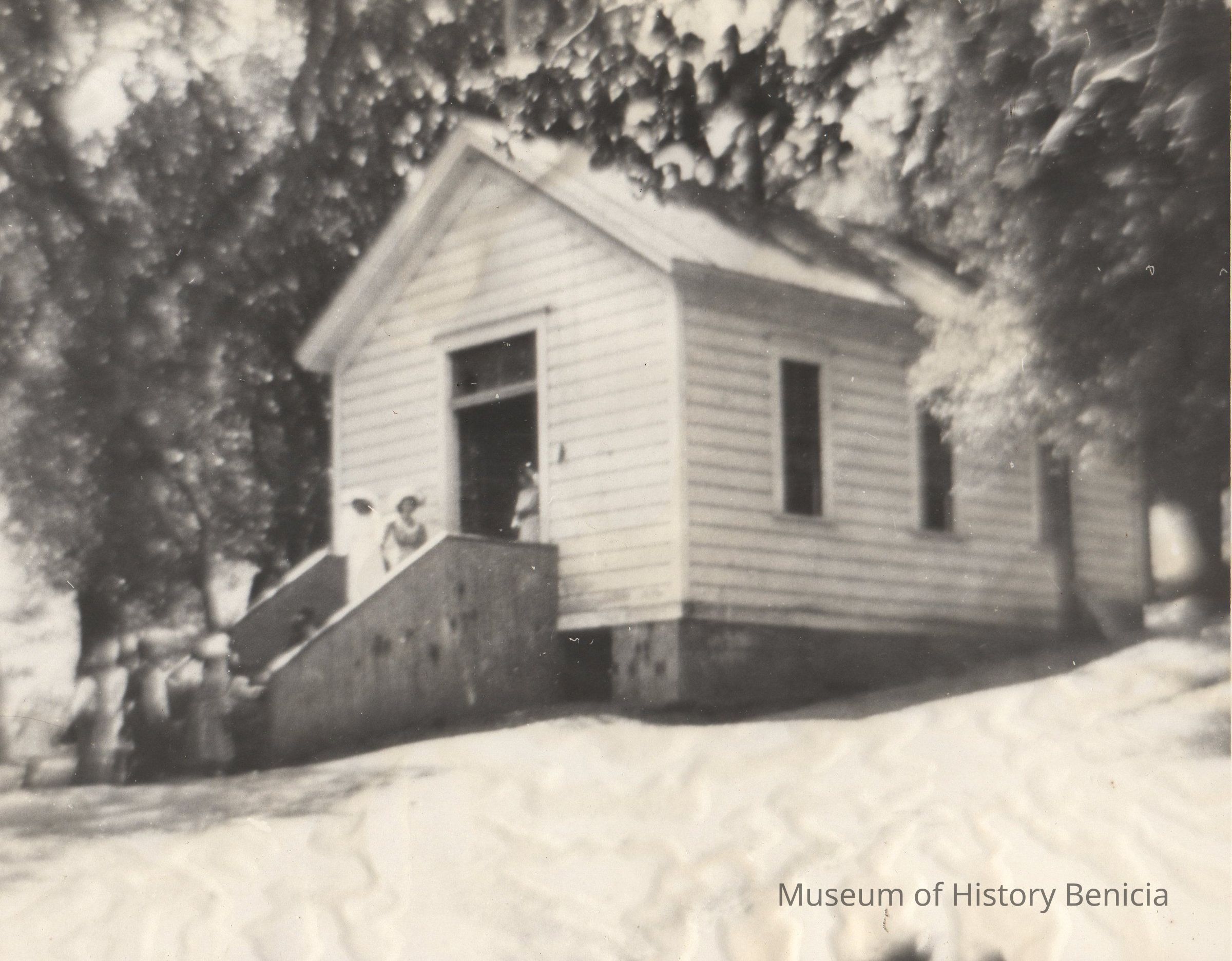 B/W photograph: Siebe School, a one-room schoolhouse which was located on the old Benicia-Cordelia Road near Pierce Station and Goodyear Station. Snow scene. Building later relocated and finally destroyed by fire. Siebe deeded the property with understanding it was to be used only for a school.Collection