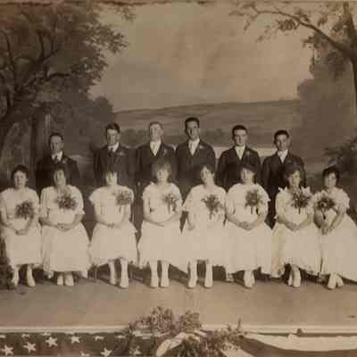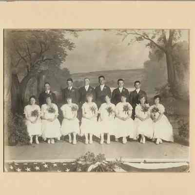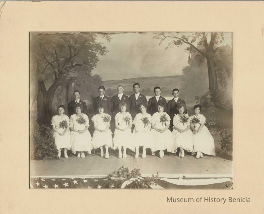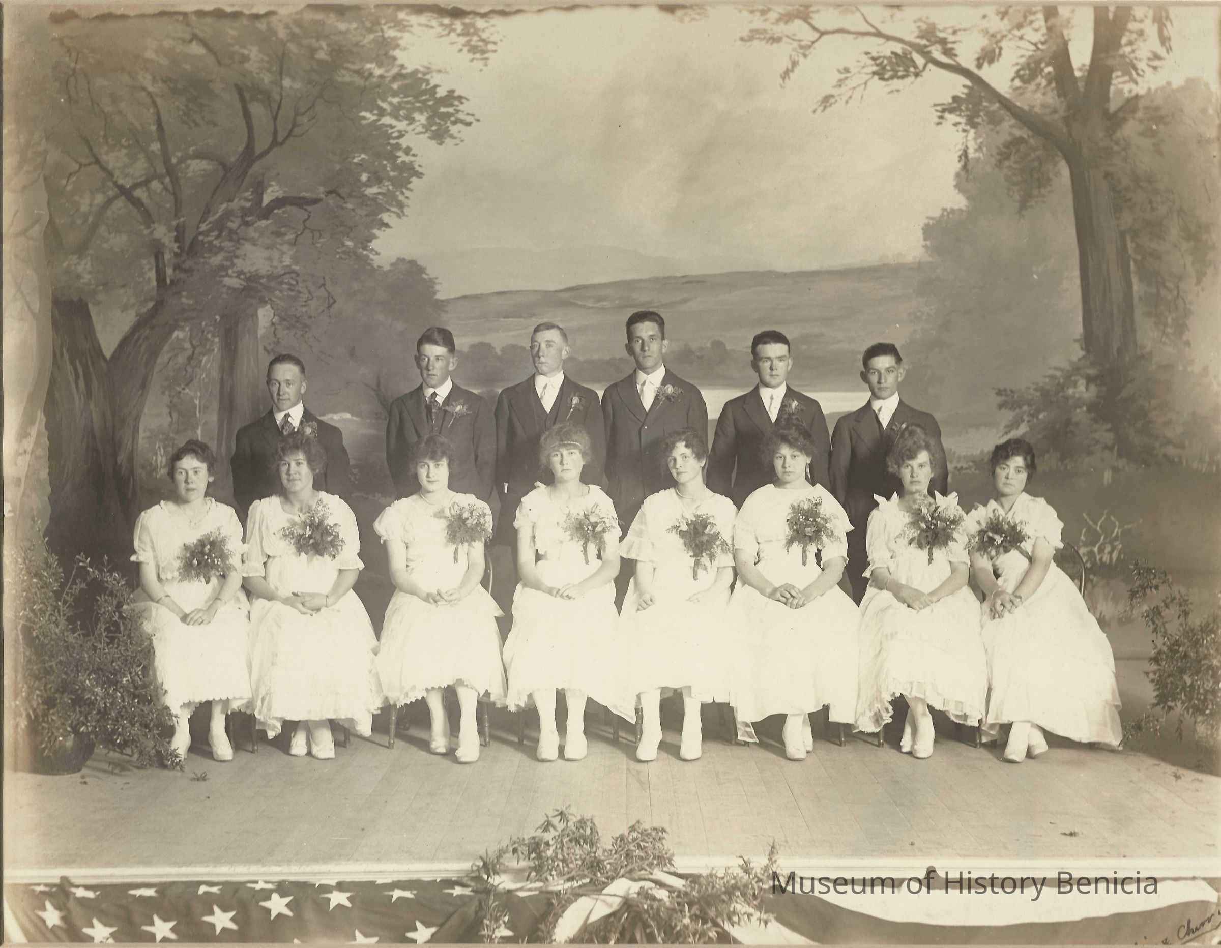Graduating class, Benicia High School, June 2, 1916. Boys L/R: Fred Short, Percy Rahill, George Bolton, Arthur Himbert, Frank Mitchell. Girls R/L: Pearl Quinn, Margaret Witt, Blanch Hallon, Bertha Birge, Ester Pooler, Myra Jones, Vera Witt, Ruth Alexander. B/W 8" x 10" photo on 10 1/2" x 12 1/2" creme-colored matte.Collection