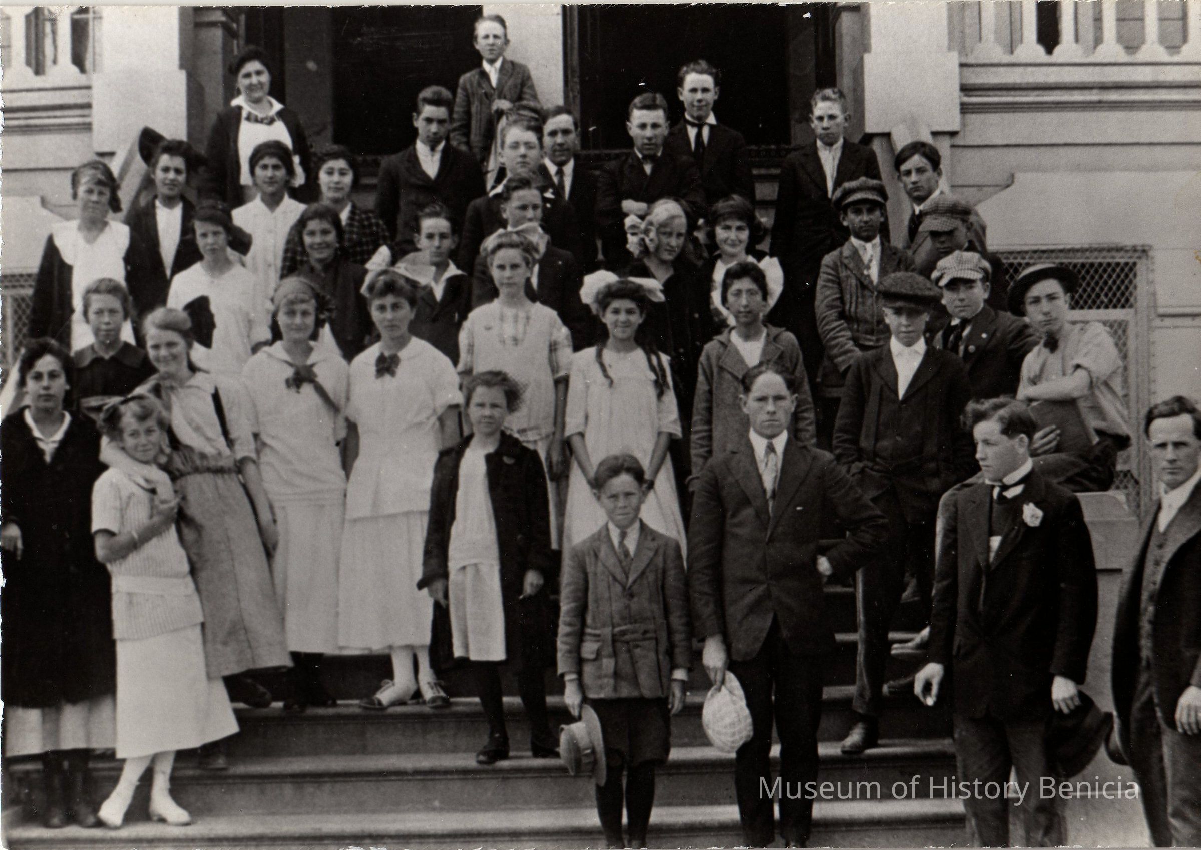 B/W group photograph of Benicia High School students, from photo collection of Richard B. Maurer. Richard is the one with arms crossed in top right center of top row of boys. He graduated in 1920 and worked in Bldg. 9 assembling 75 mm shells during World War I, summer of 1918.
