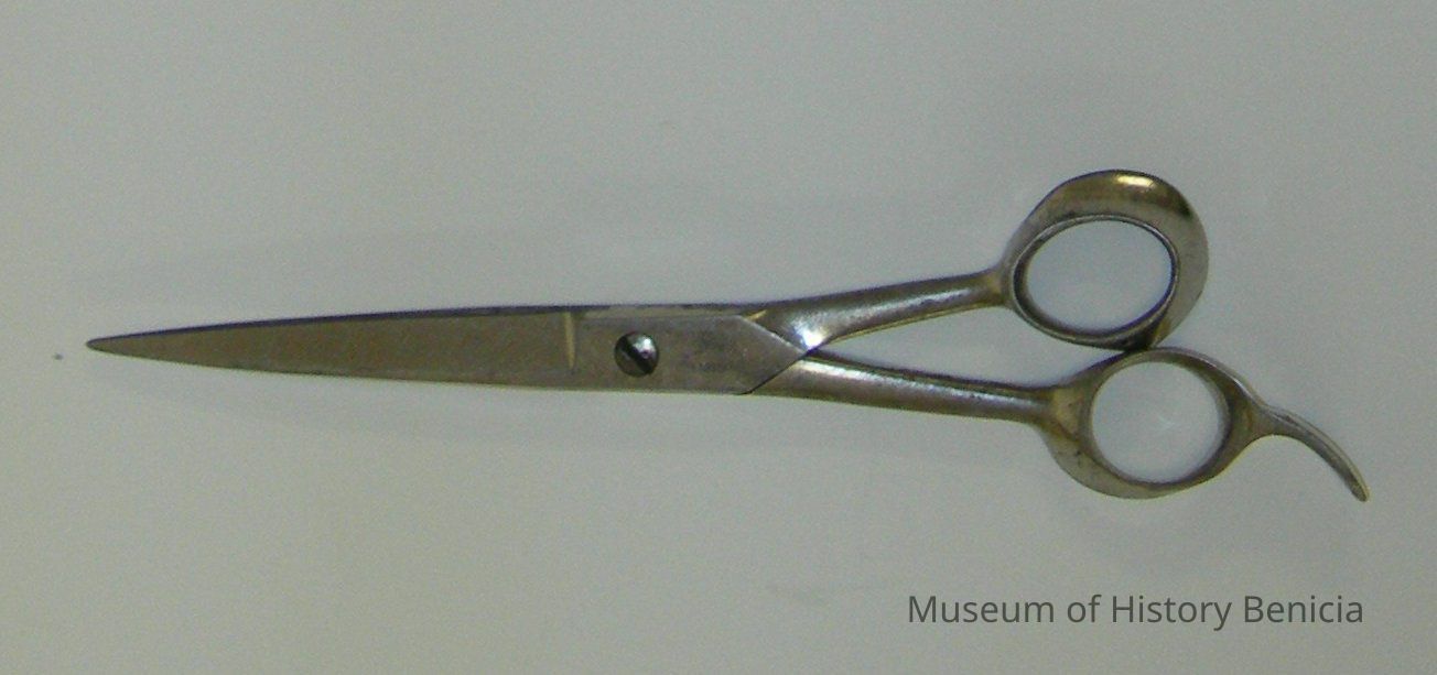 scissors, long, pointed; used to trim hair, has extra finger rest on one of the finger openings
