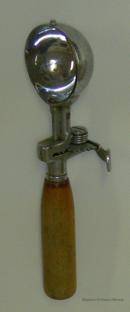 metal ice cream scoop with wooden handle; geared mechanism with thumb button to release the ice cream from the rounded scoop head