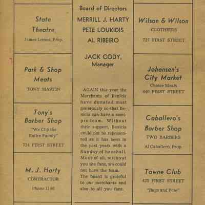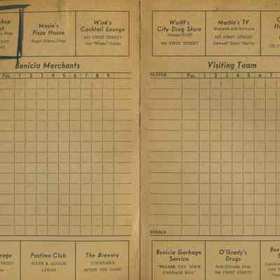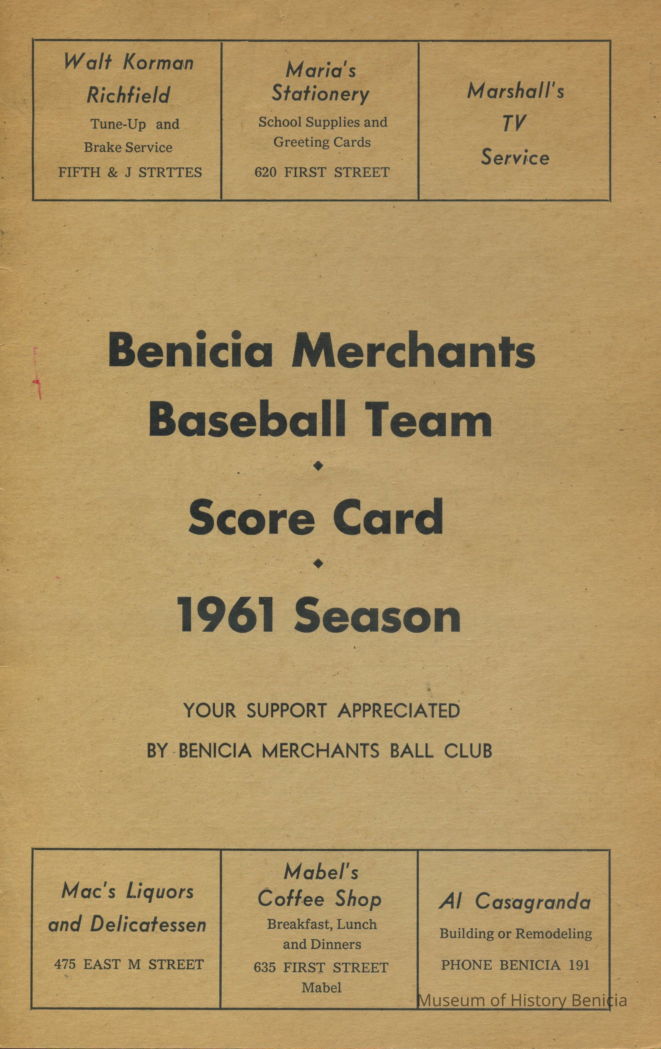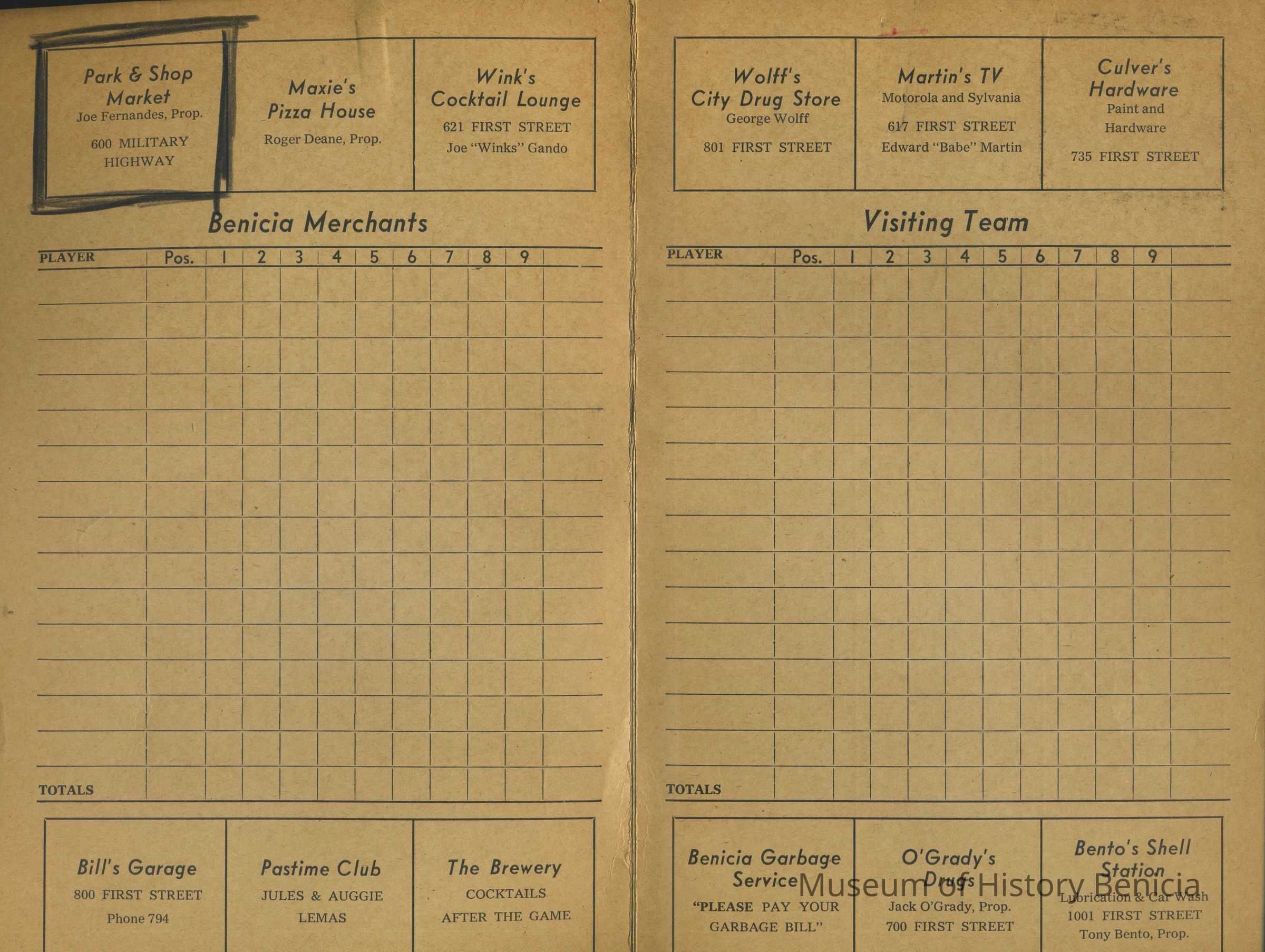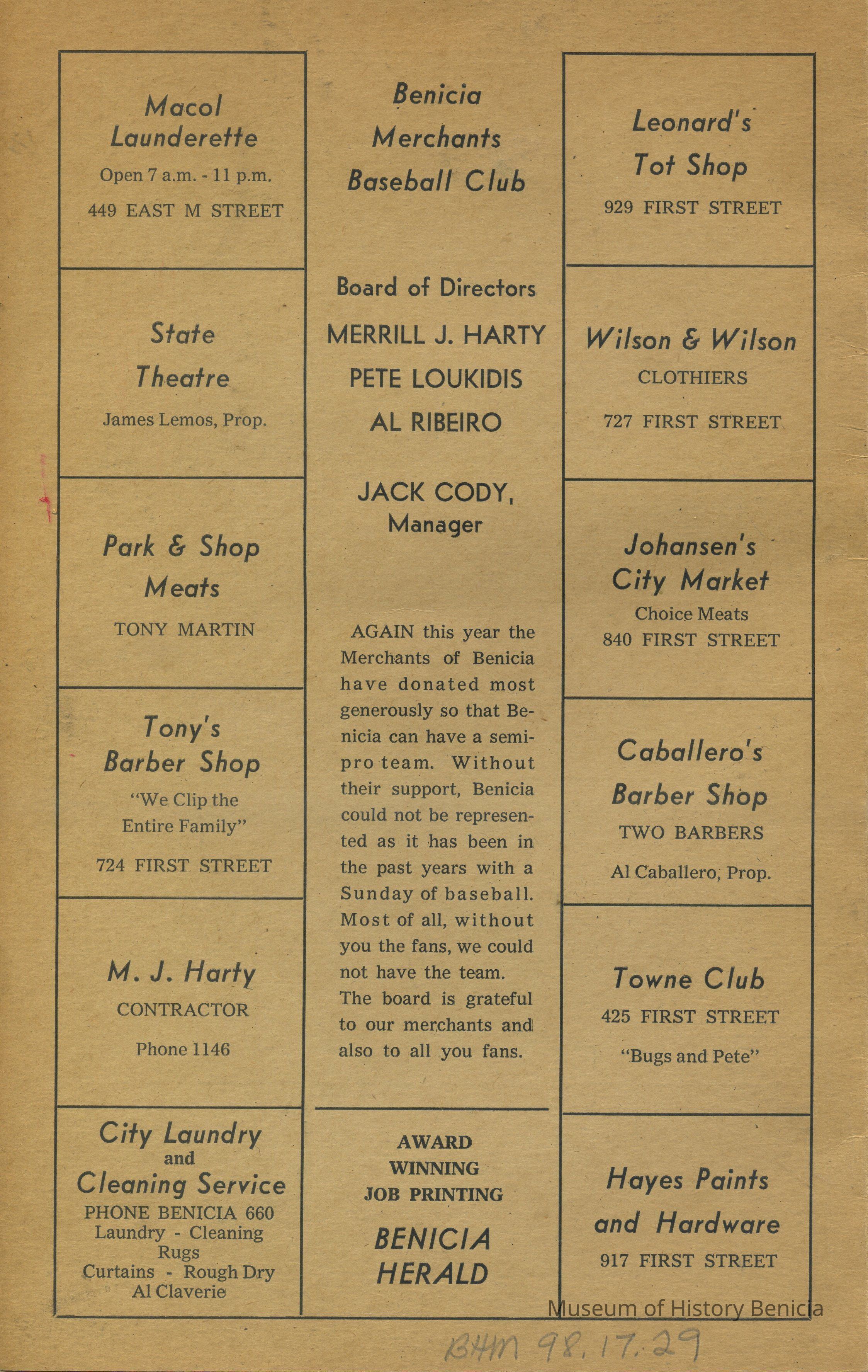 Advertisements from the following merchants appeared on the pages of the scorecard: Walt Korman Richfield, Maria's Stationery, Marshall's TV Service, Mac's Liquors & Delicatessen, Mabel's Coffee Shop, All Casagranda Building or Remodeling, Park & Shop Market, Maxie's Pizza House, Wink's Cocktail Lounge, Wolff's City Drug Store, Martin's TV, Culver's Hardware, Bill's Garage, Pastime Club, The Brewery, Benicia Garbage Service, O'Grady's Drugs, Bento's Shell Station, Macol Launderette, State Theatre, Park & Shop Meats, Tony's Barber Shop, M. J. Harty Contractor, City Laundry & Cleaning Service, Leonard's Tot Shop, Wilson & Wilson, Johansen's City Market, Caballero's Barber Shop, Towne Club, Hayes Paints & Hardware.Collection