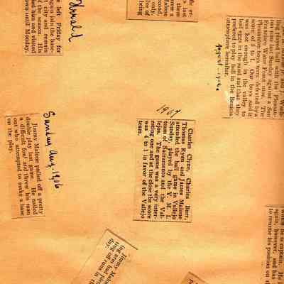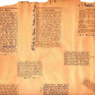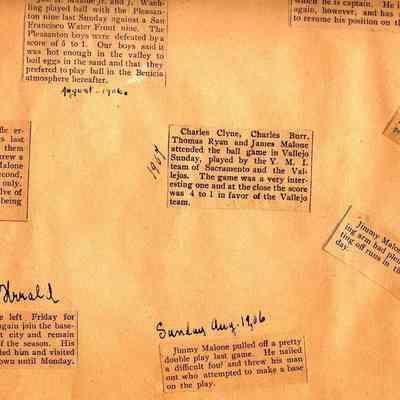 Loose page from a scrapbook album. This album contains newspaper articles and photos having to do with baseball teams and people involved with the teams. They date from early 1900's to 1910 or so.