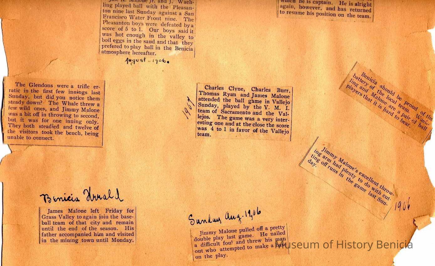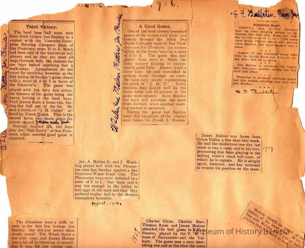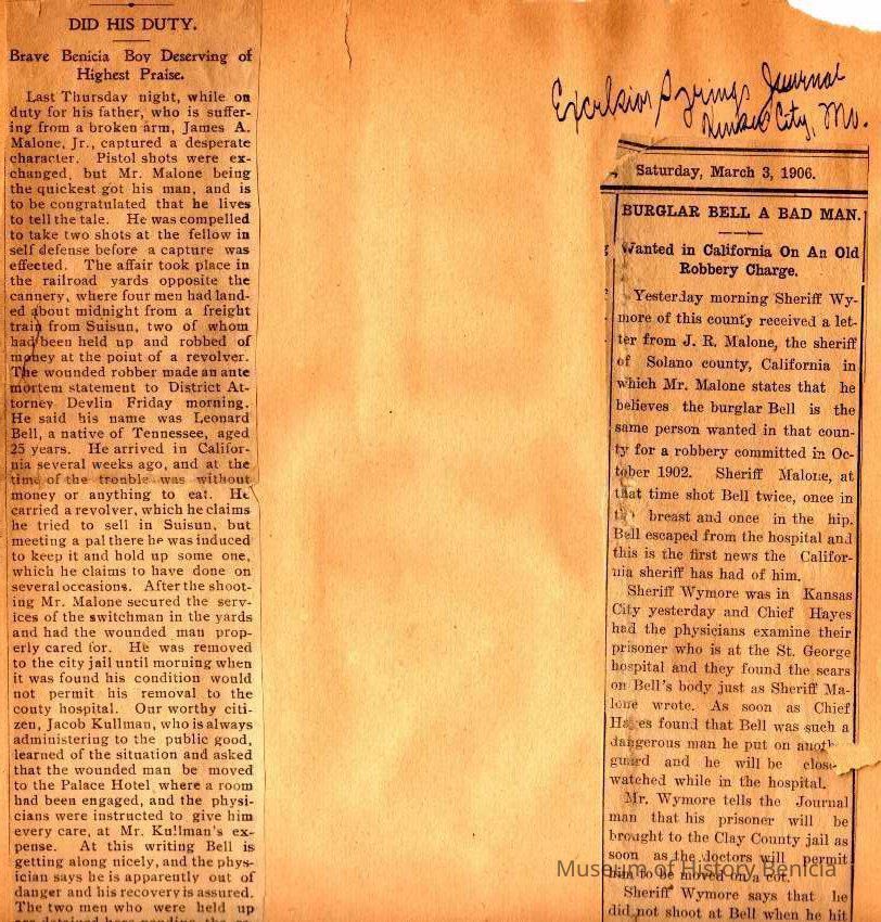 This page is from 1906 & 1907. One side talks about various games being played in and around the Bay Area. The other side talks about the capture of a man in Benicia after a shootout with James A Malone Jr who was on duty for his father, James Malone Solano County Sheriff. This happened in 1902 and the man escaped from the hospital. He was later identified in 03/03/1906 as a burglar captured in Kansas City, Mo.
