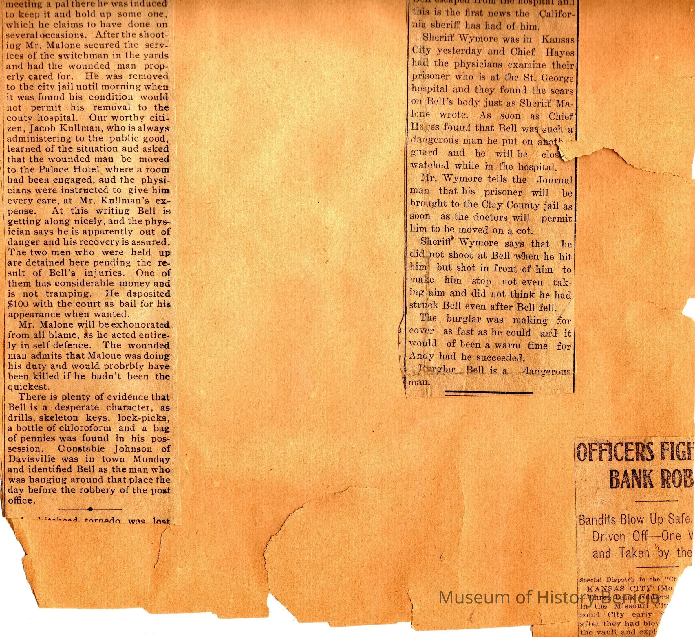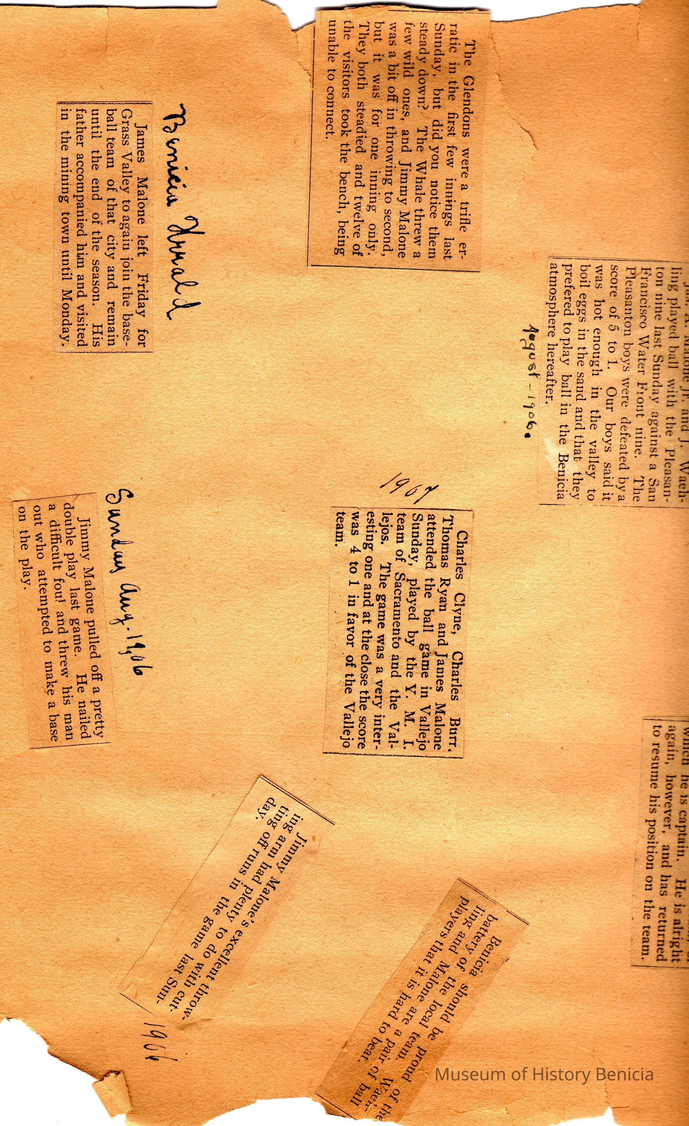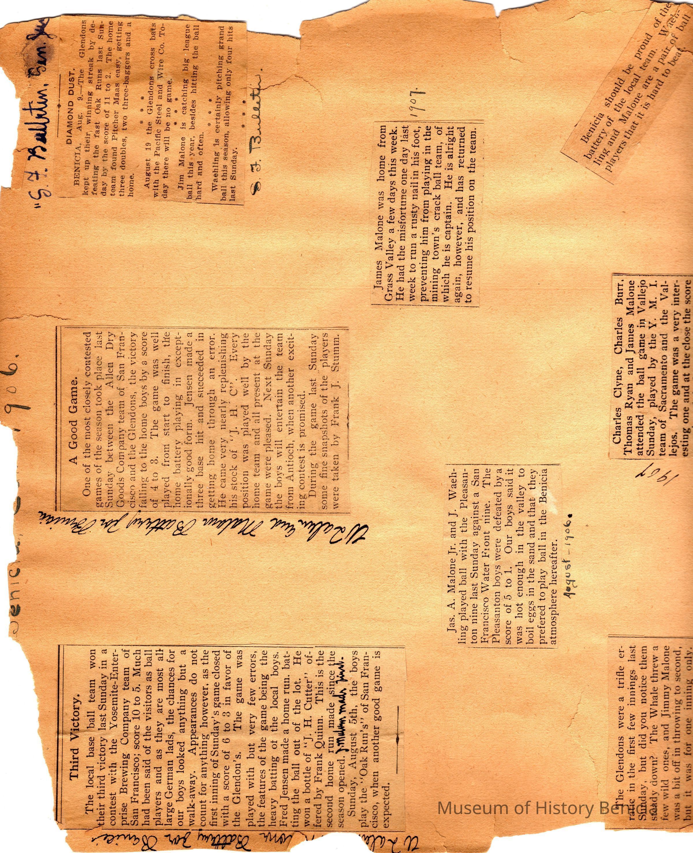 This page is from 1906 & 1907. One side talks about various games being played in and around the Bay Area. The other side talks about the capture of a man in Benicia after a shootout with James A Malone Jr who was on duty for his father, James Malone Solano County Sheriff. This happened in 1902 and the man escaped from the hospital. He was later identified in 03/03/1906 as a burglar captured in Kansas City, Mo.