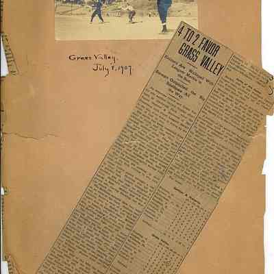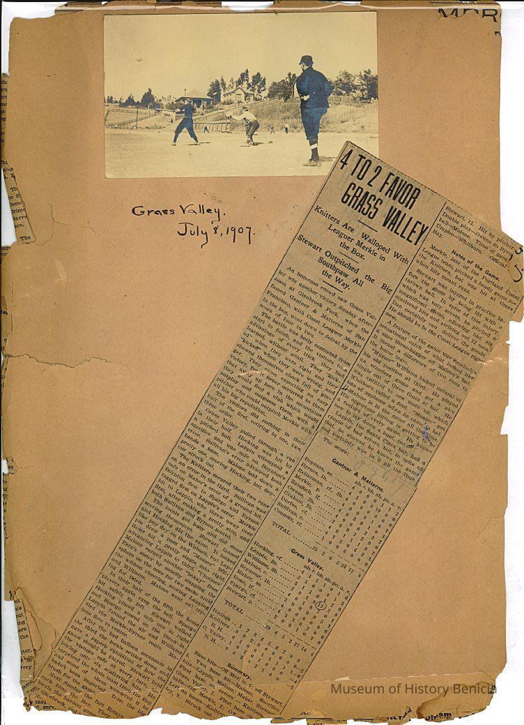 This page is from July 8, 1907. It talks about Grass Valley vs the Gantner & Matterns team. It has a photo that looks like the John Molfino photos. It shows a game being played in Benicia. The article says they played at Glenbrook Park.
