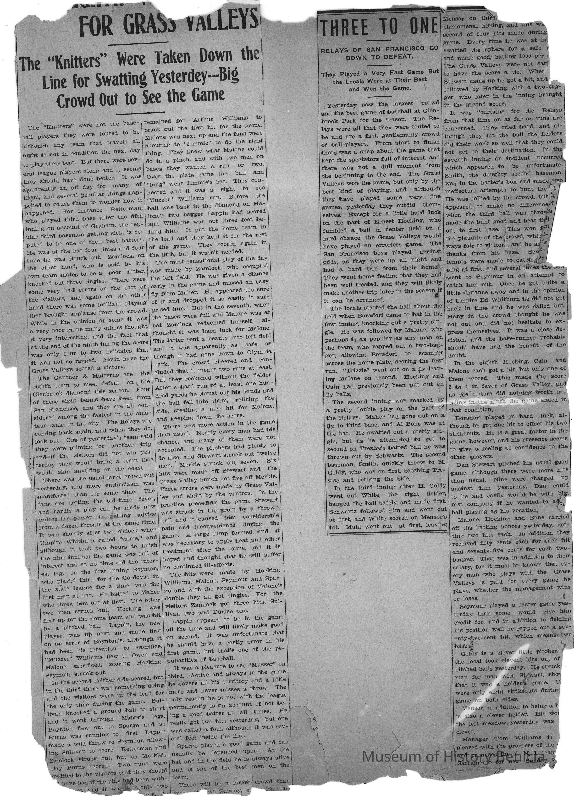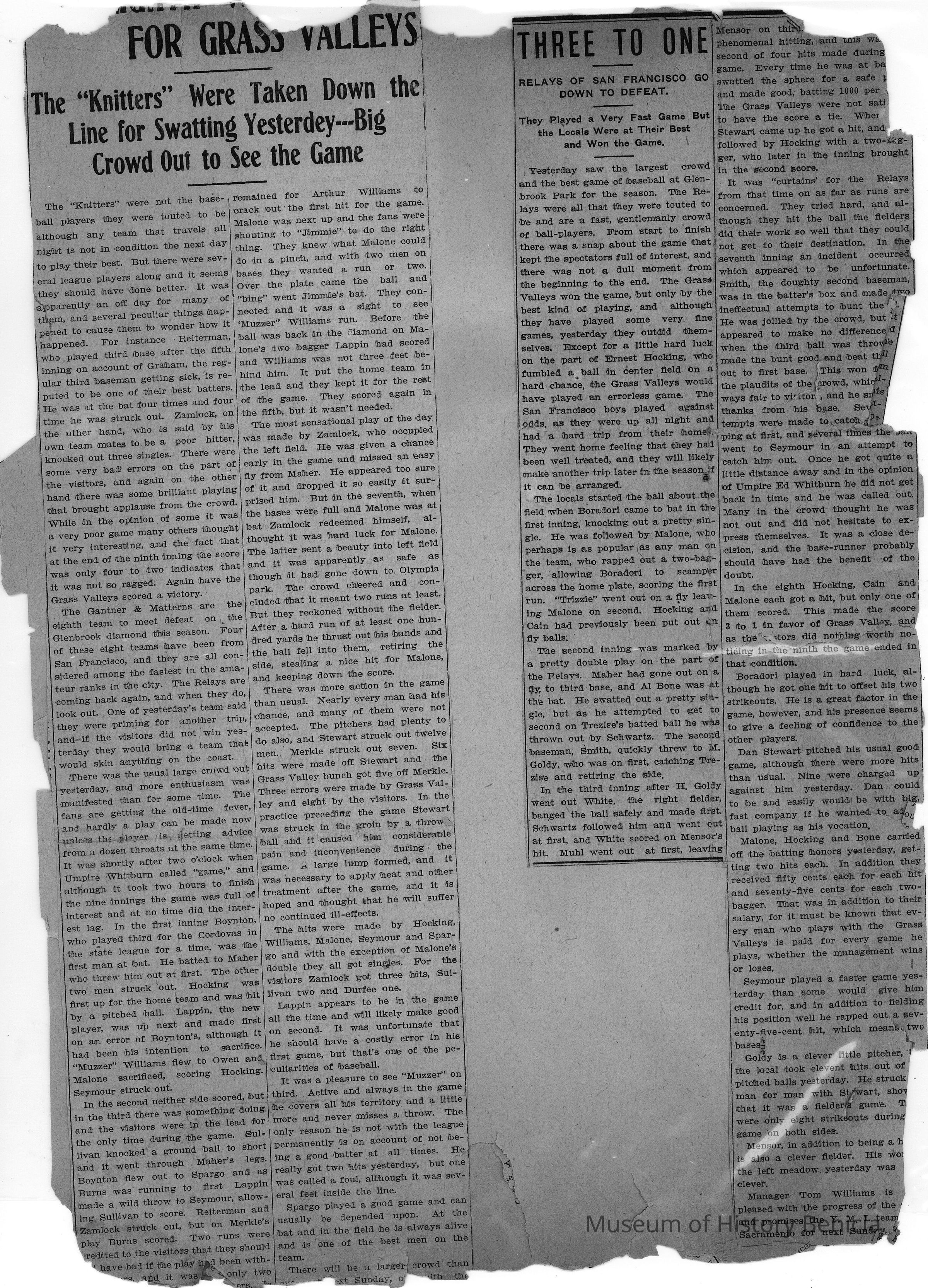 Loose page from a scrapbook album. This album contains newspaper articles and photos having to do with baseball teams and people involved with the teams. They date from early 1900's to 1910 or so.