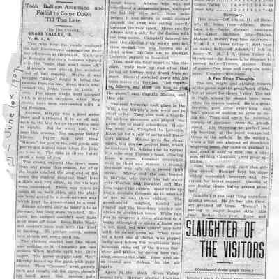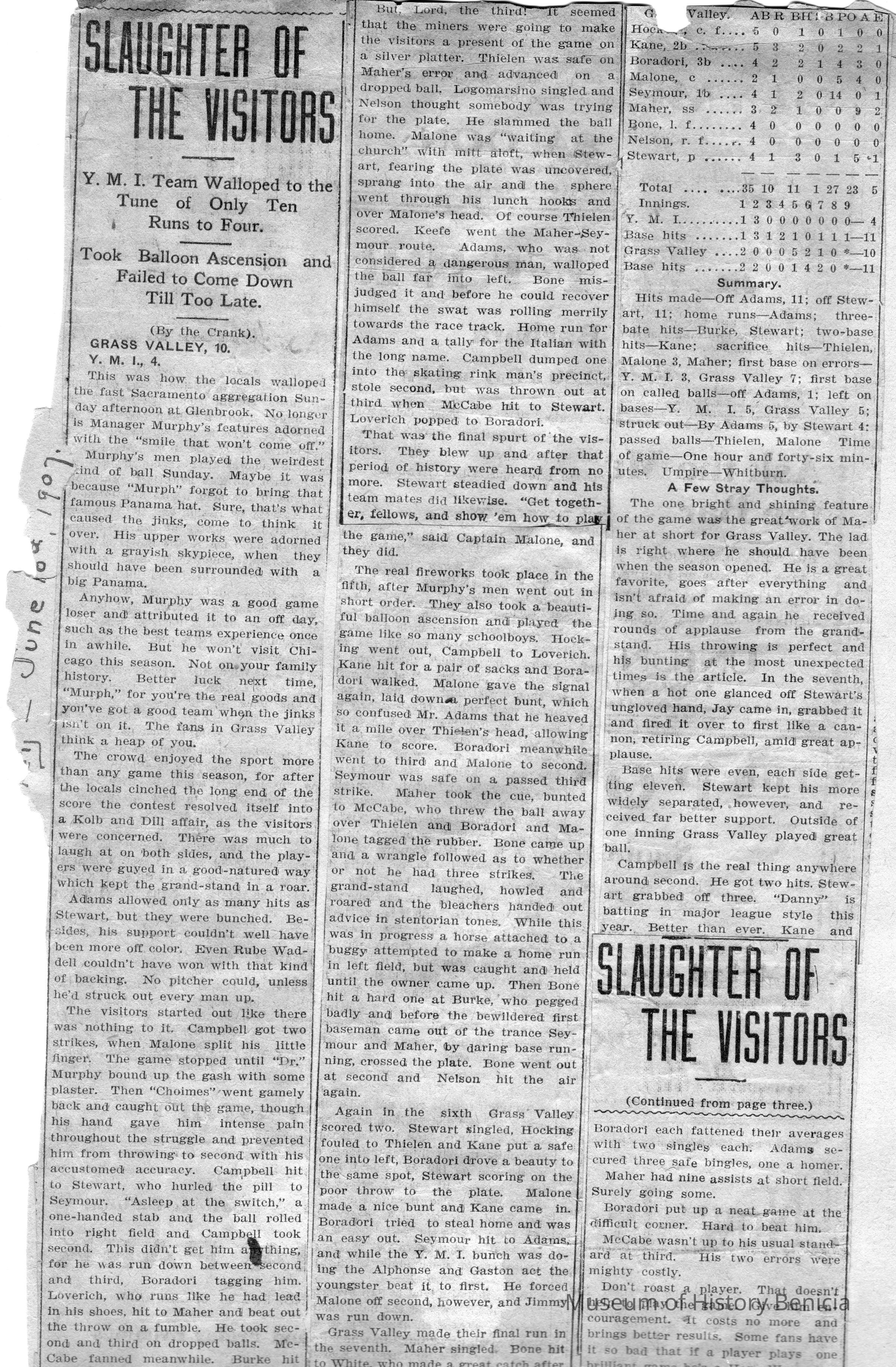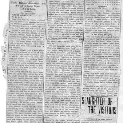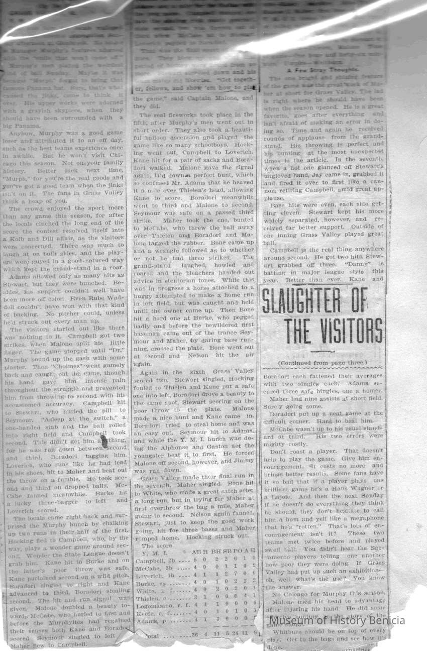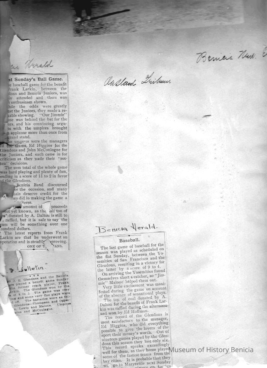 This page is from 1907. One side talks about a game between the Glendons and Benicia Juniors for the benefit of Frank Larkin. There is a photo on this side. The other side talks of games between the YMI and Grass Valley.in Salinas and Monterey.