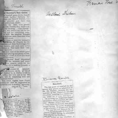 Loose page from a scrapbook album. This album contains newspaper articles and photos having to do with baseball teams and people involved with the teams. They date from early 1900's to 1910 or so.