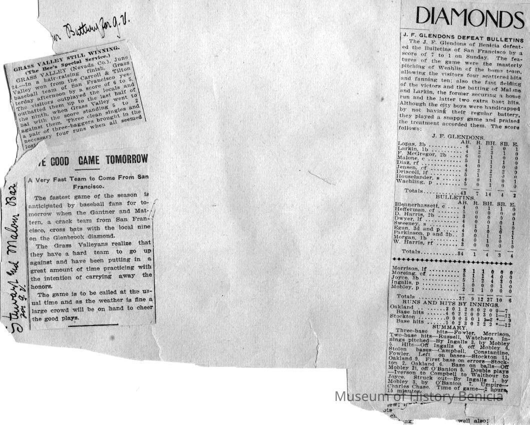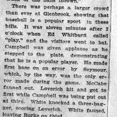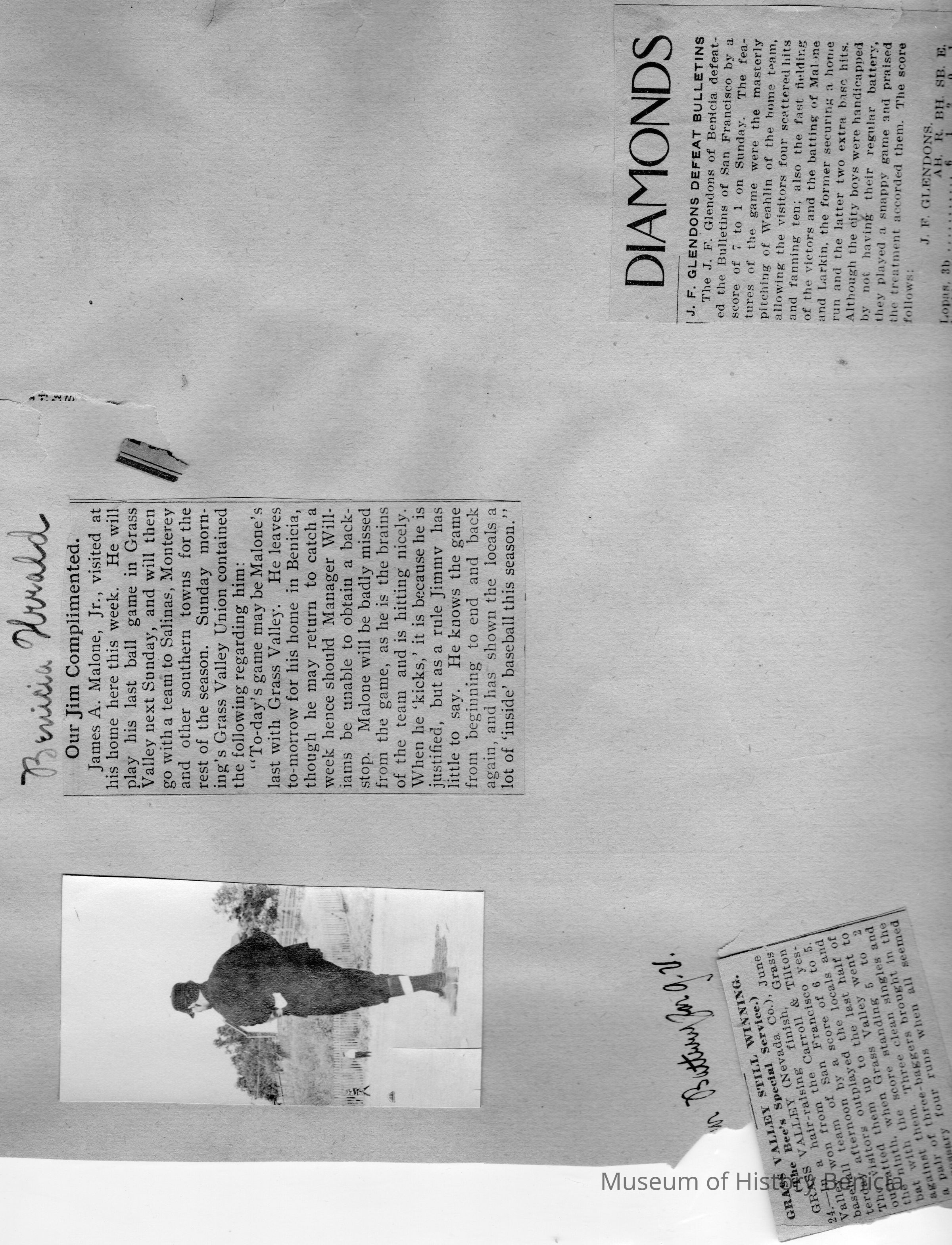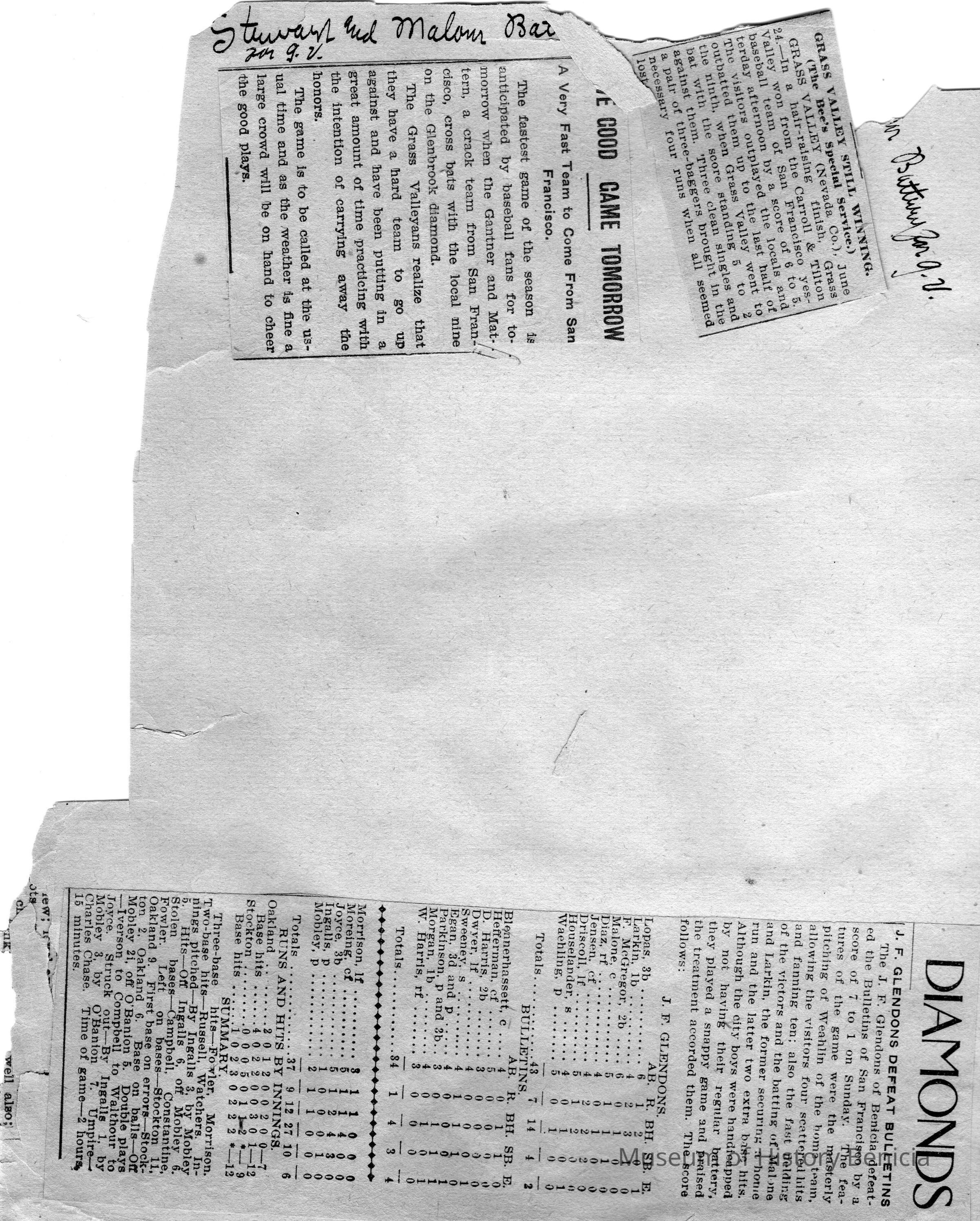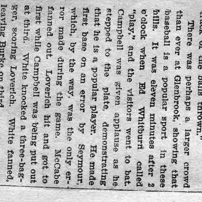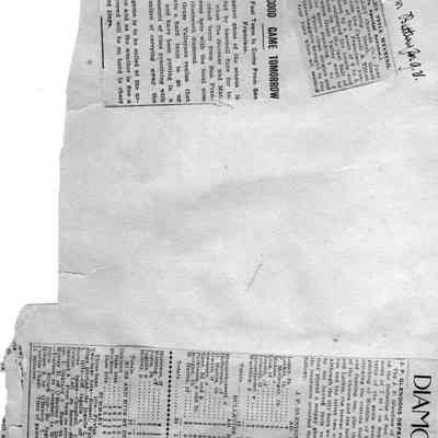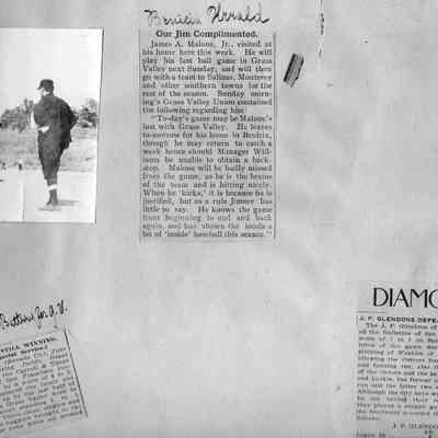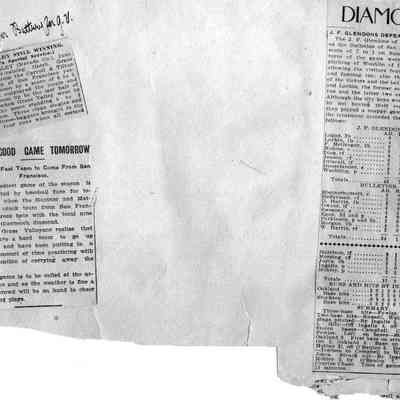 Loose page from a scrapbook album. This album contains newspaper articles and photos having to do with baseball teams and people involved with the teams. They date from early 1900's to 1910 or so.