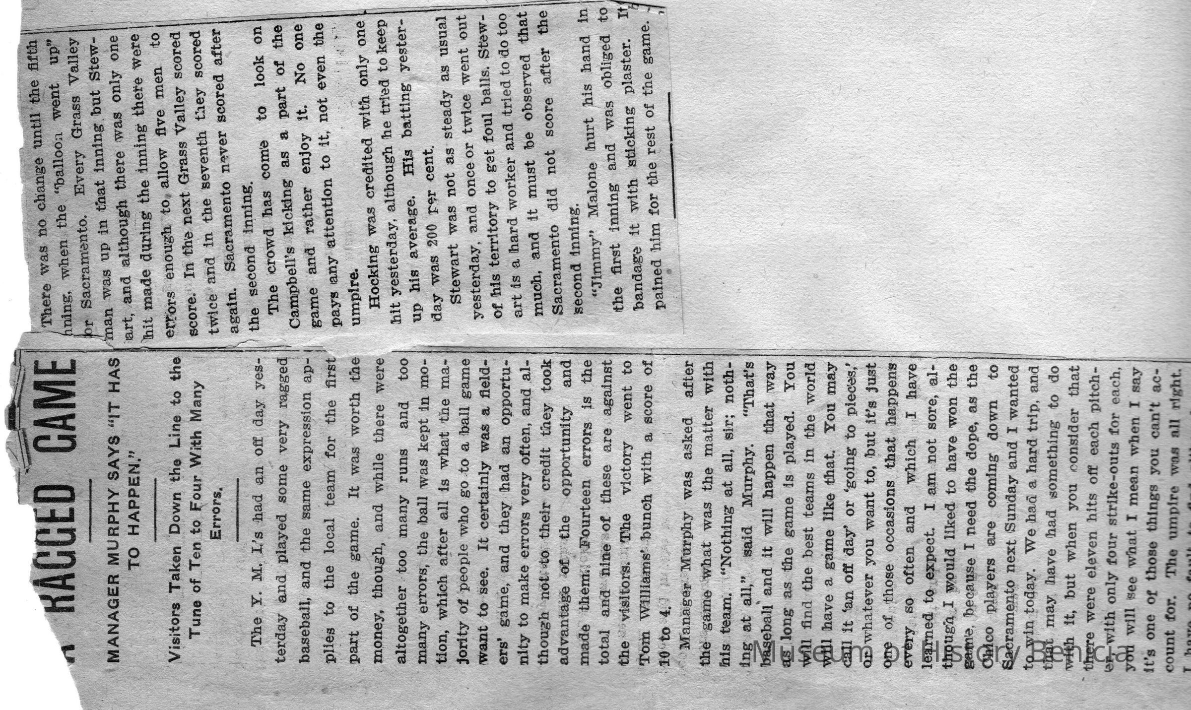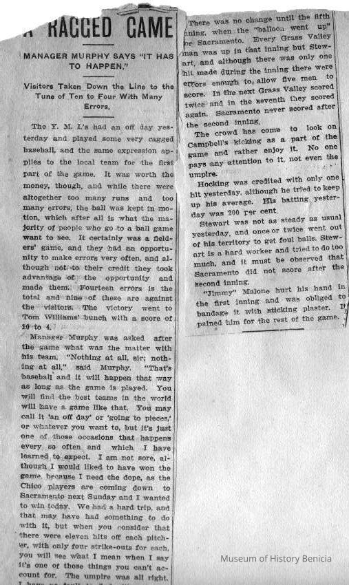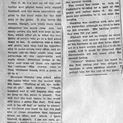 This page is from an unknown year. One side talks about James Malone Jr being complimented. There is a photo on this side. The other side talks about a YMI game that was "ragged".