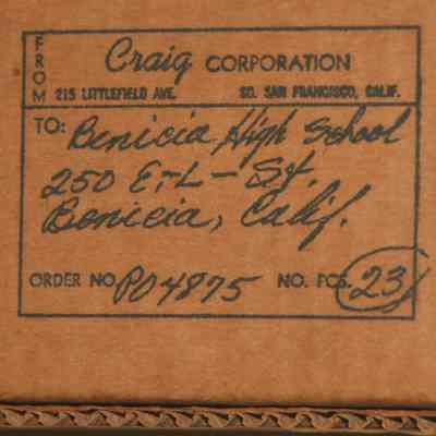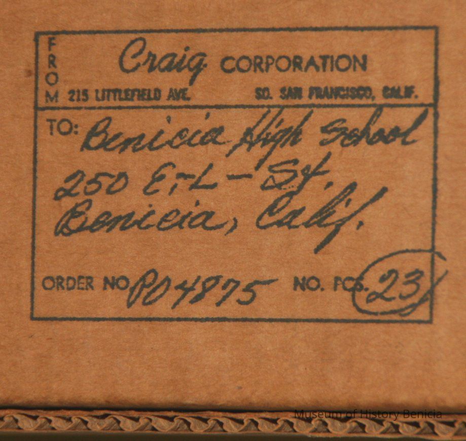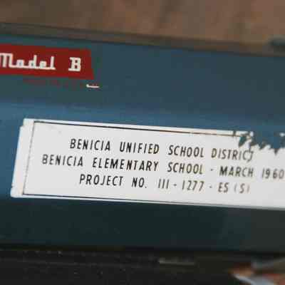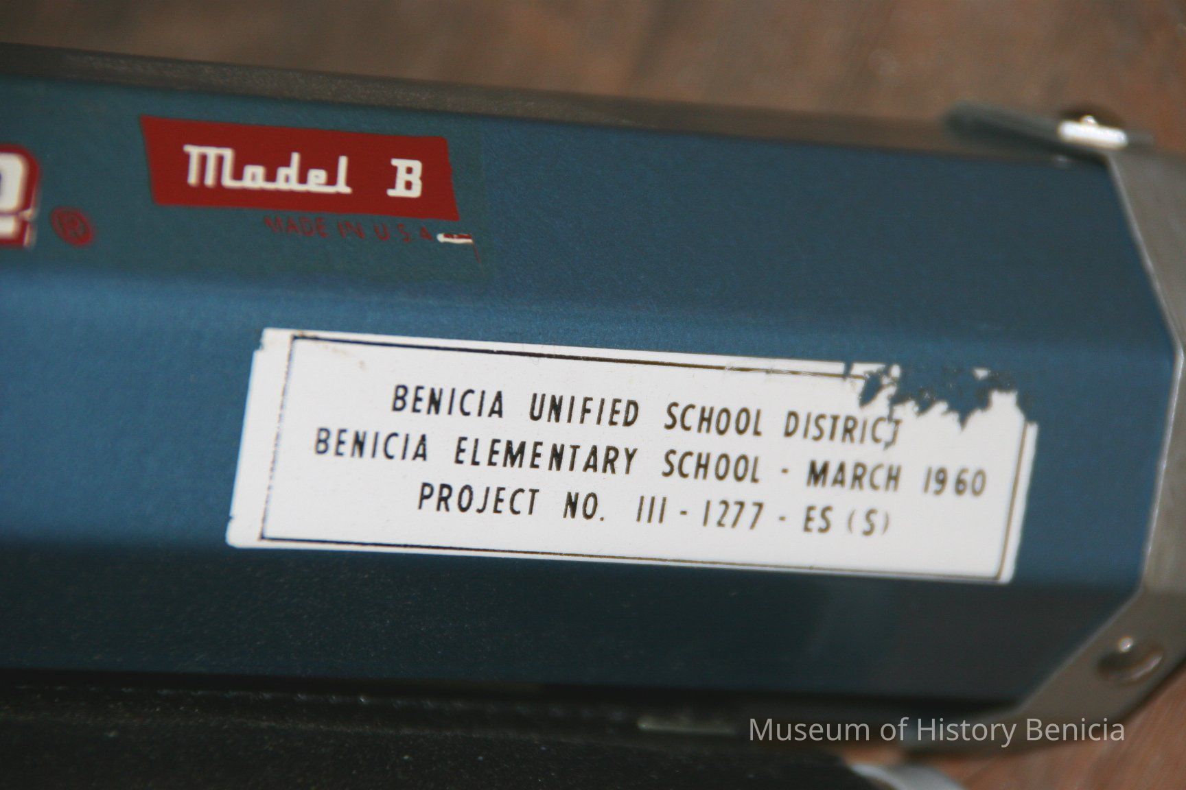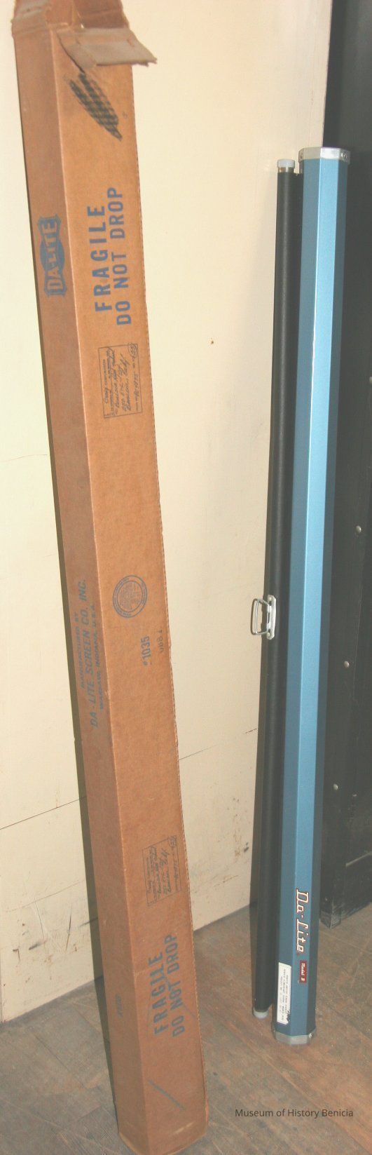 Da-Lite 50x50 model "B" hanging projection screen. From Benicia Unified School District, Benicia Elementary School - March 1960. Project no 111-1277-ES(S). Mildew resisting.Collection