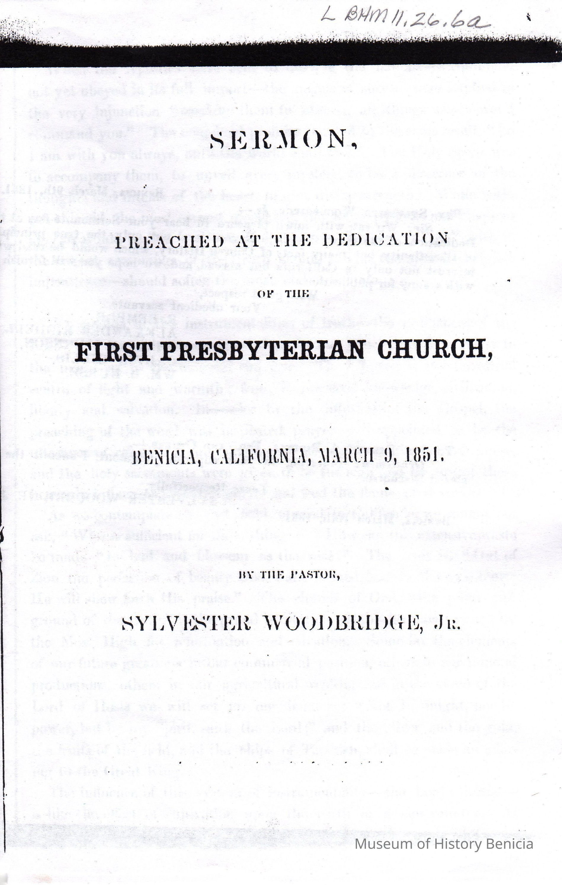 Sermon, preached at the Dedication of the First Presbyterian Church, Benicia, California, March 9, 1851, by the Pastor, Sylvester Woodbridge, Jr.Entry/Object ID