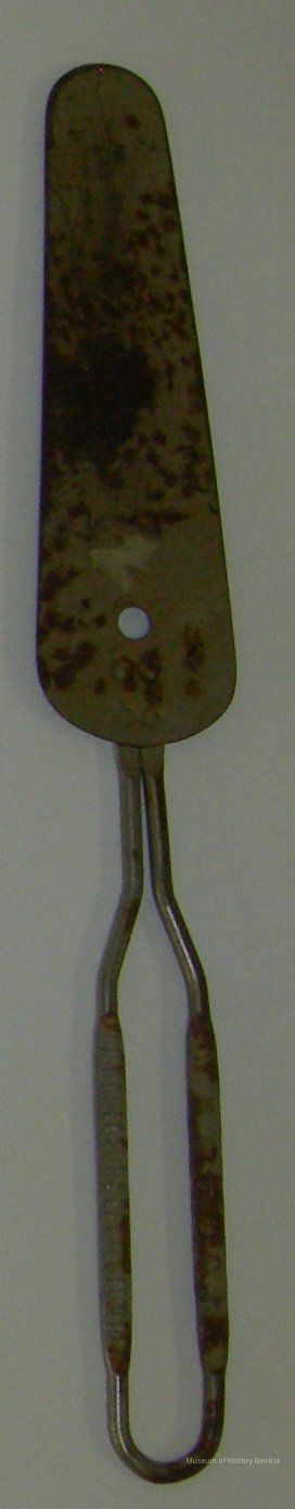 all metal pie (or cake) server; on split handle: "Rumford The Wholesome Baking Powder" flat part is rounded-wedged shaped