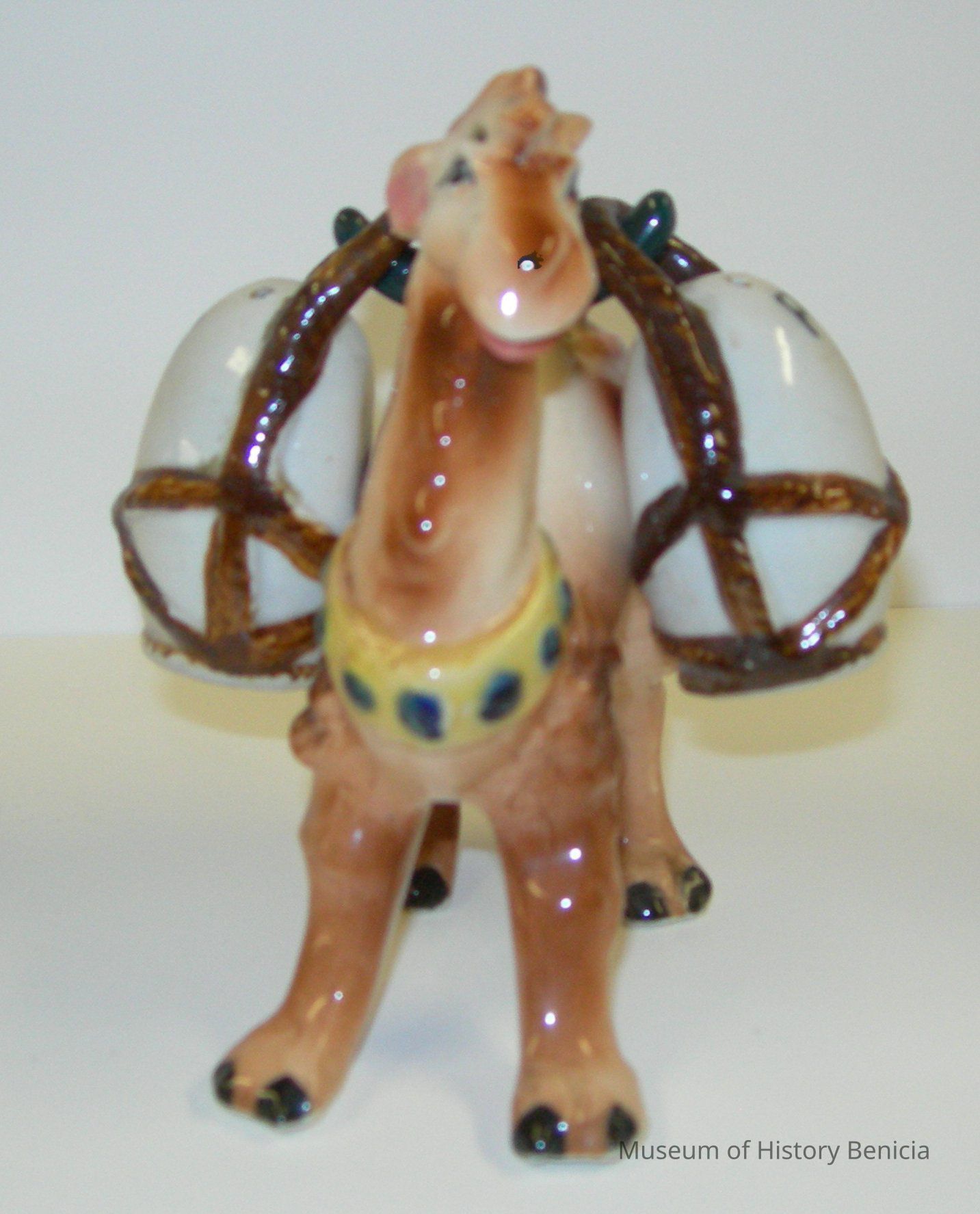 glazed ceramic camel with two shakers that hang on hooks of a "saddle"
