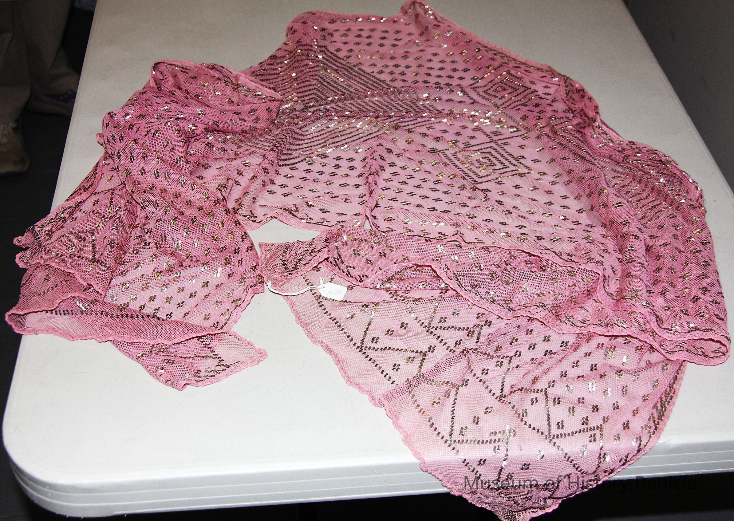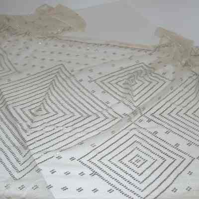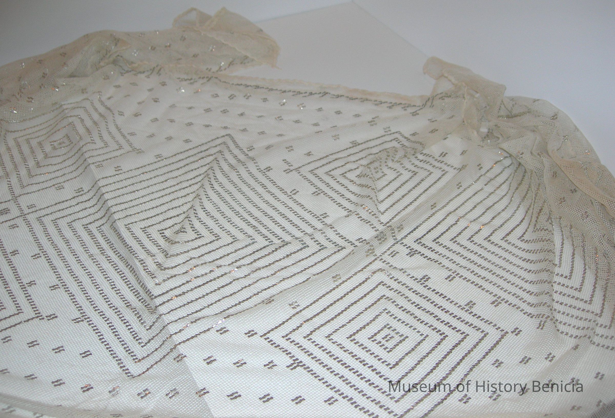 rectangular, ecru, lace netting shawl with small metallic adornments, concentric squares embroidered design (look like diamonds), rolled edges