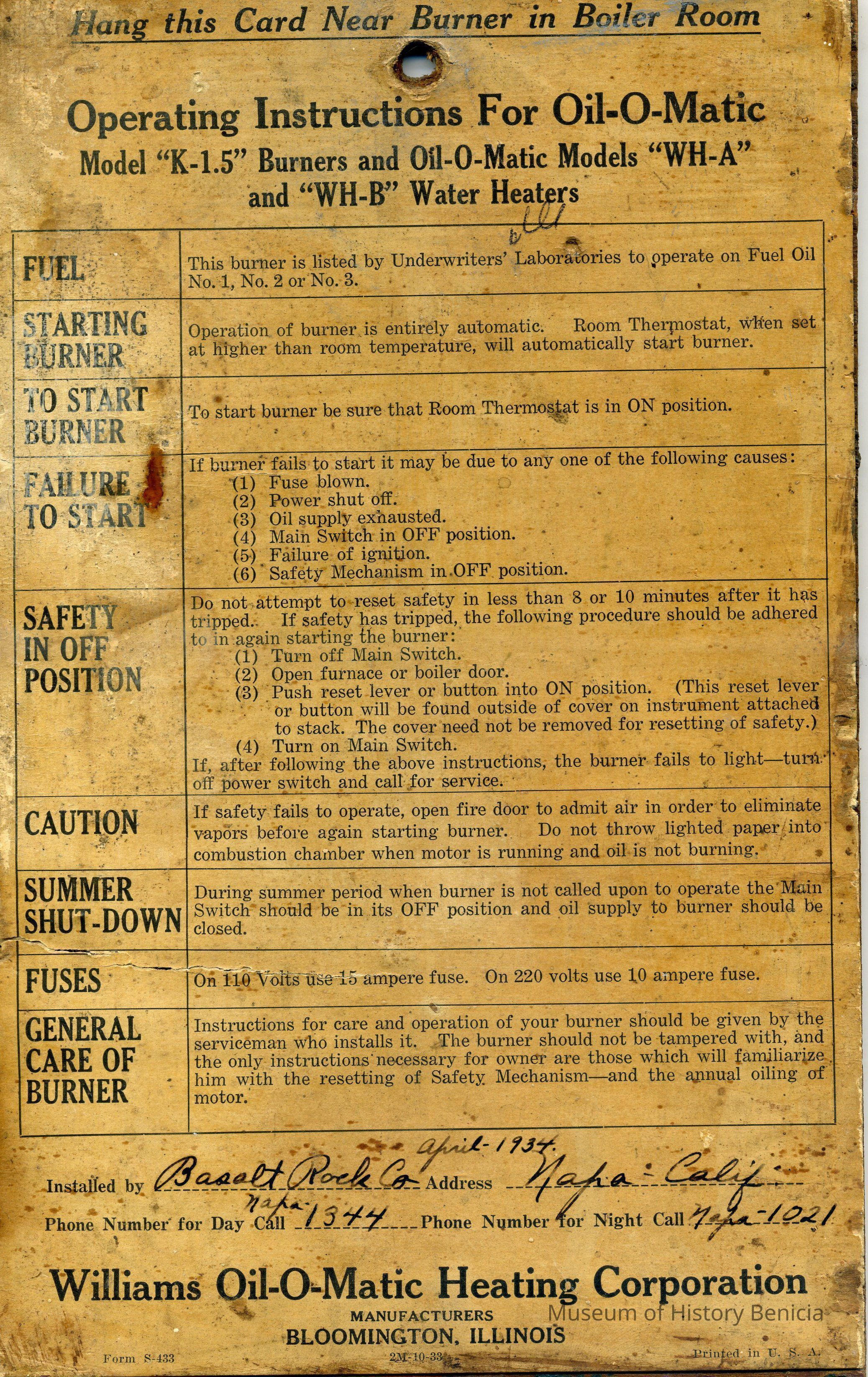 At top: Hang this Card Near Burner in Boiler Room