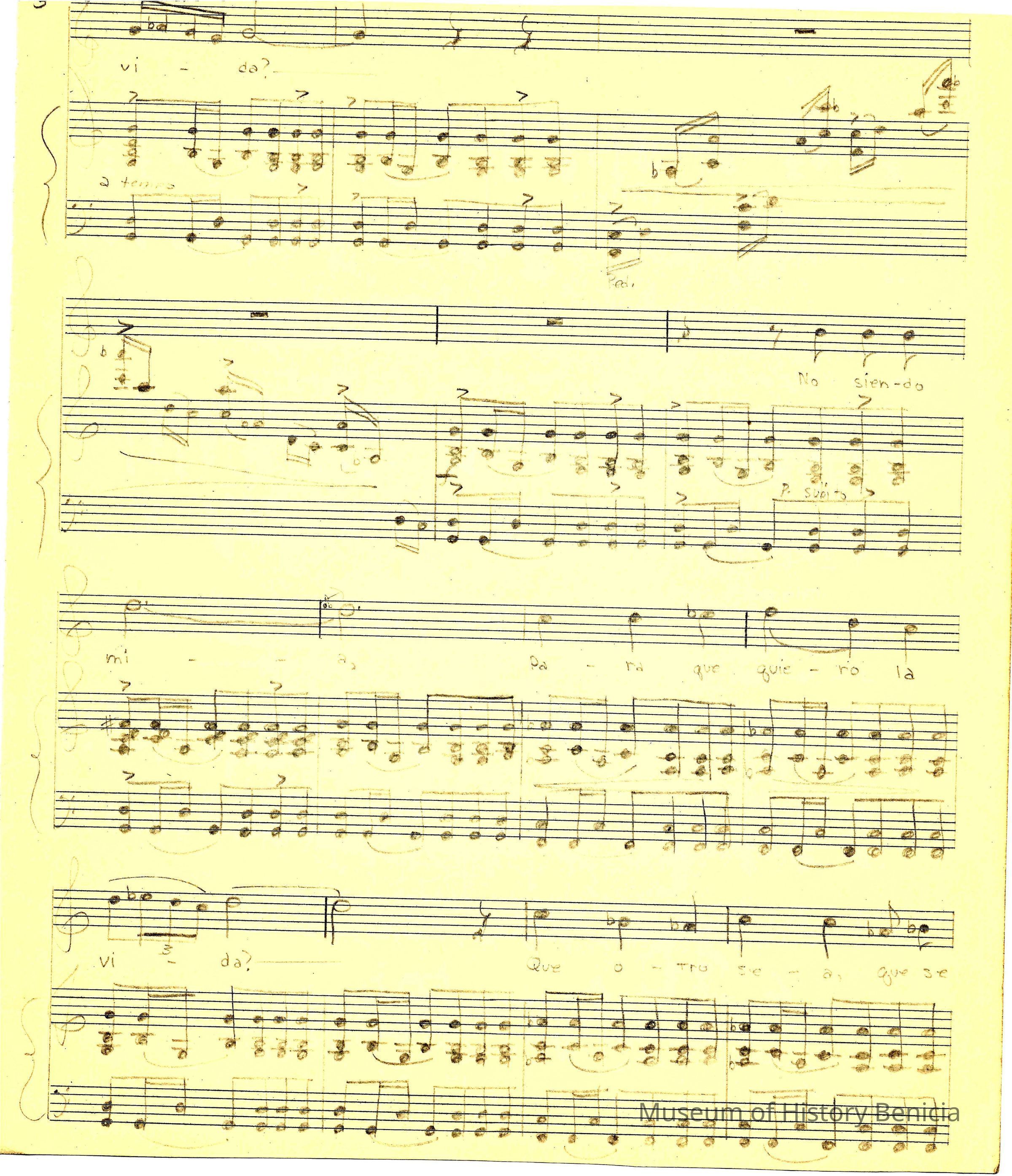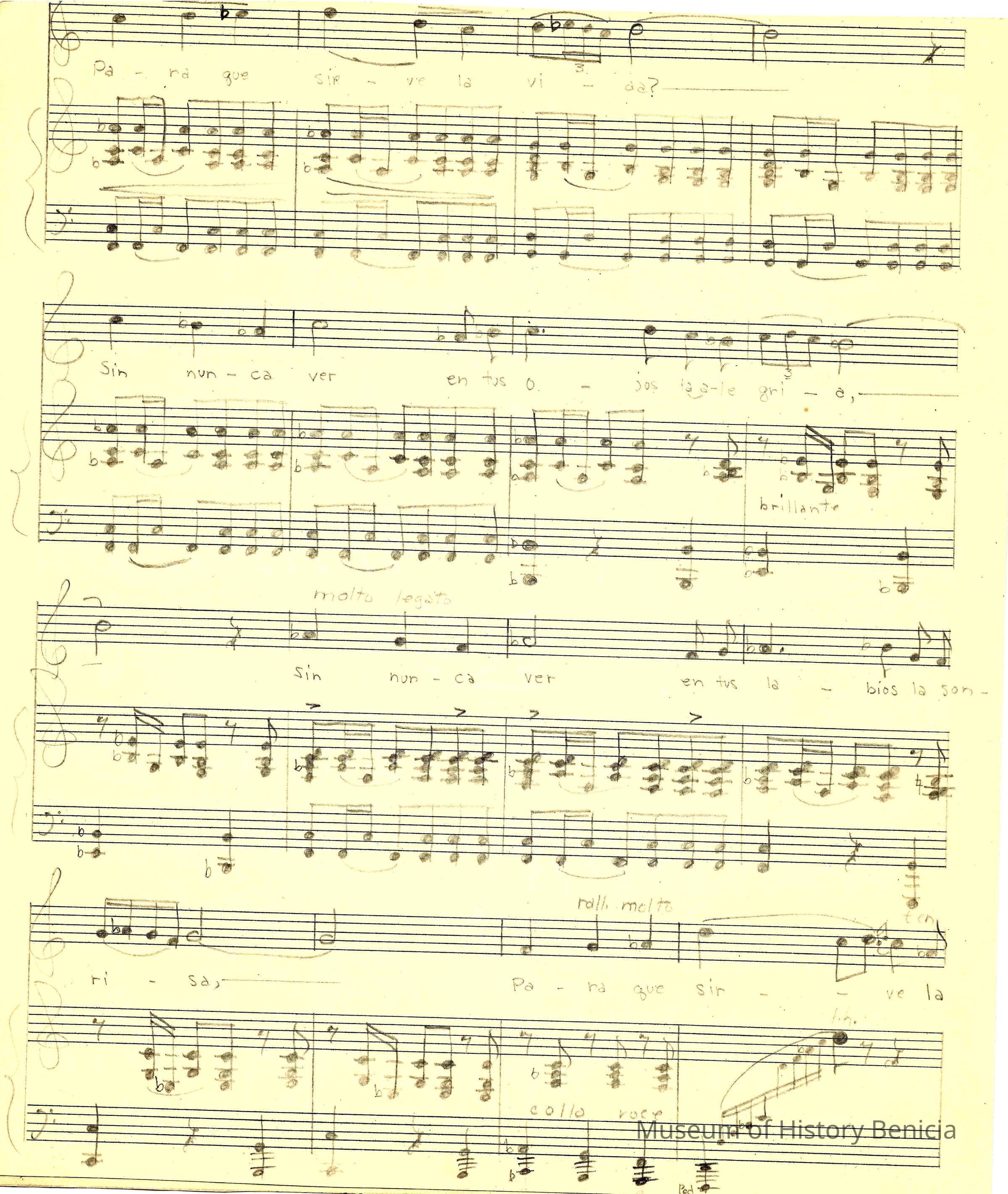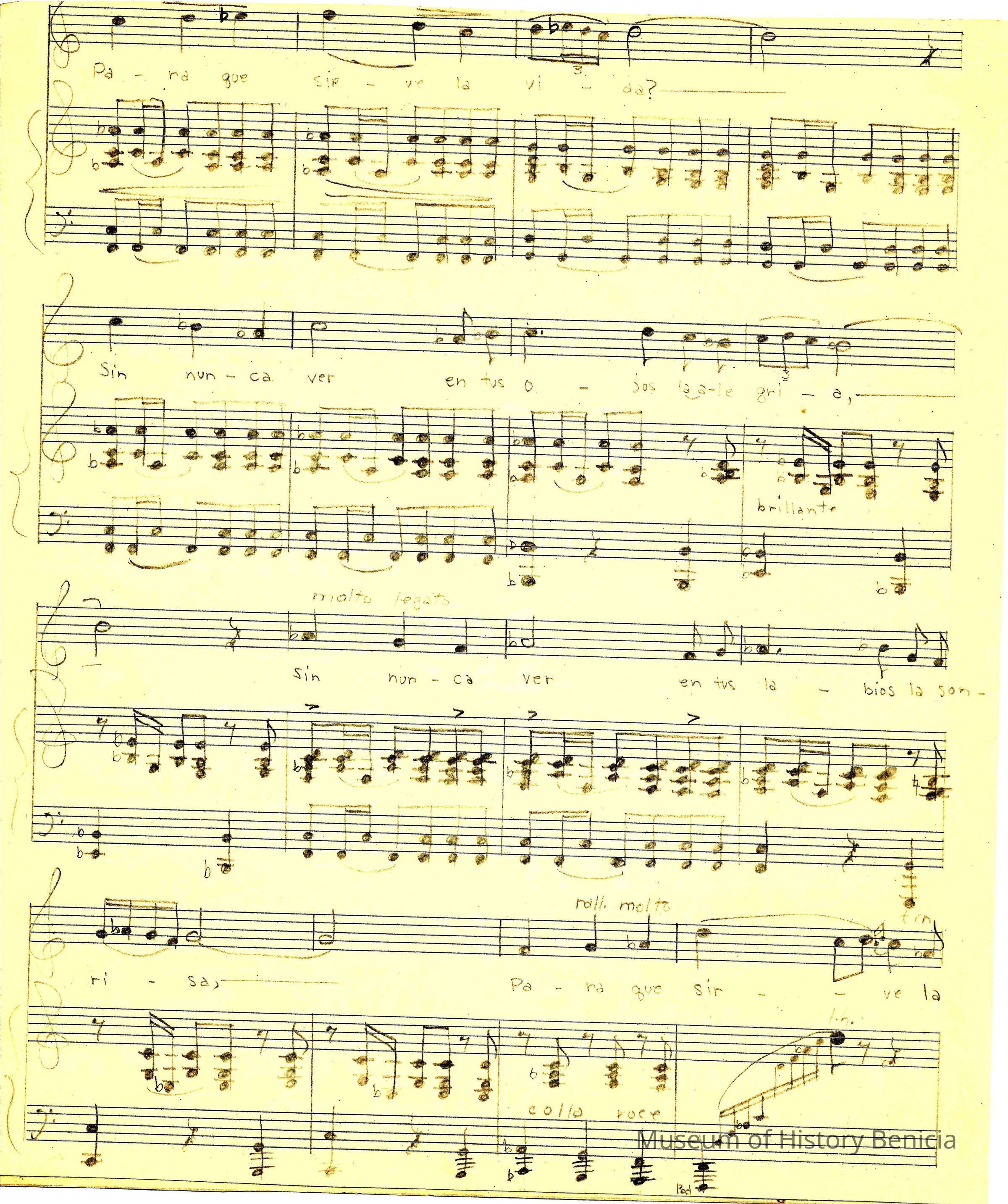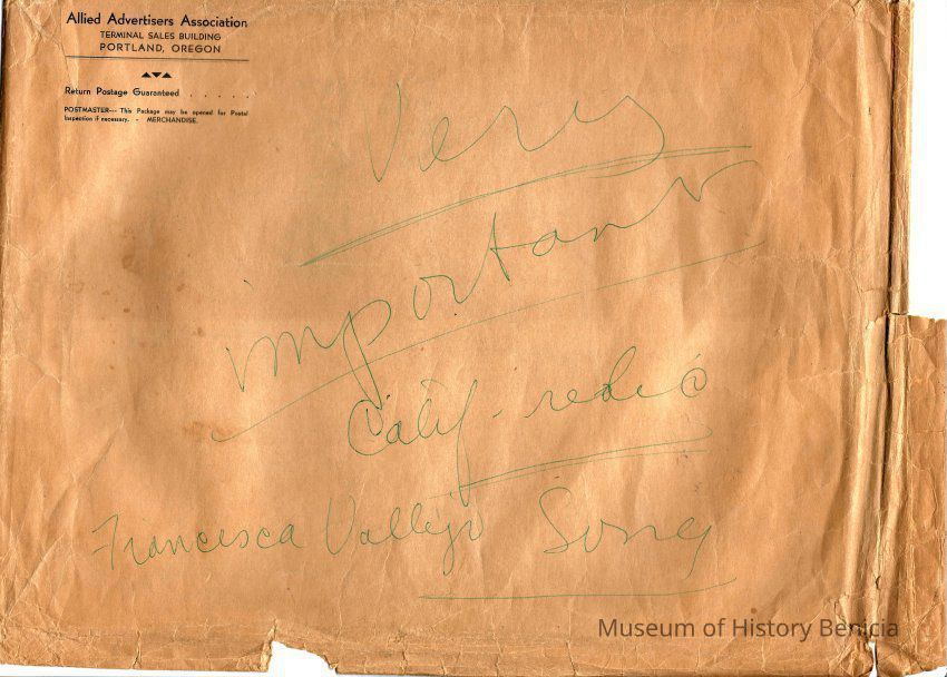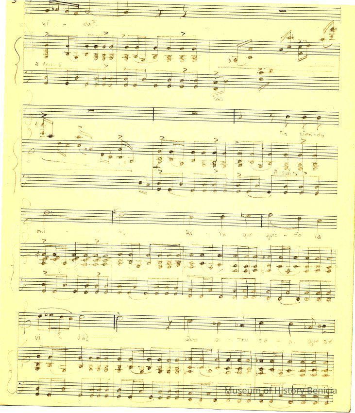 The sheet music was kept in an envelope that was owned by Violet Molfino (daughter of John Molfino early Benicia barber and photographer). She felt they were "very important"