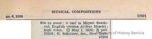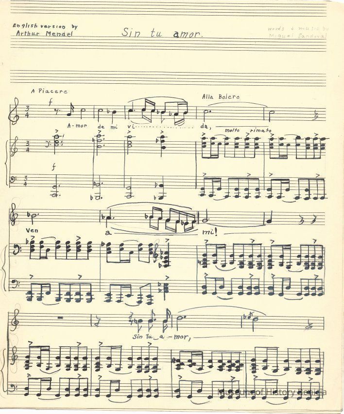 Sheet music of song " Sin tu Amor". The music and words were written by Miguel Sandoval and translated by Arthur Mendel. The work was copyrighted in 1936 (see attached).