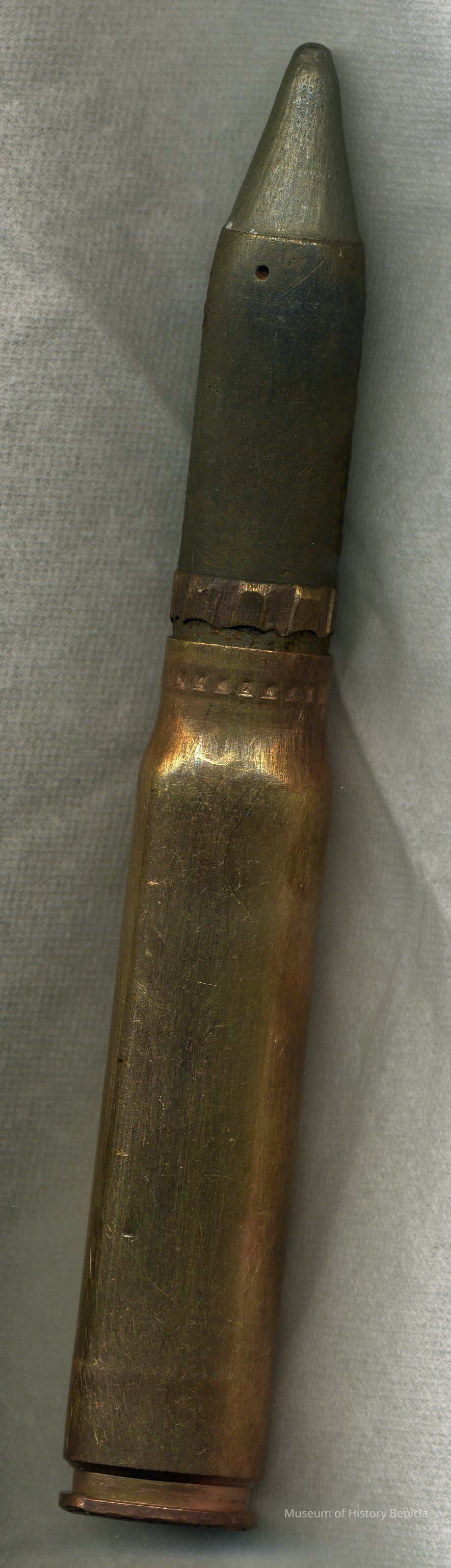 Shell casing, brass, with pointed projectile, no markings on bottom; 7-1/4" long x 1" diameter