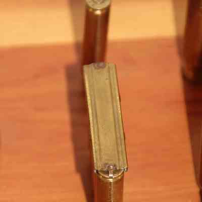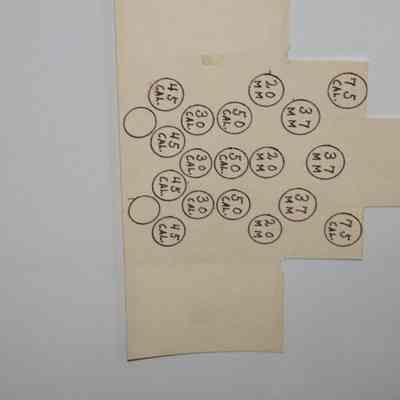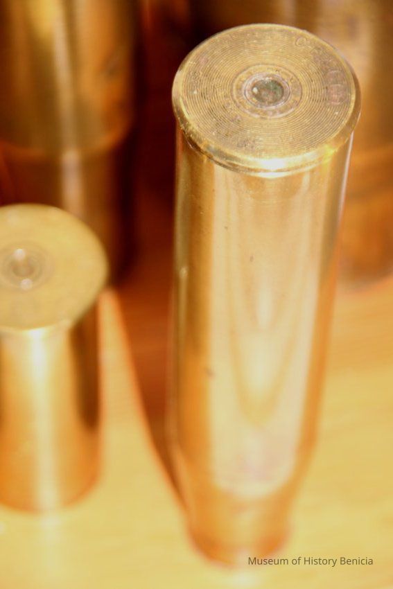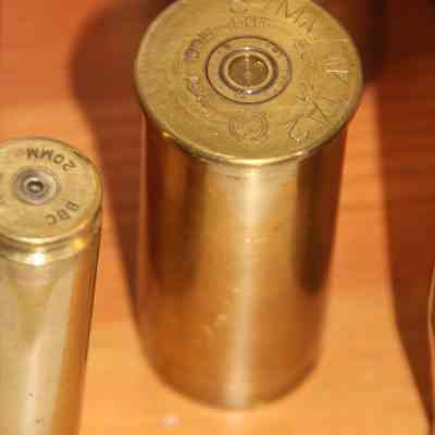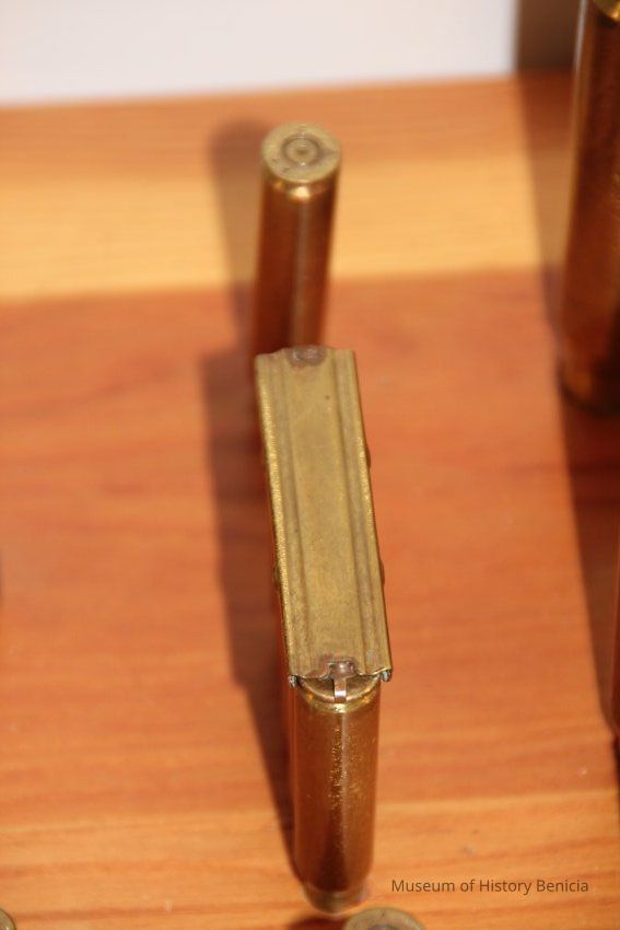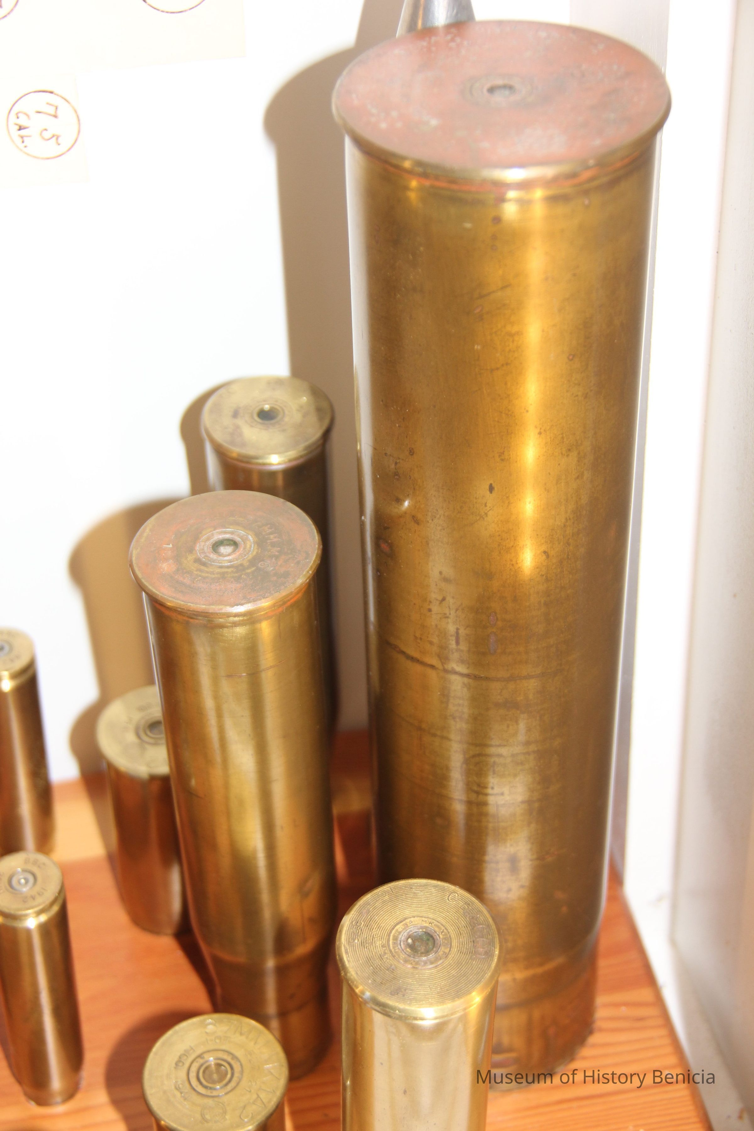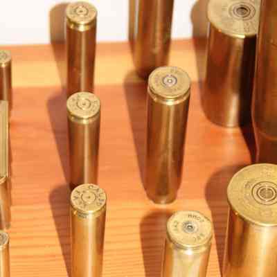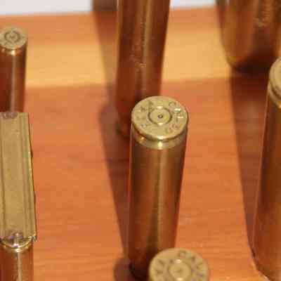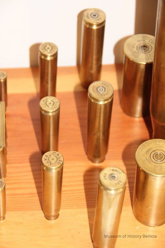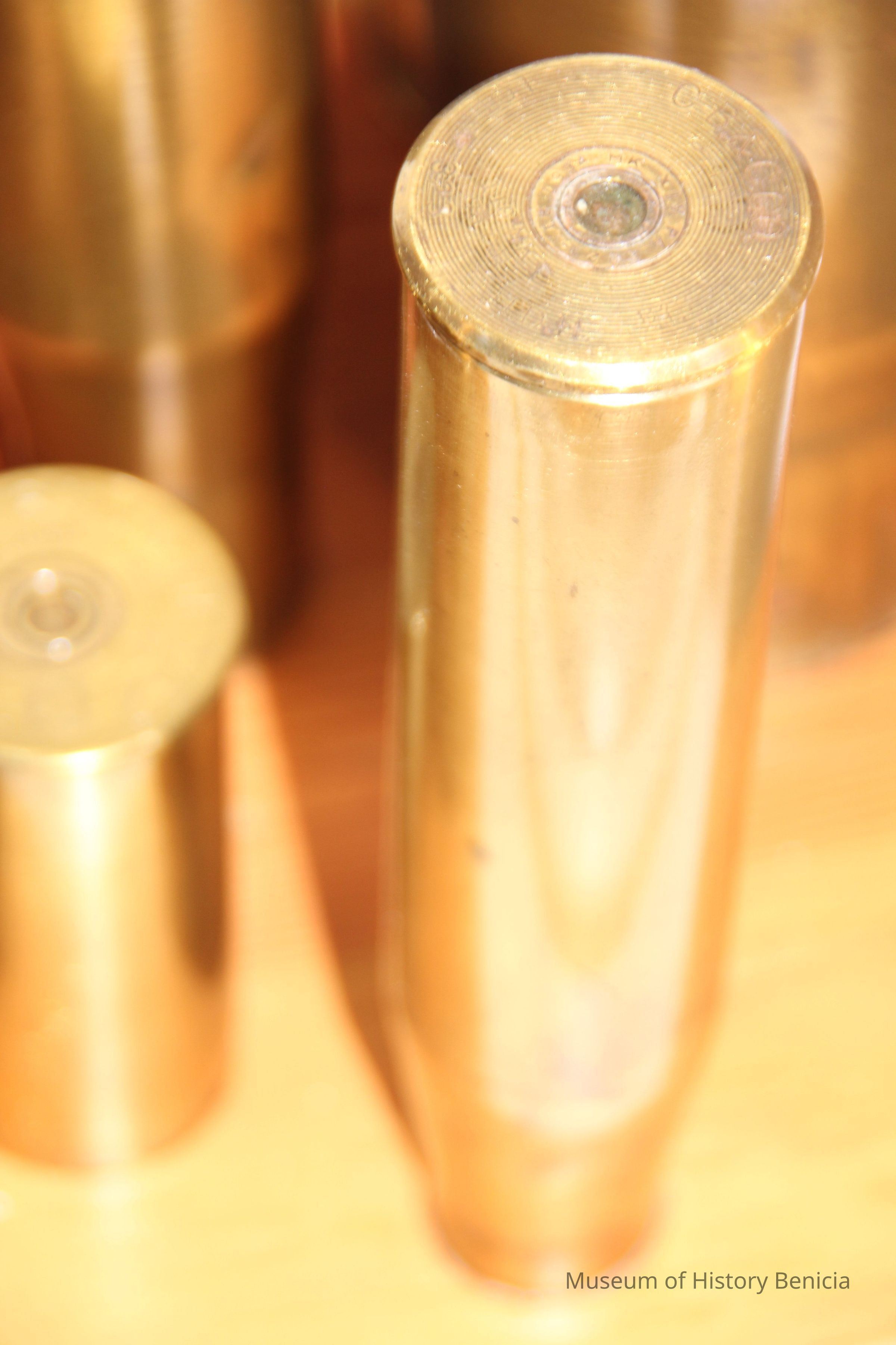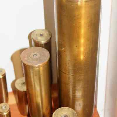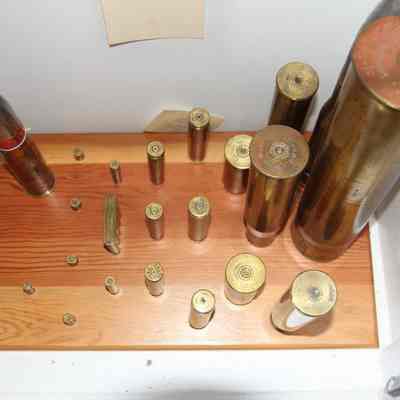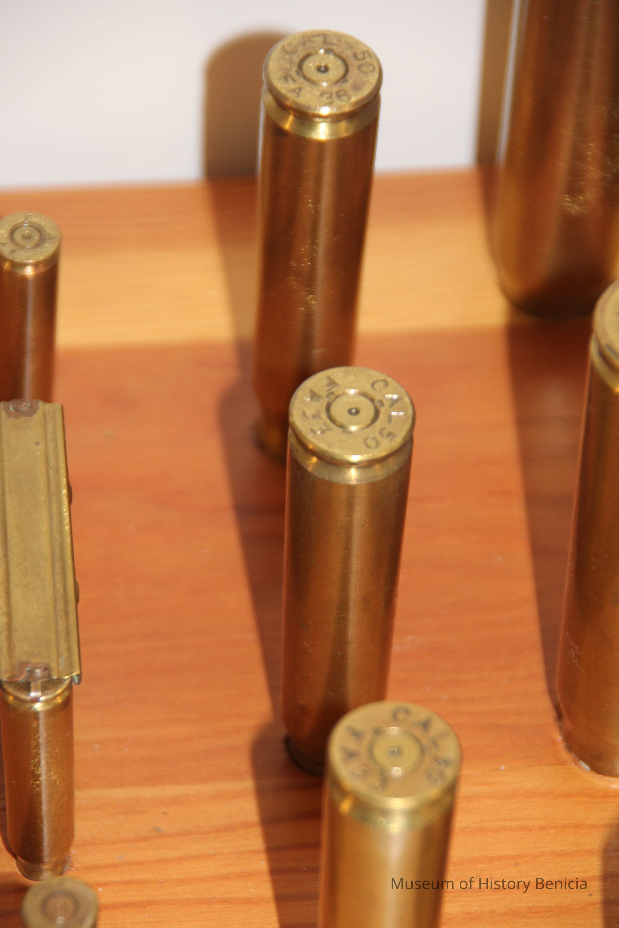 21 brass shell casings of various sizes displayed on a 11.25 by 23.75 inch board base