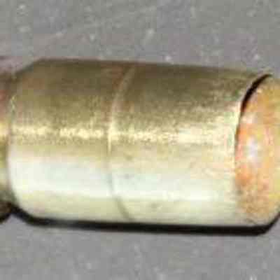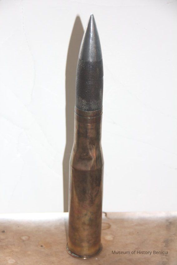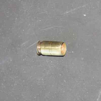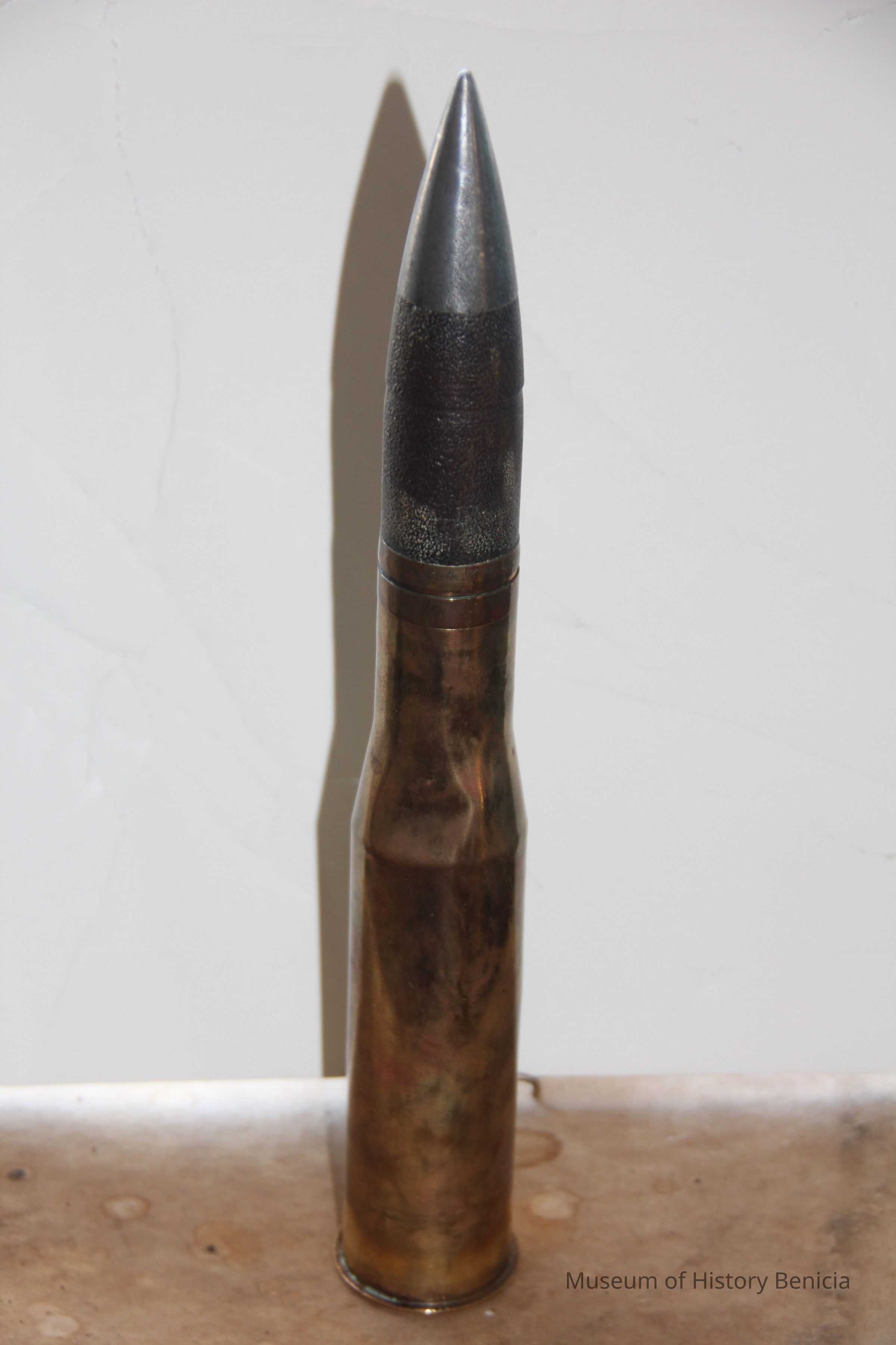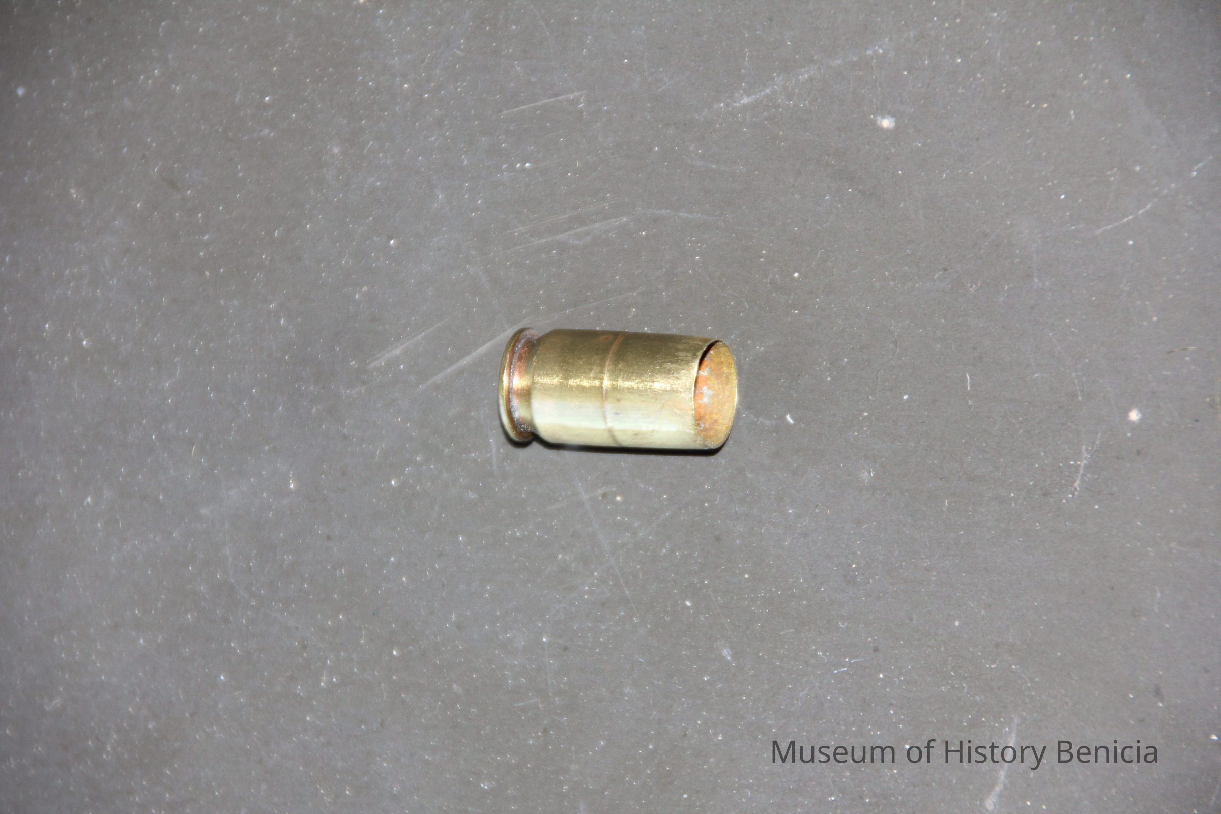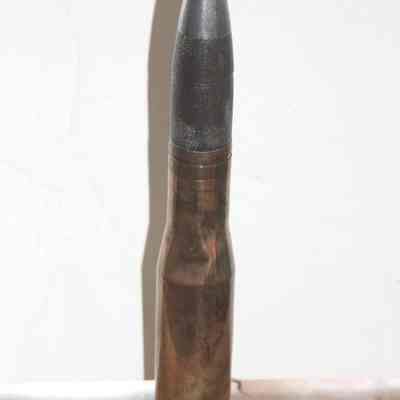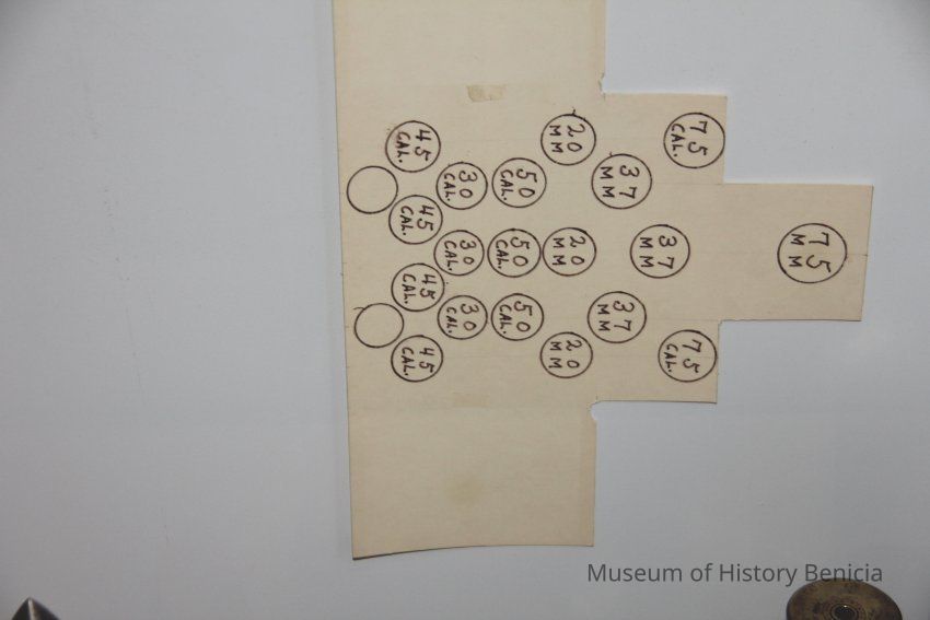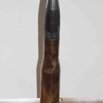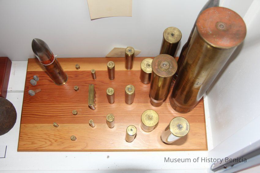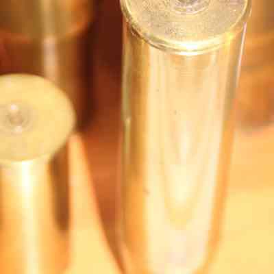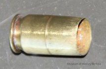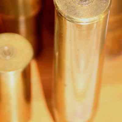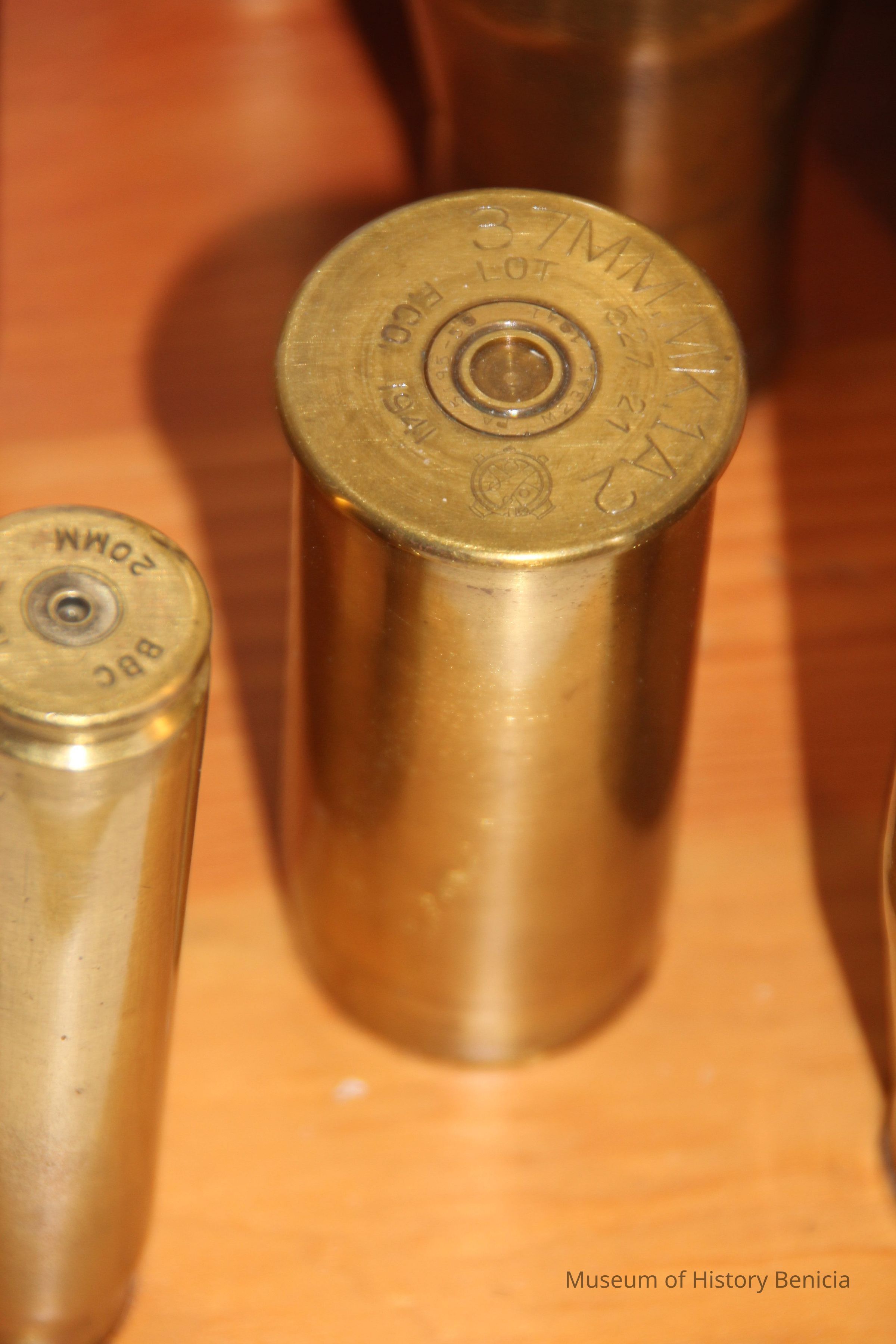 21 brass shell casings of various sizes displayed on a 11.25 by 23.75 inch board base