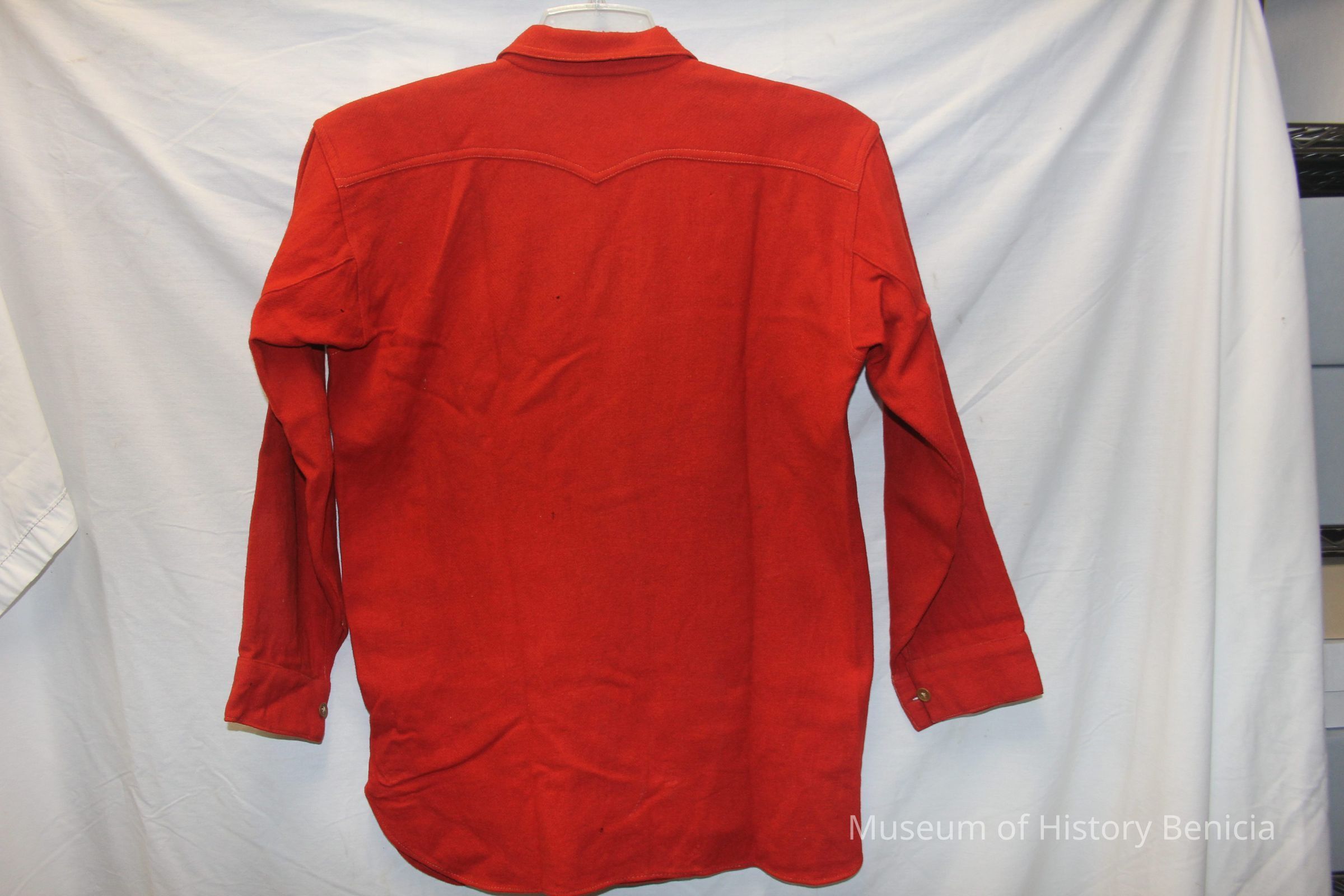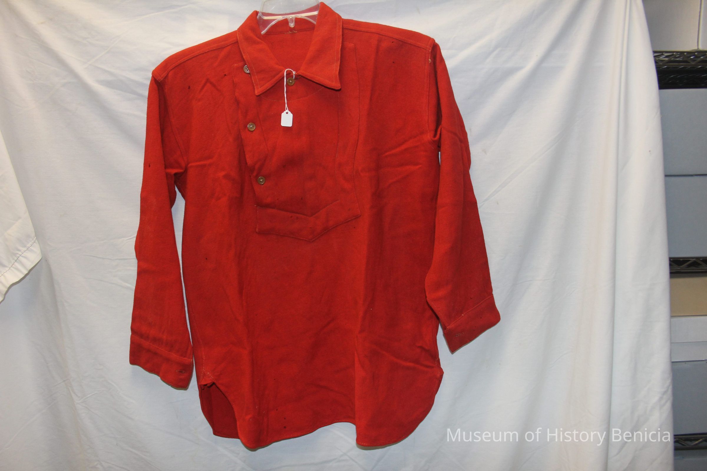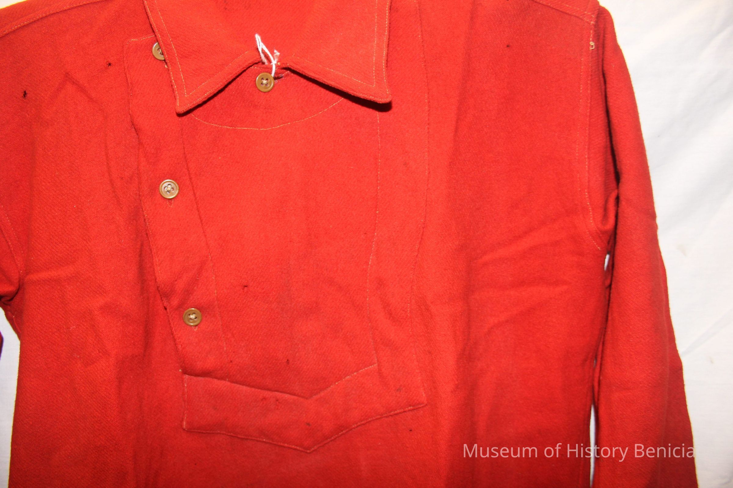 Heavy Red Wool Benicia Fire Dept Shirt - missing all of its original buttons - existant buttons are replacements - Referenced as to having been used in the 1930s but that has not been substanciated yet.Collection