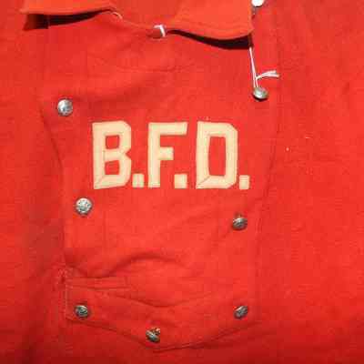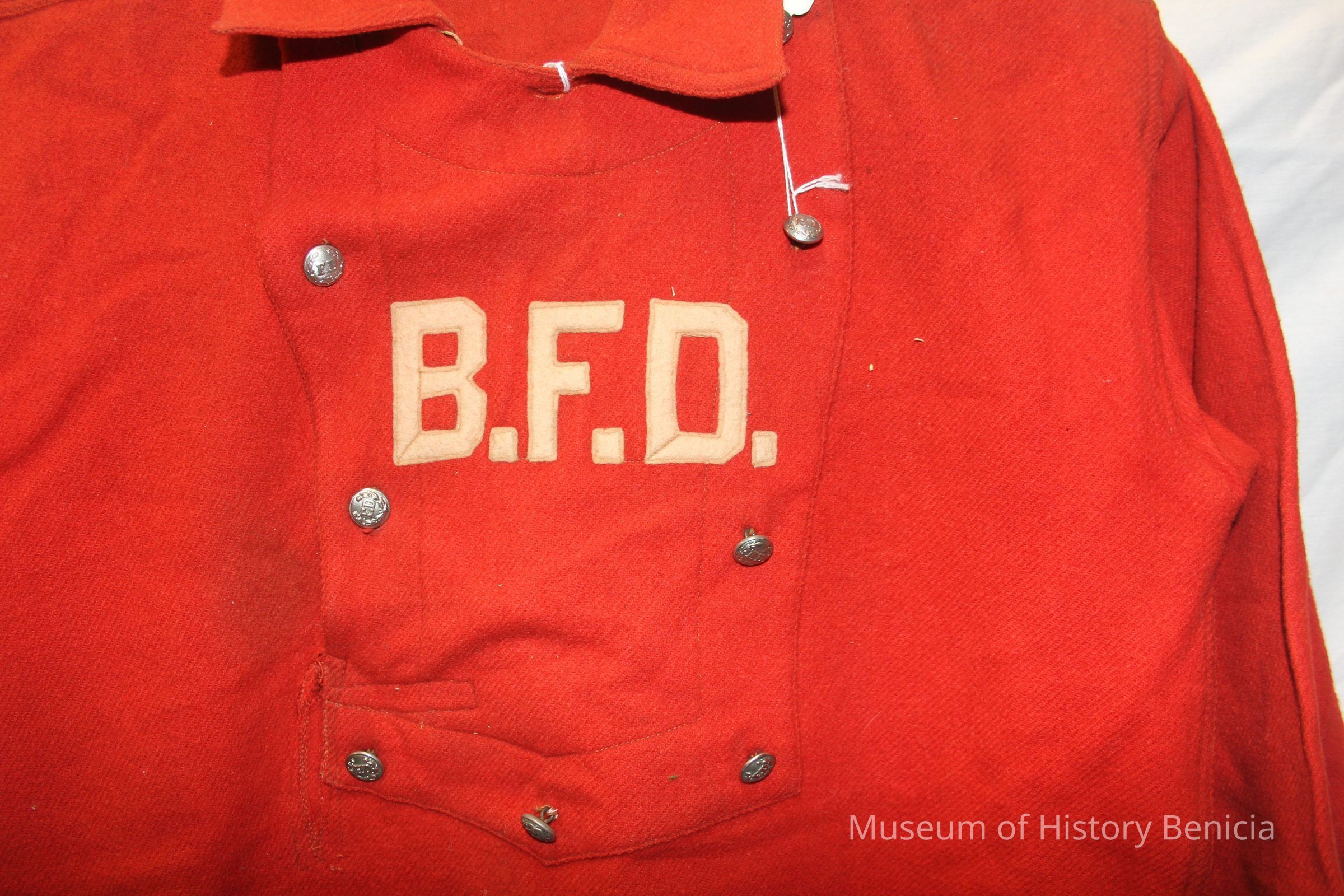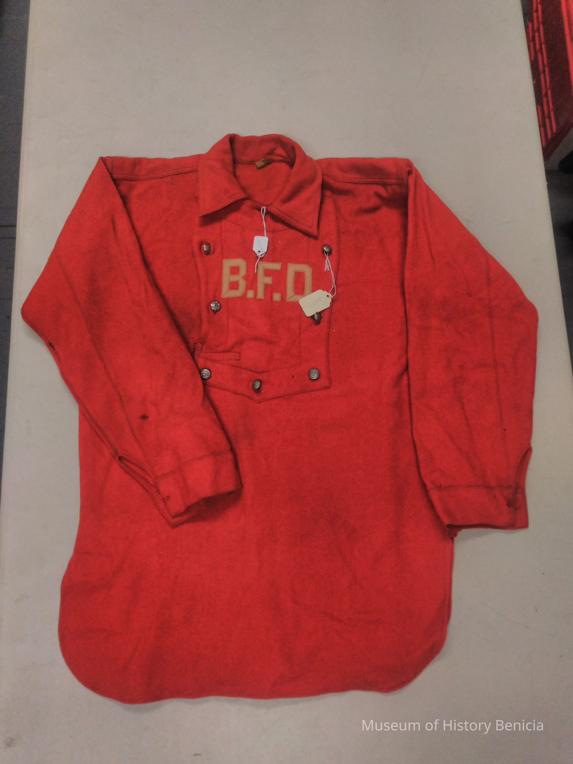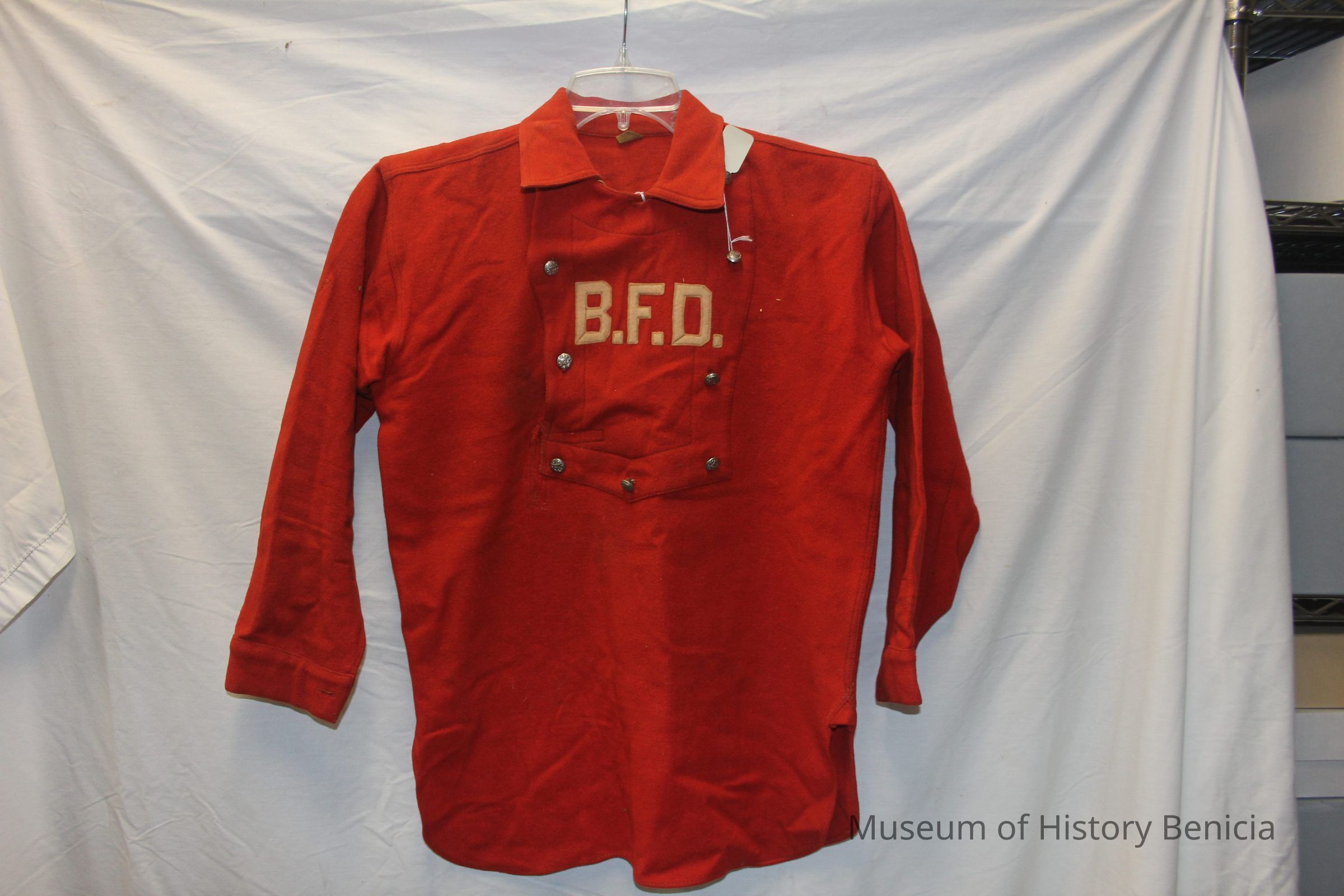 Red Wool Benicia Fire Dept Uniform Shirt - Identified as having been used in the 1930s but that has not been substanciated yet. 9 Silver Metal FD Buttons