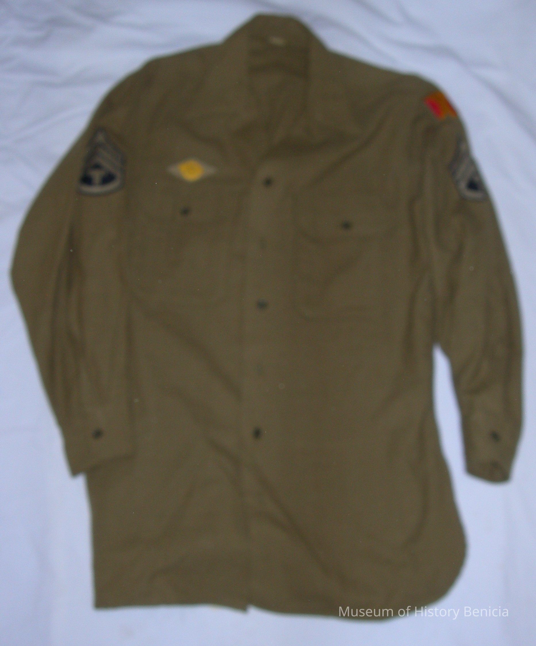 WWII US Army Shirt worn by a Techical Staff Sergeant in the Ordnance Department. The red and gold patch on the upper left sleeve indicates service in the Panama Canal Zone in WWII. The rating badge on both sleeves indicates the person is a Technical Sergeant.