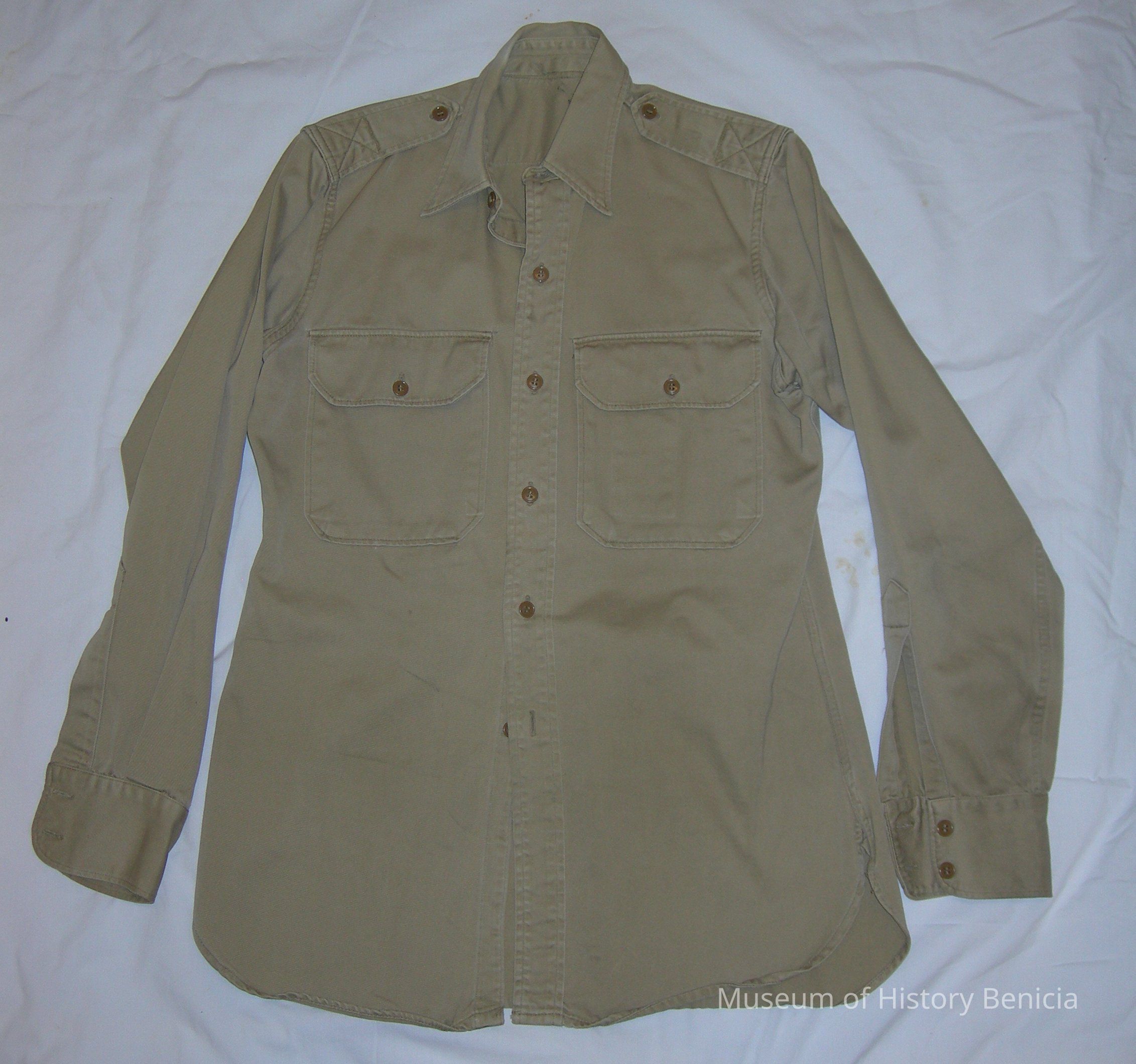 WWII US Navy Shirt - upper part of a uniform of an Electrician's Mate, Chief Petty Officer (E-7) Construction Battalion (Seabees). There are no patches or rating badges on the khaki garment. Has brown buttons, button flap pocket on each breast, two buttons on each cuff, one button on each shoulder epaulet.Collection