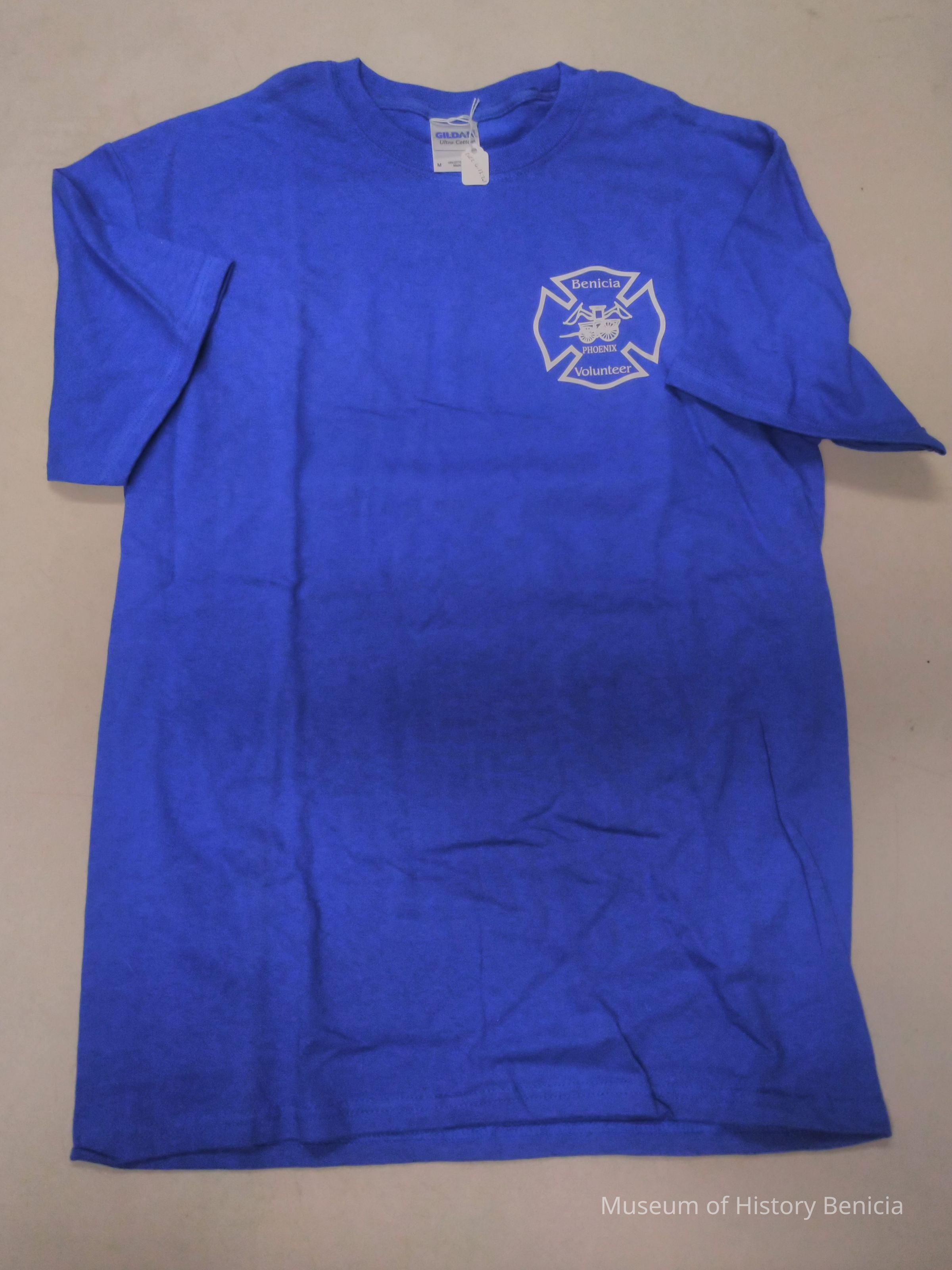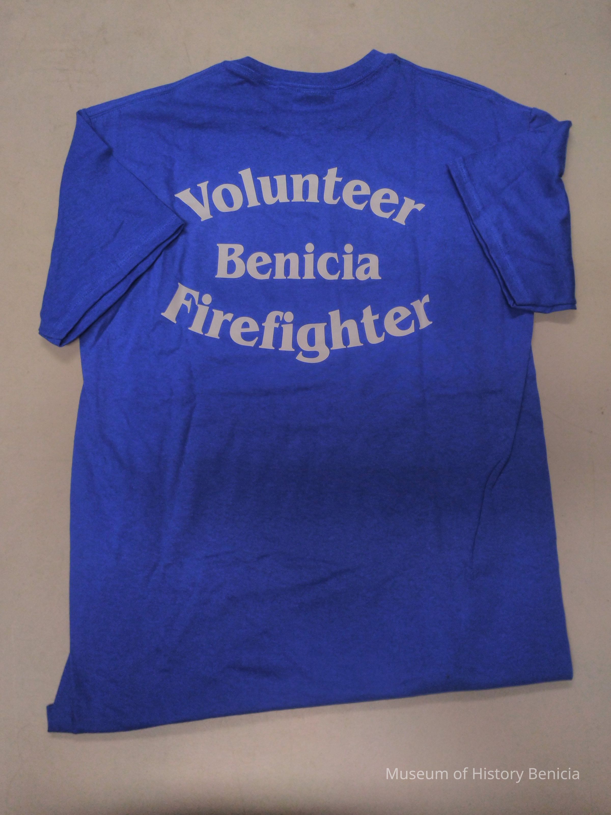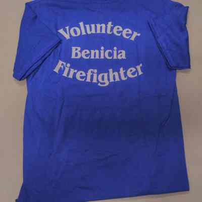 Blue Benicia Volunteer Firefighter T-Shirt with White Lettering on front corner and back center