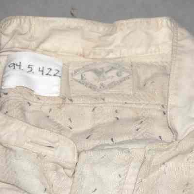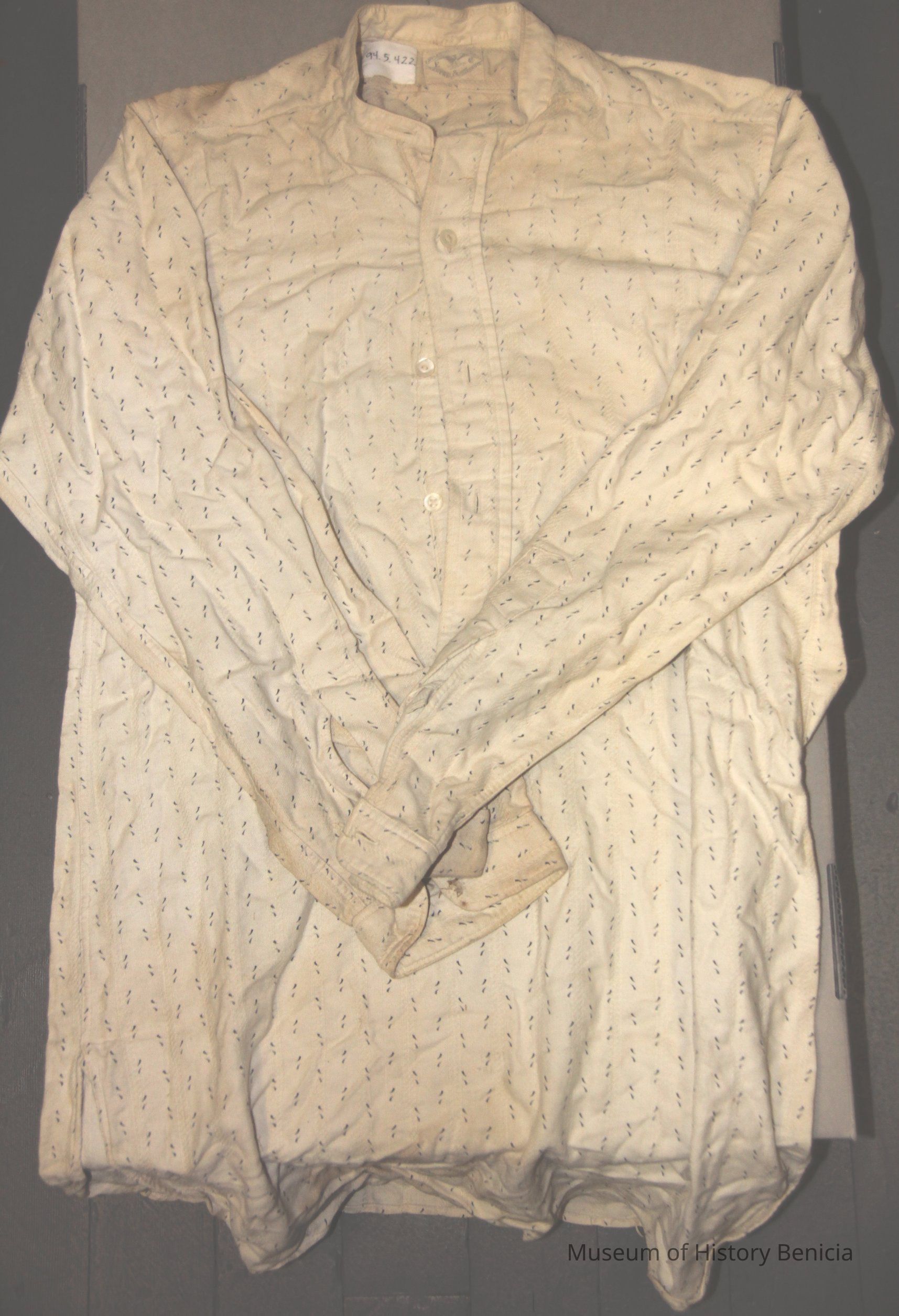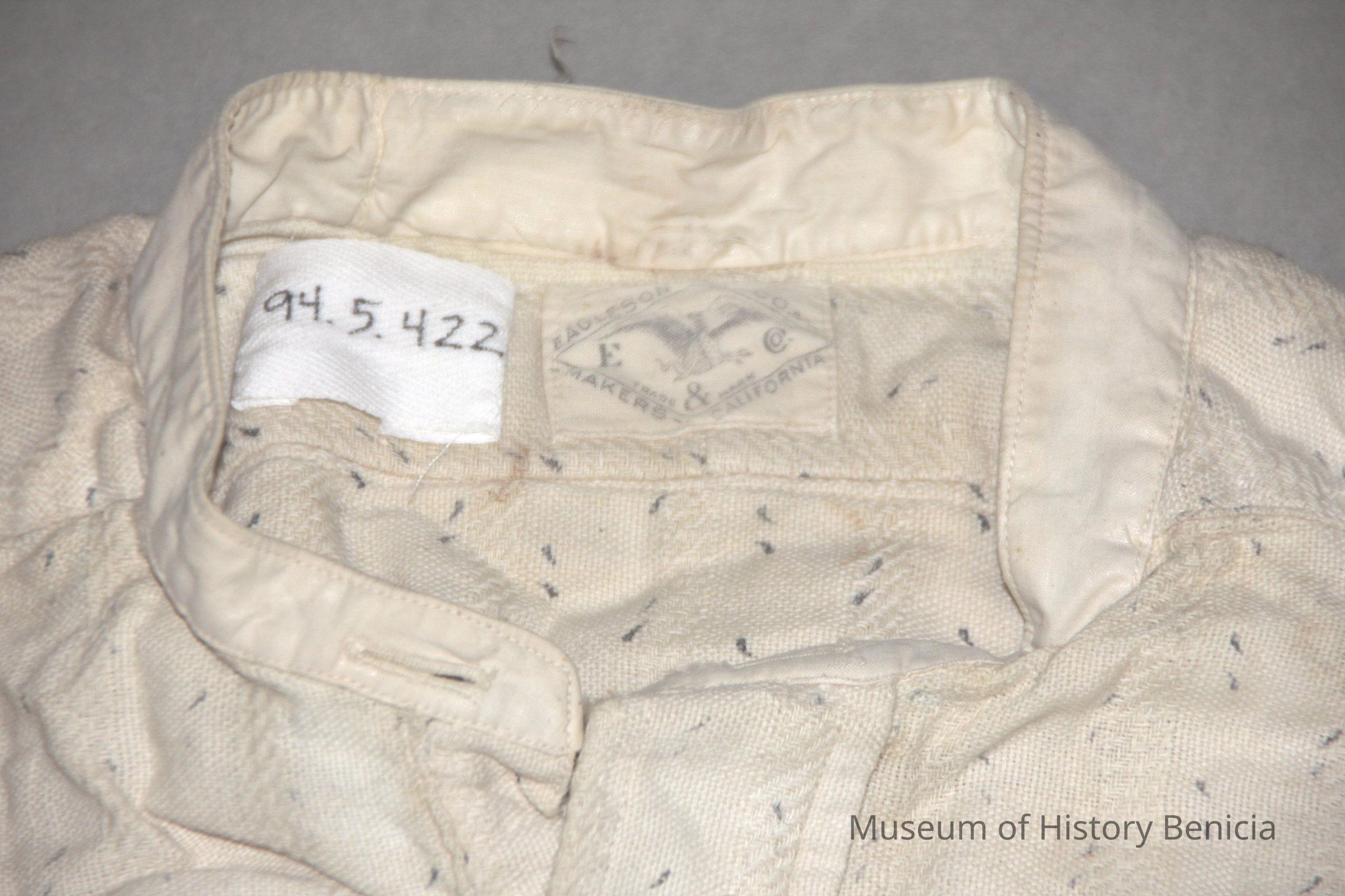 natural linen (?) shirt with small black print; button front; long sleeves; banded collar, label "Eagleston & Co / E&Co / Trademark / Makers California